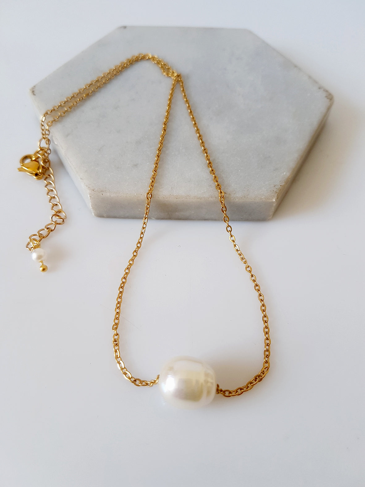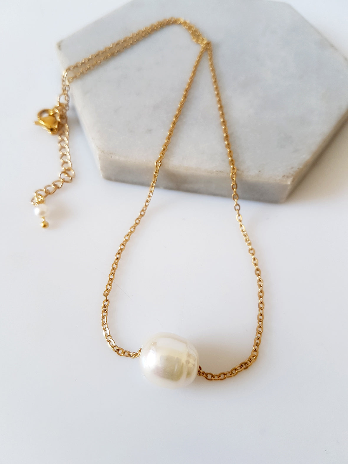 Χειροποίητο κοντό κολιέ με επίχρυση ατσάλινη αλυσίδα και ακρυλική πέρλα.