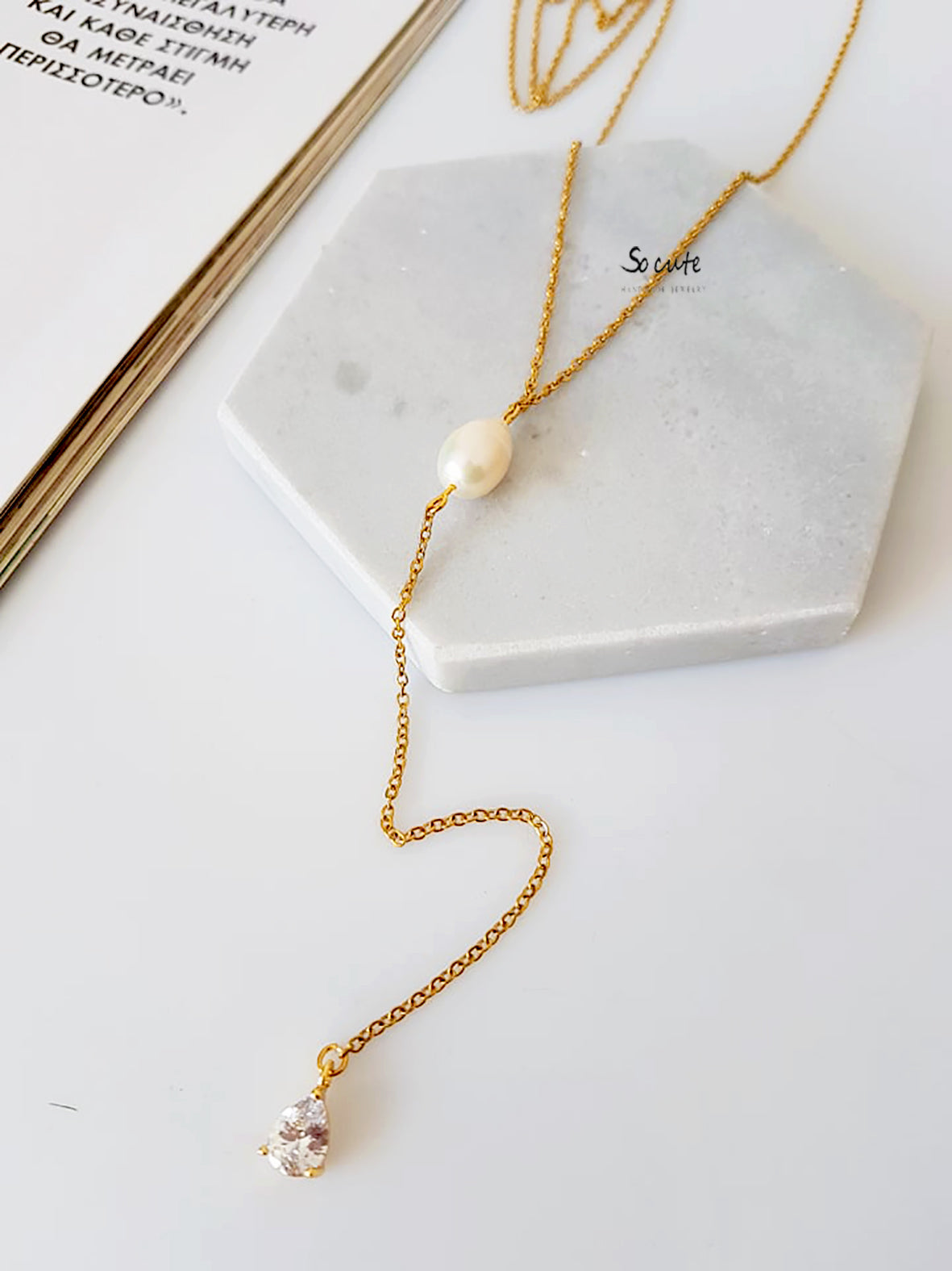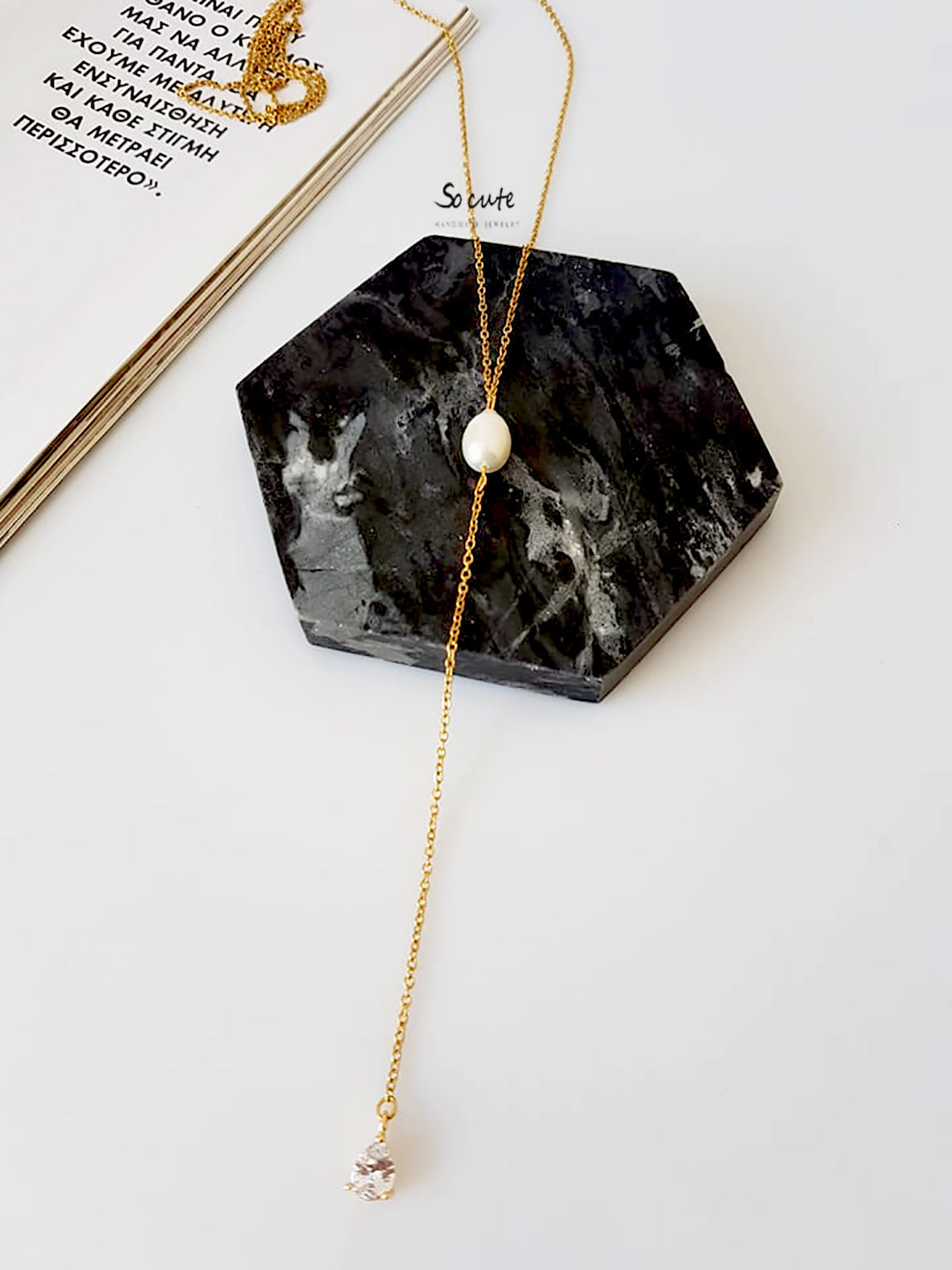Ατσάλινο κολιέ Υ με πέρλα και ζιργκόν