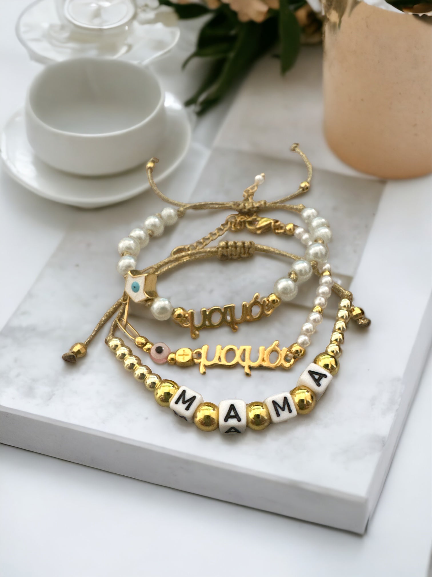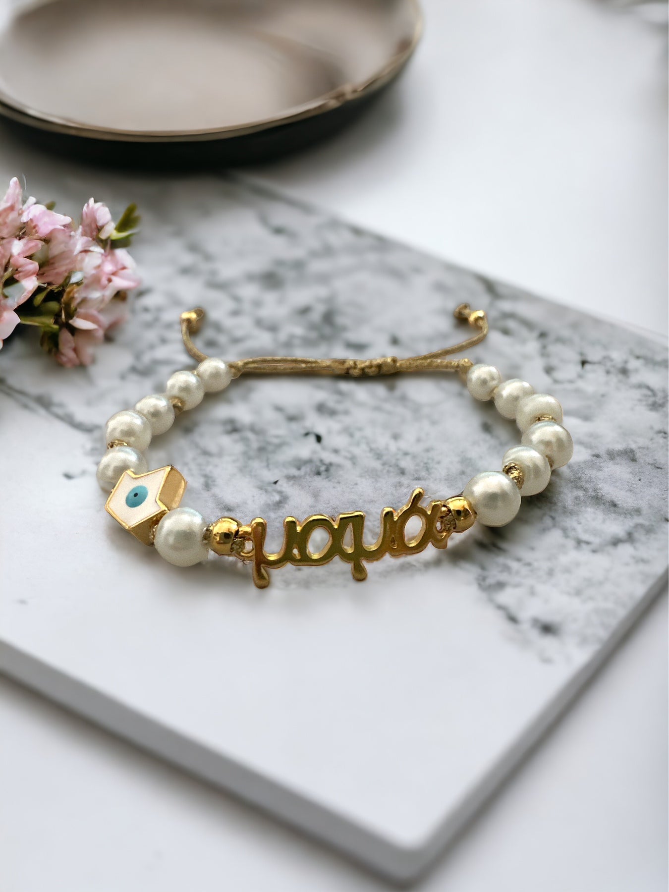 Χειροποίητο βραχιόλι για την μαμά με γυάλινες πέρλες και χάντρα καράβι με μάτι, σε μεταλλικό κορδόνι με αυξομείωση μήκους.
