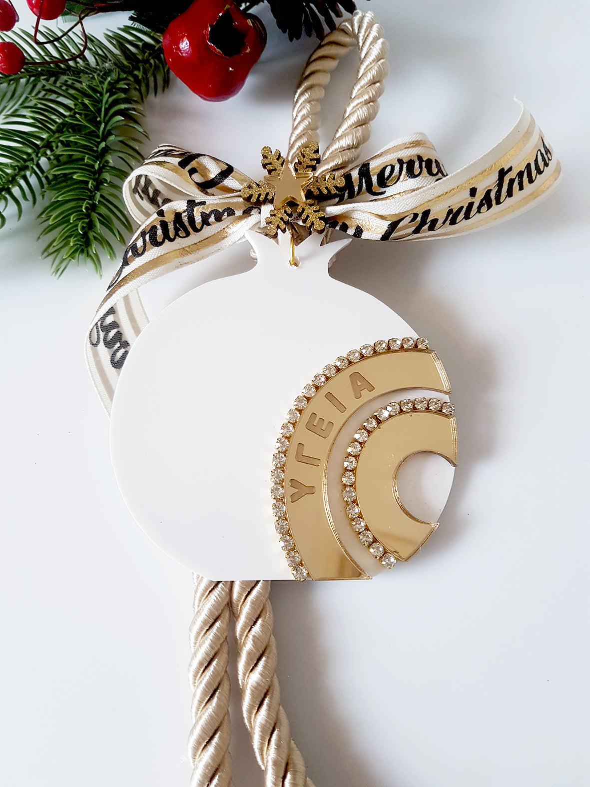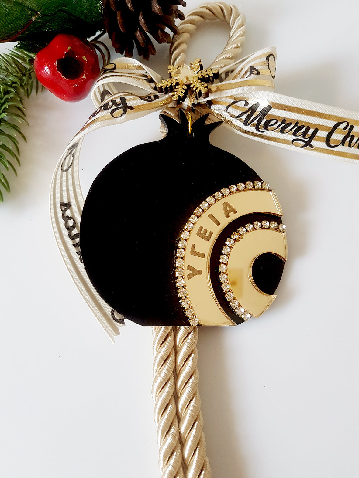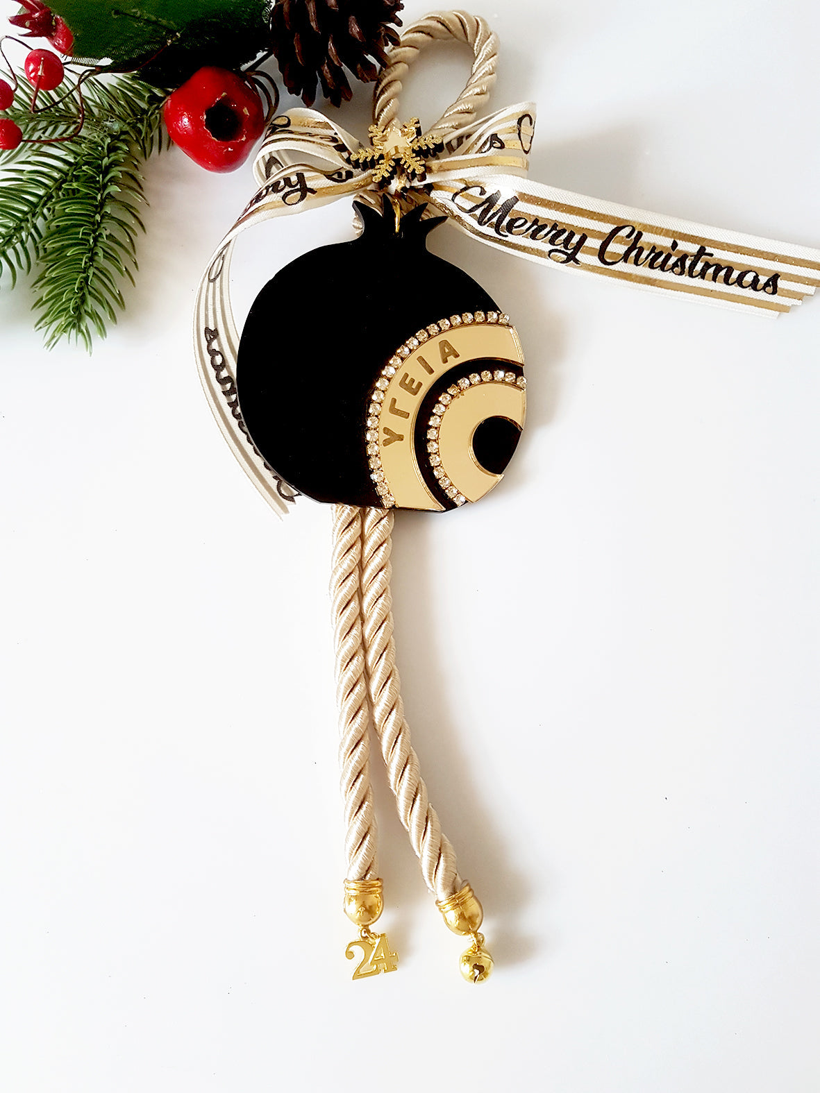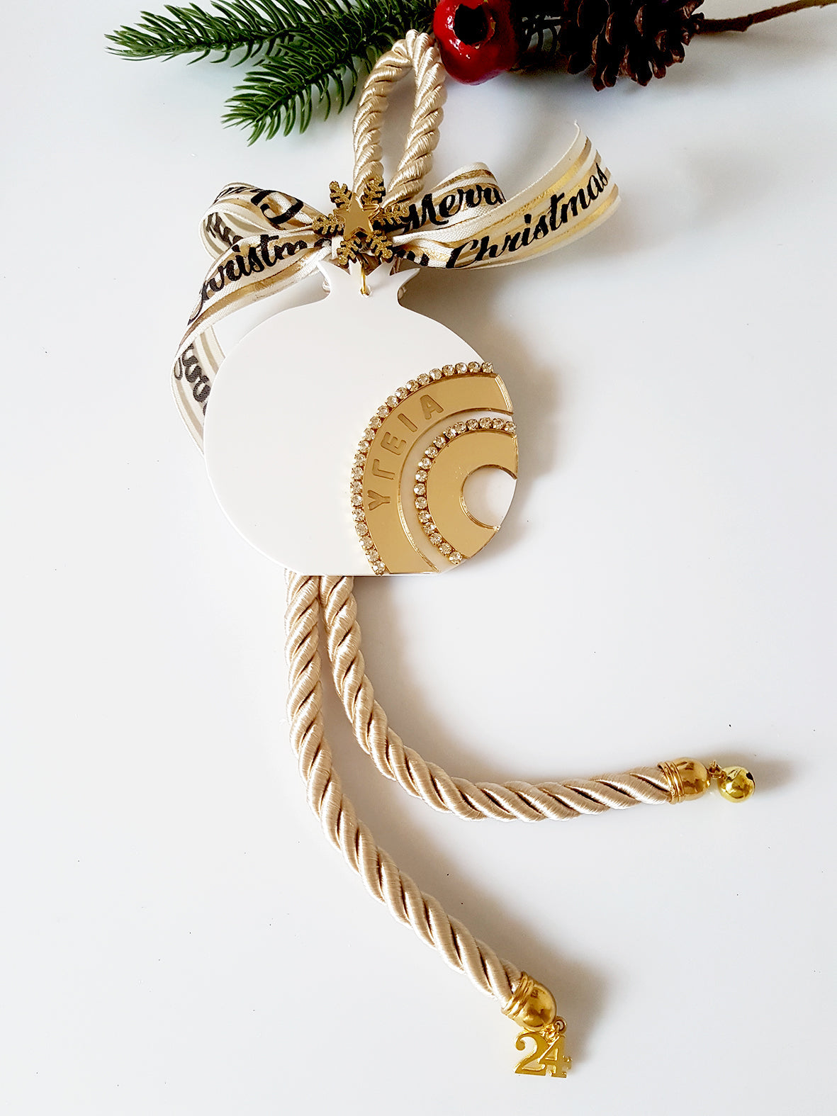 Χειροποίητο κρεμαστό γούρι με σατέν κορδόνι, κορδέλα Merry Christmas, πλεξιγκλάς ρόδι με μάτι από χρυσό πλεξιγκλάς καθρέφτη και στρας με χάραξη Υγεία και κρεμαστά charms.