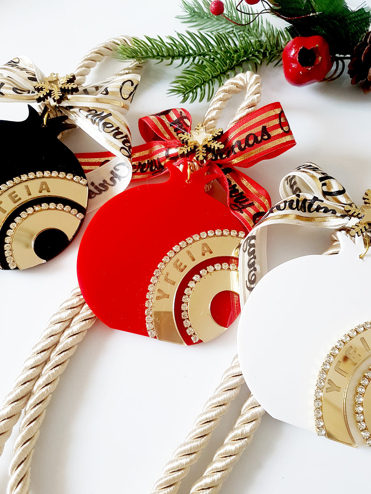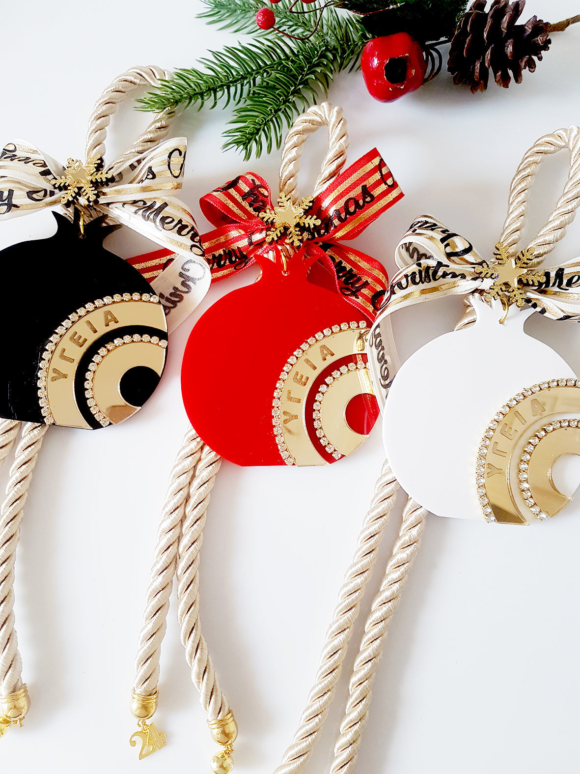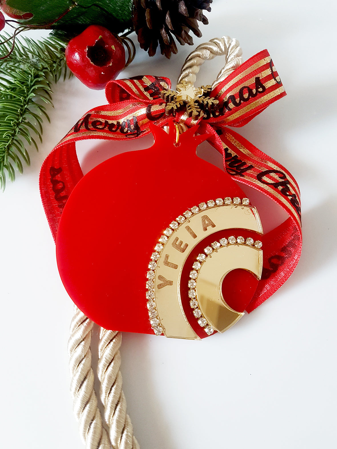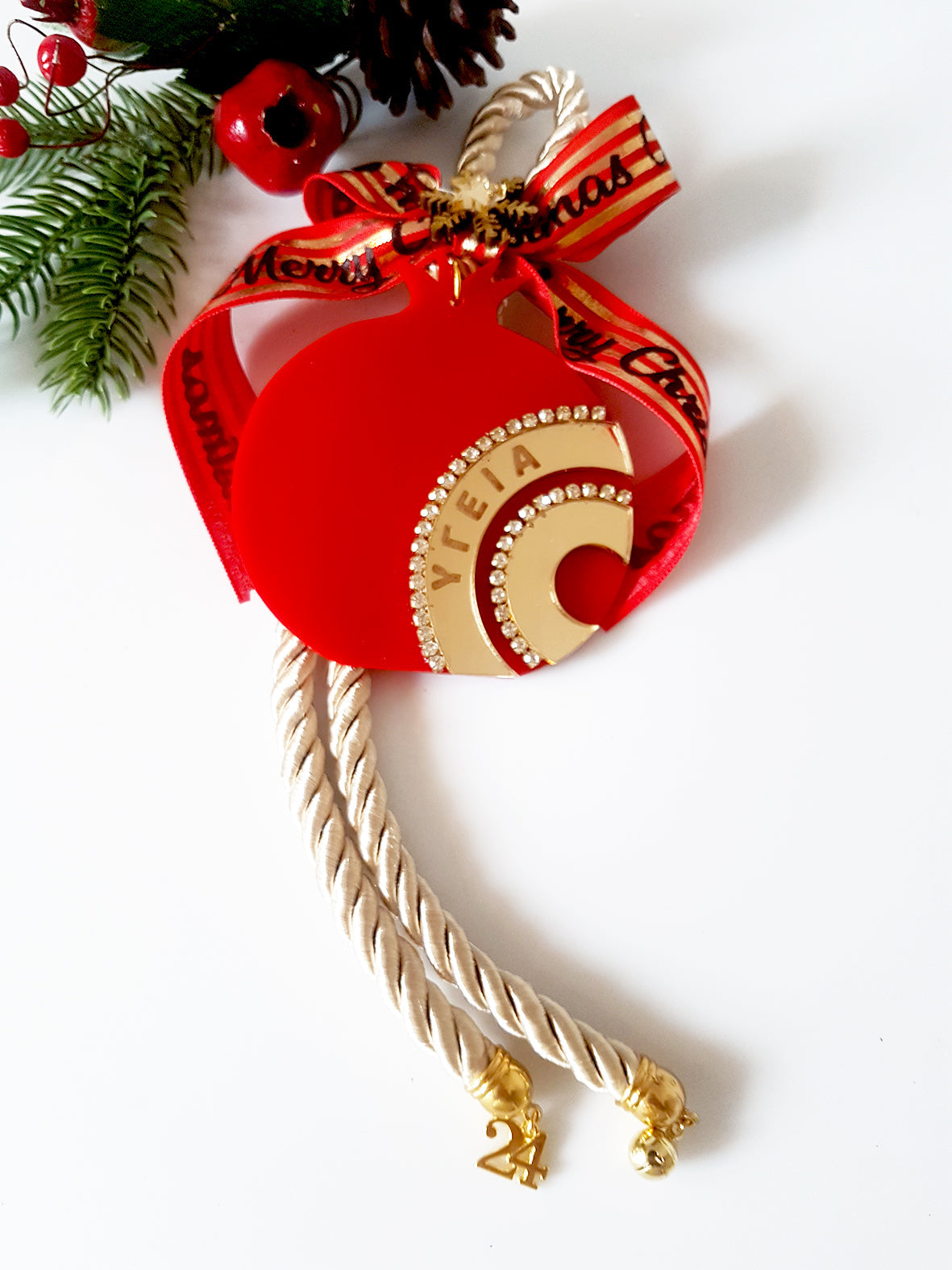 Χειροποίητο κρεμαστό γούρι με σατέν κορδόνι, κορδέλα Merry Christmas, πλεξιγκλάς ρόδι με μάτι από χρυσό πλεξιγκλάς καθρέφτη και στρας με χάραξη Υγεία και κρεμαστά charms.