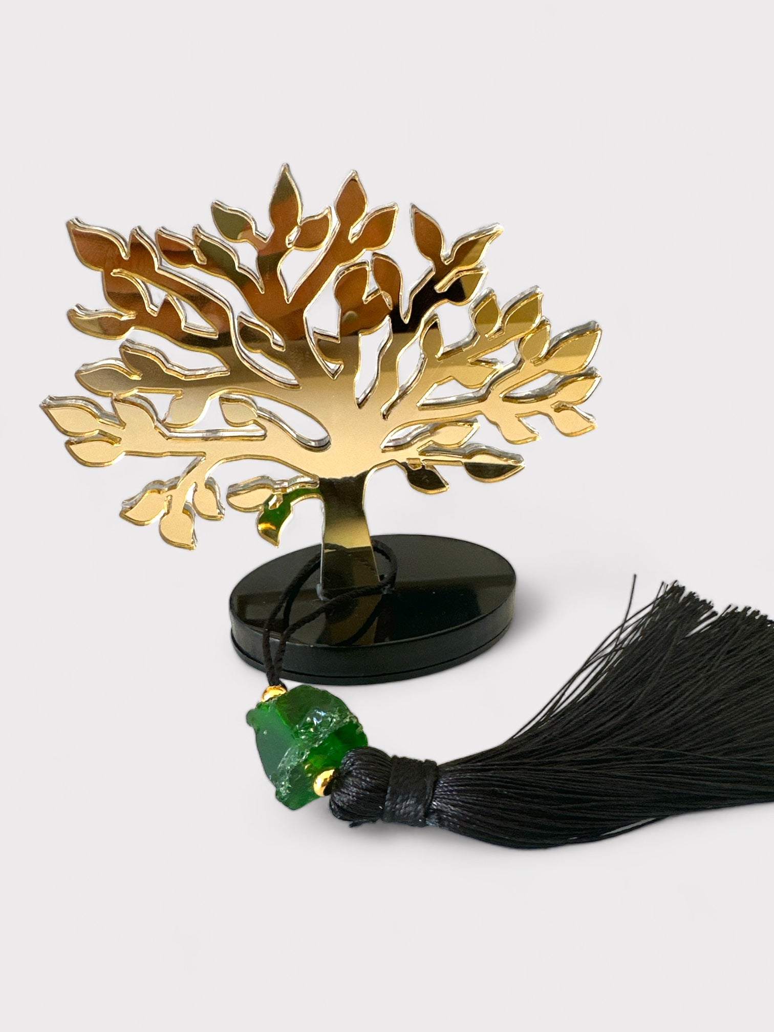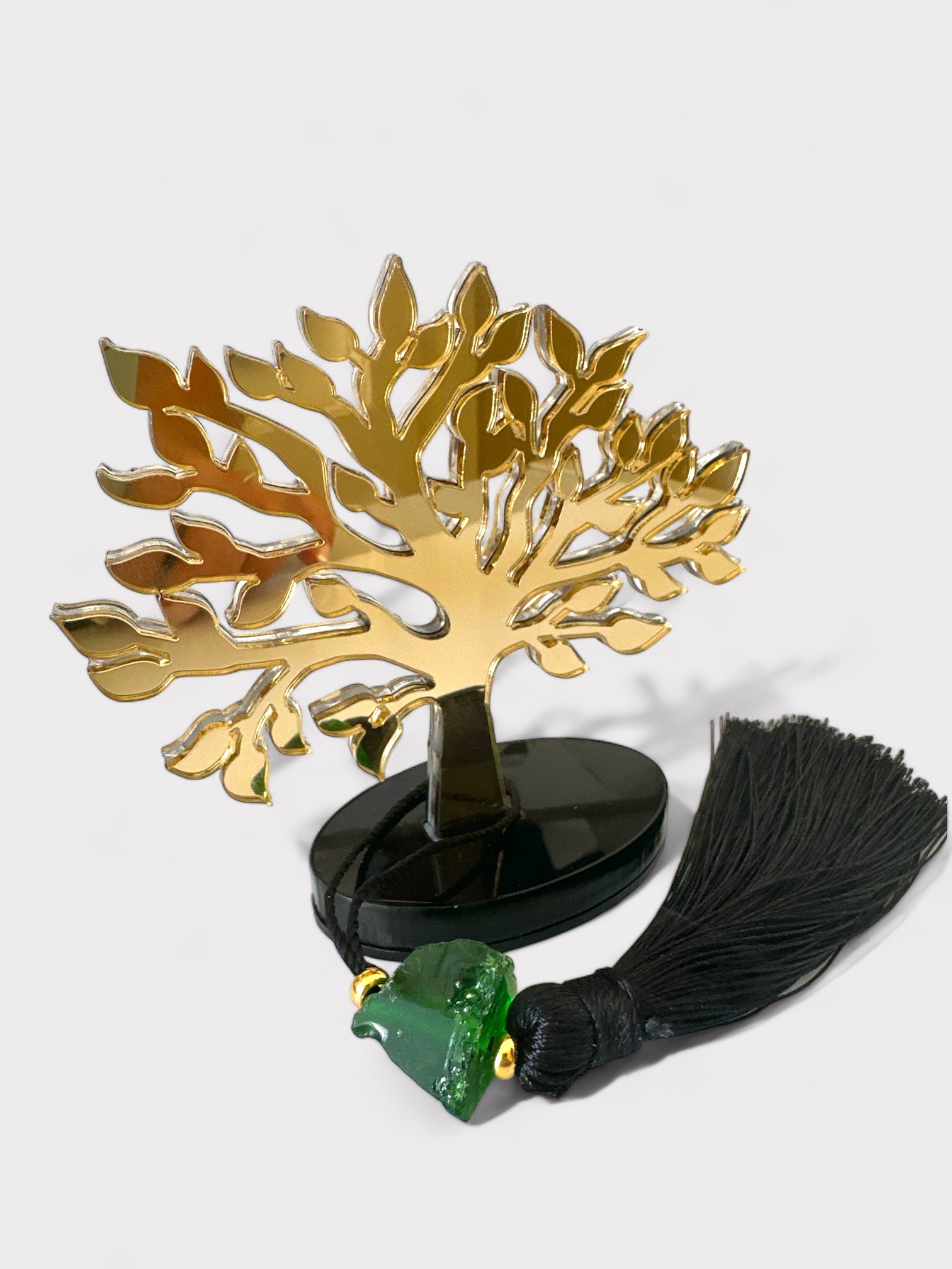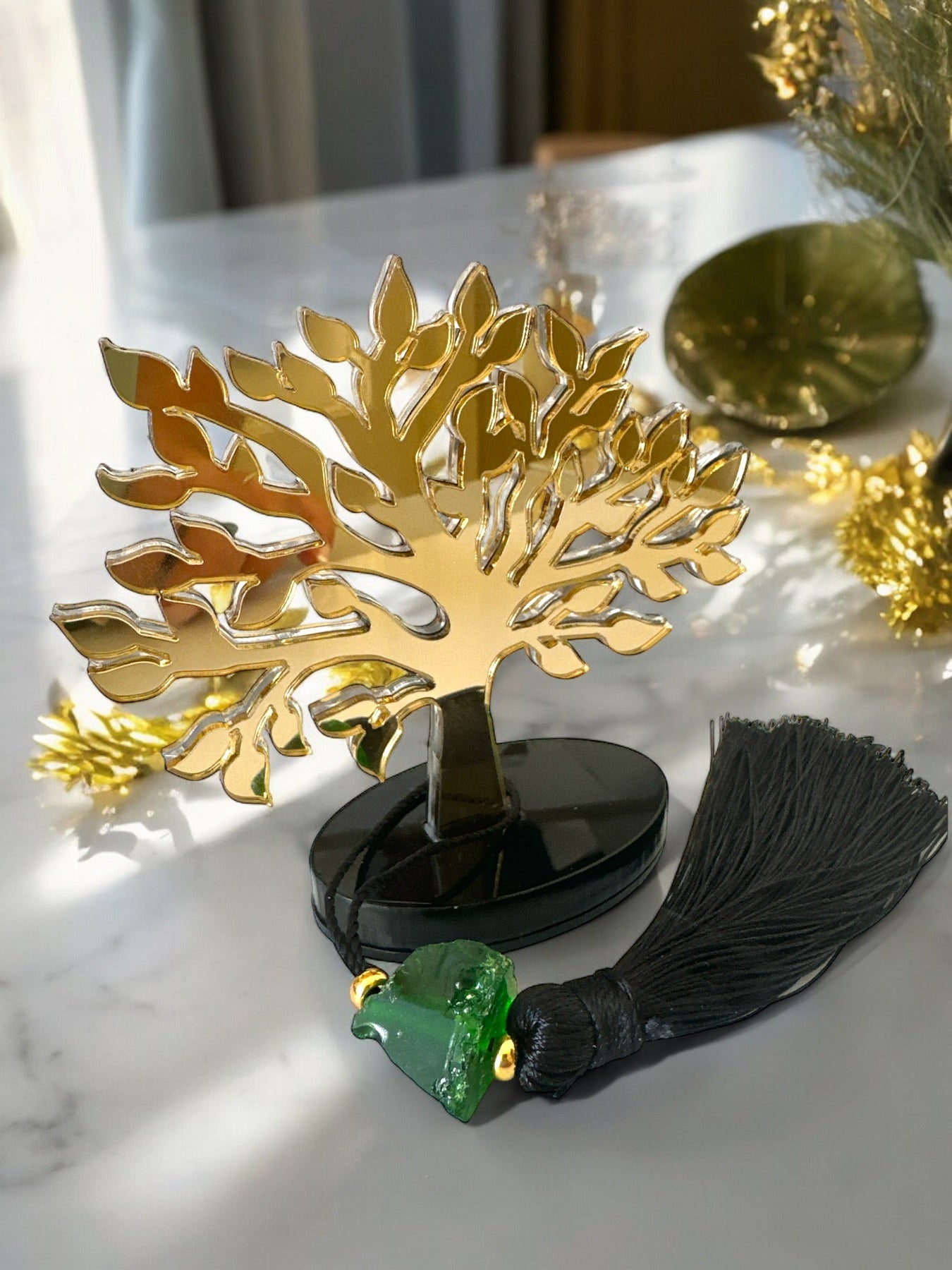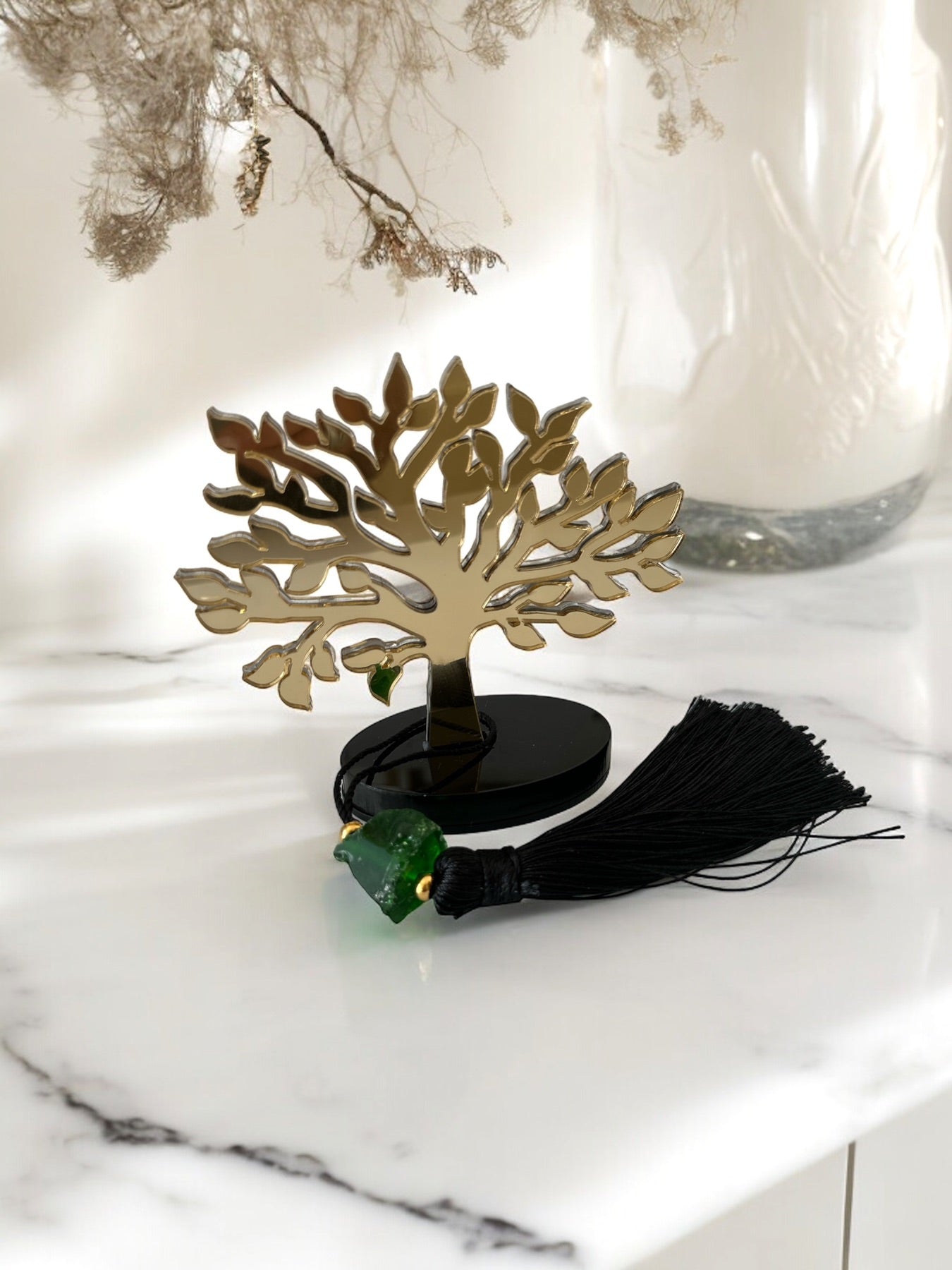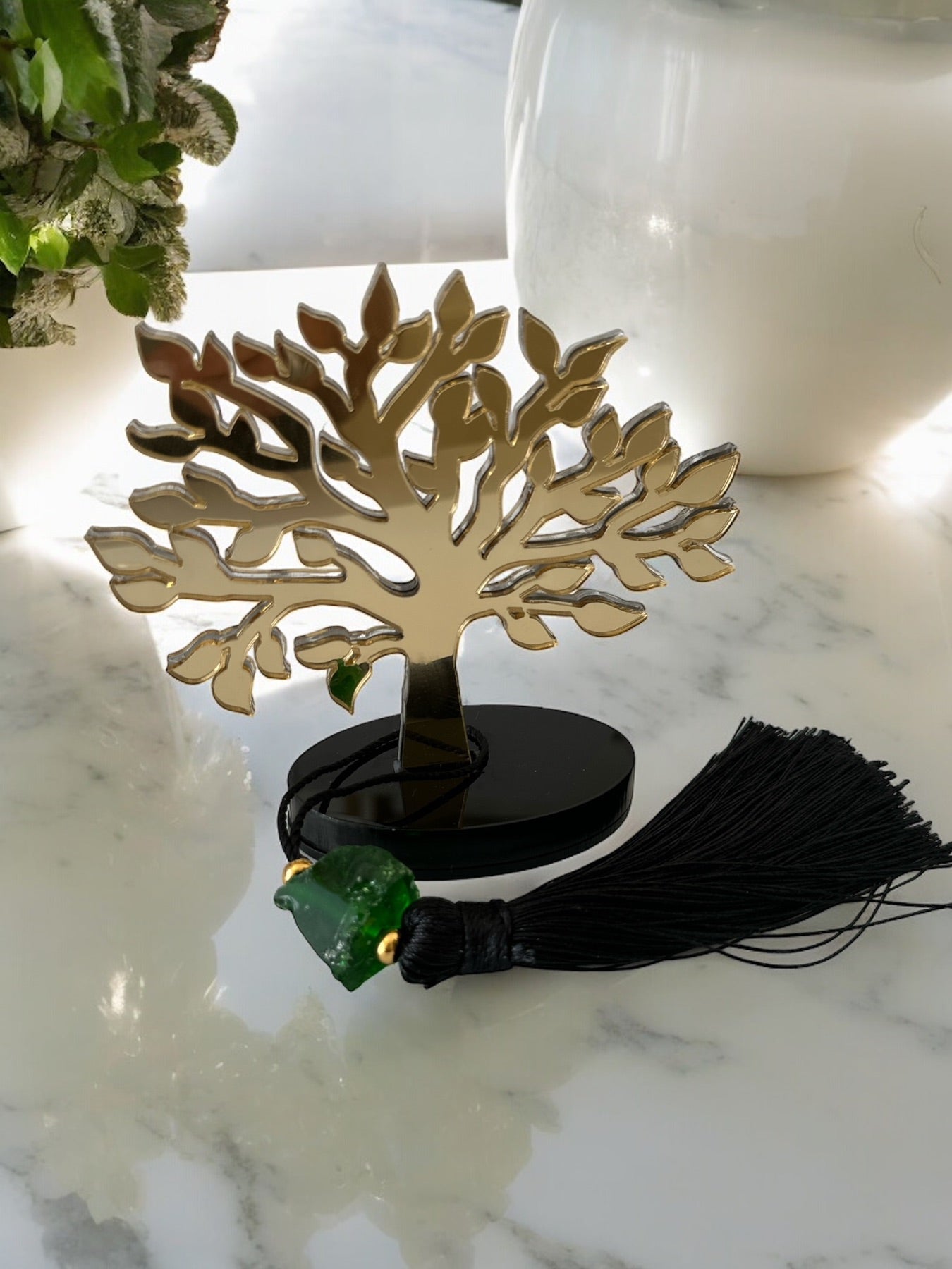 Χειροποίητο επιτραπέζιο γούρι δέντρο ελιάς από καθρέφτη πλεξιγκλάς με οβάλ πλεξιγκλάς βάση, στολισμένο με ακανόνιστη κρυστάλλινη πέτρα και σατέν φούντα.
