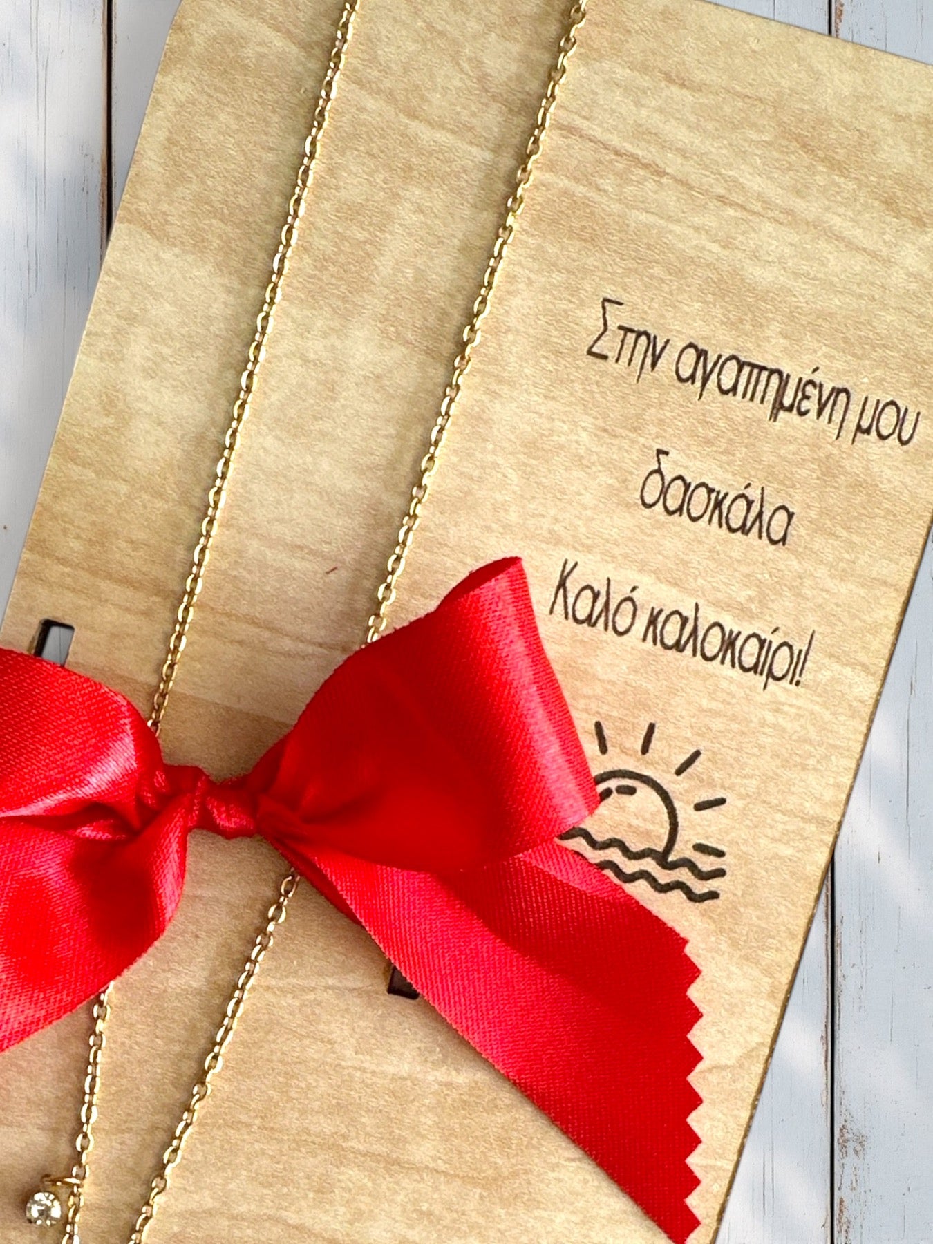 Ένα καλοκαιρινό δώρο γεμάτο φροντίδα, ιδανικό για τη δασκάλα που άξιζε τα πάντα αυτή τη χρονιά. Το χειροποίητο κολιέ μας συνδυάζει: