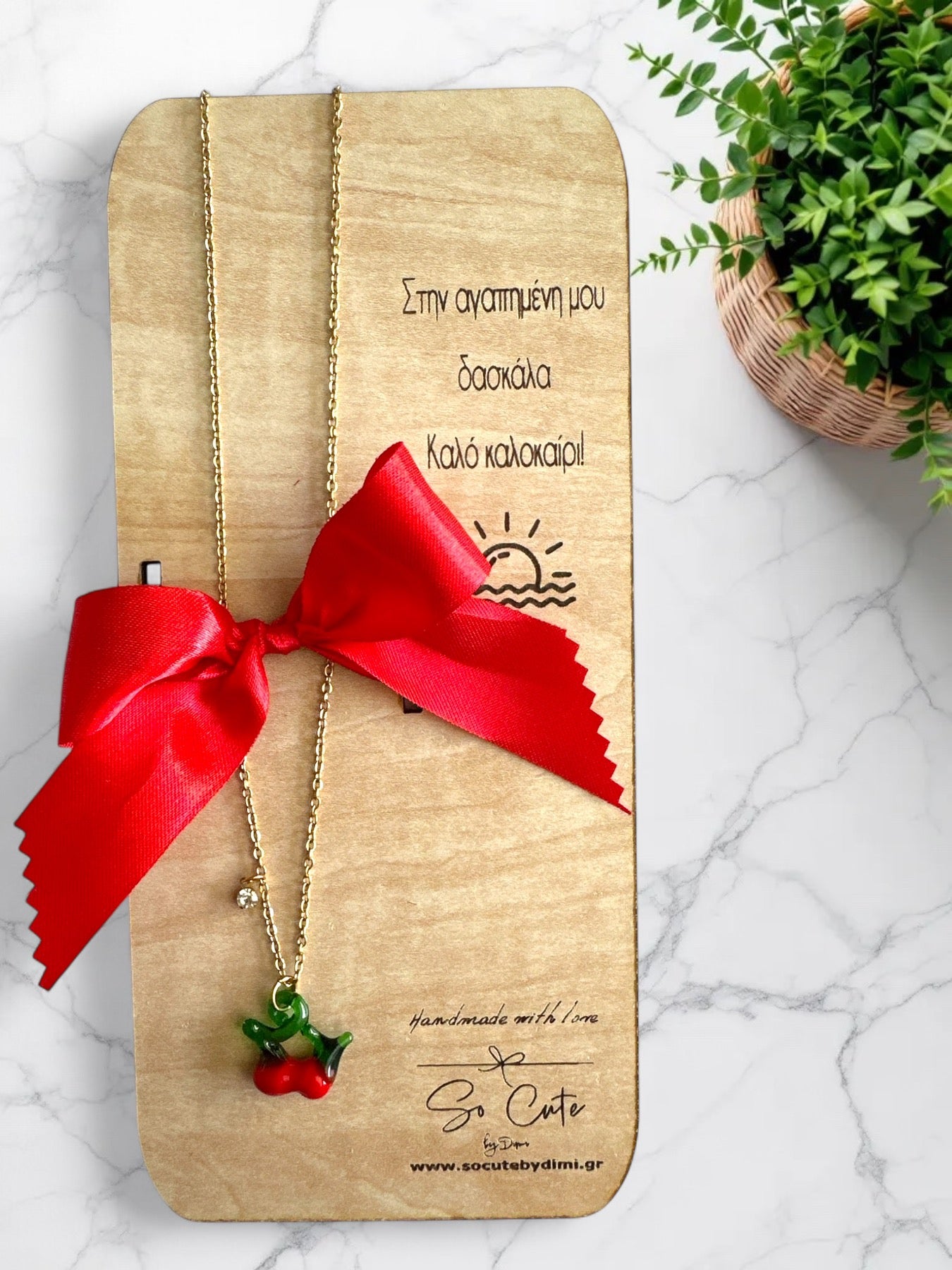 Κολιέ με κερασάκια - δώρο δασκάλας σε ξύλινη πλάτη με αφιέρωση