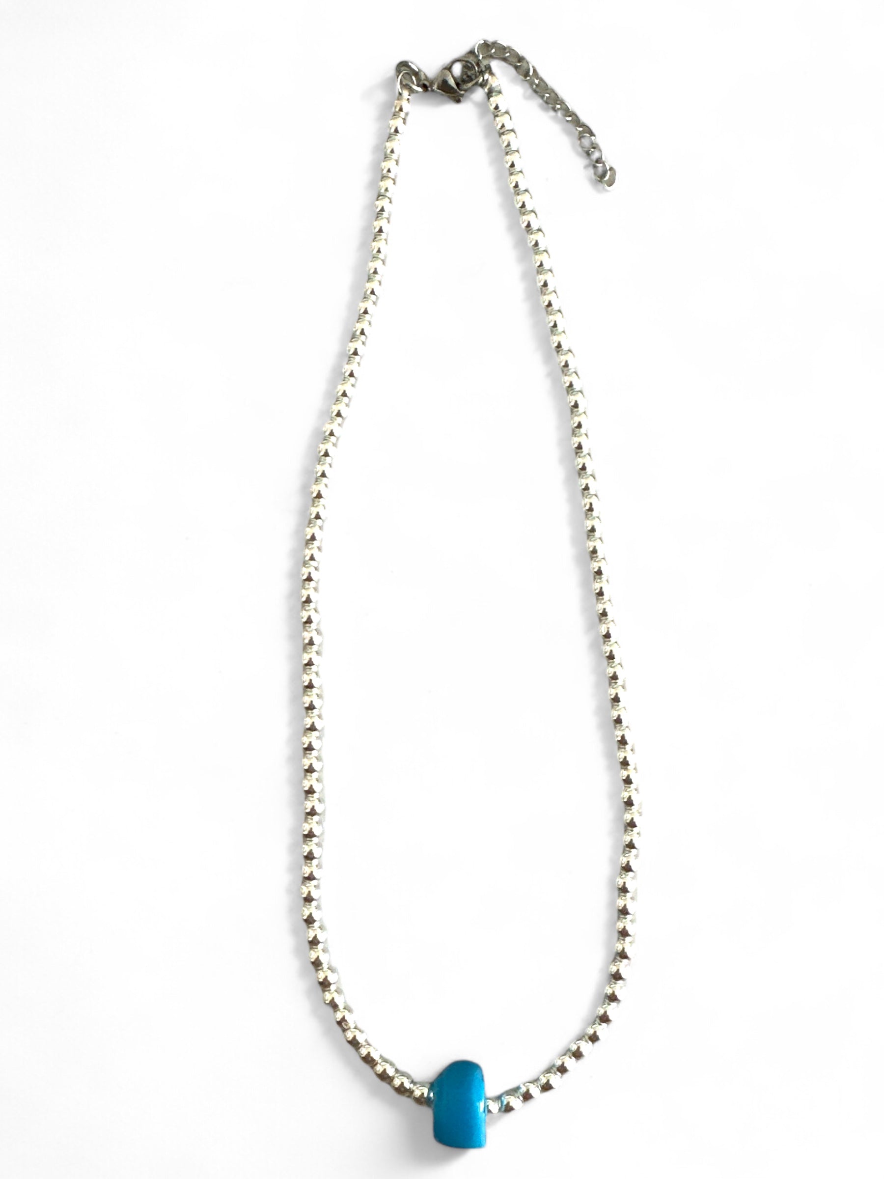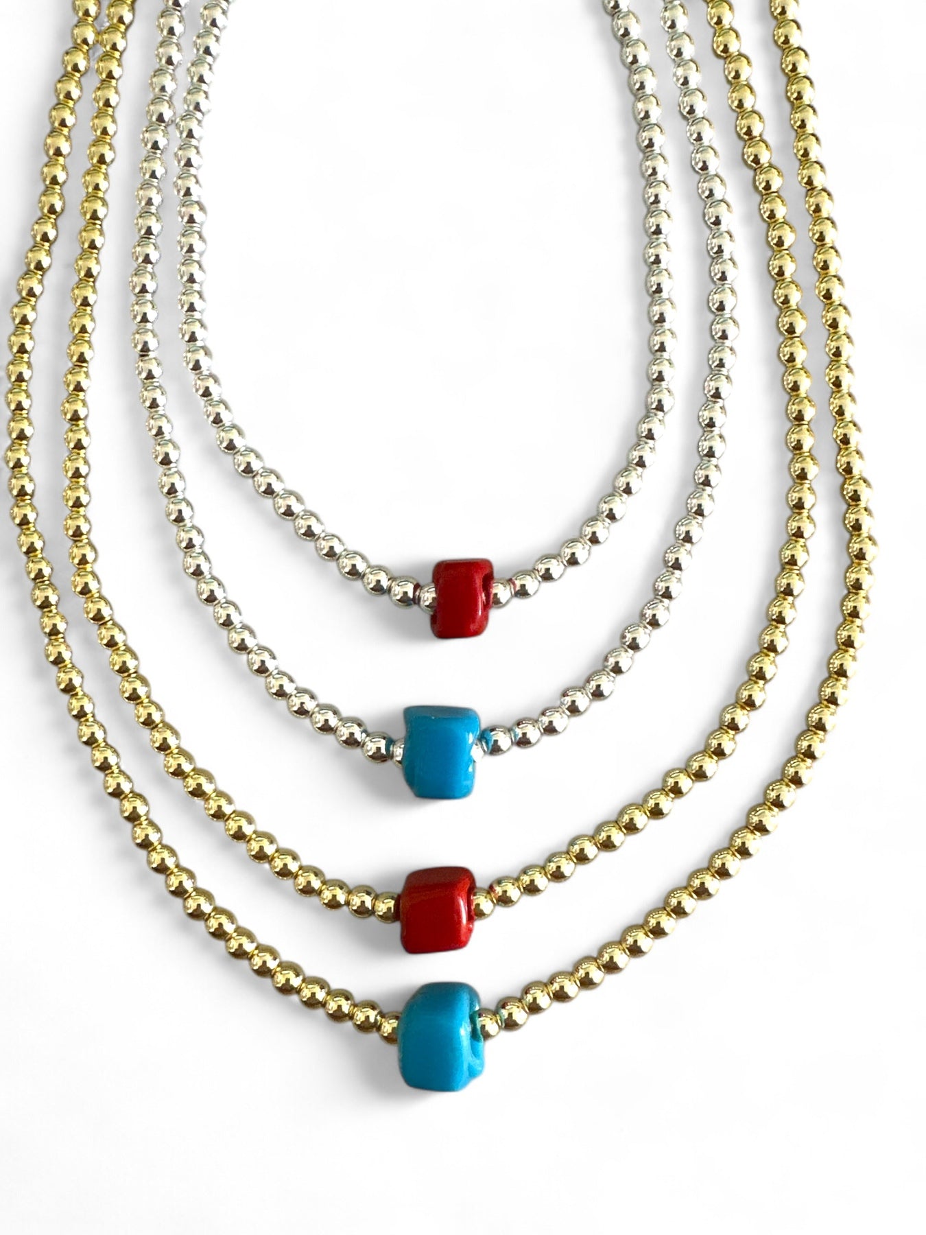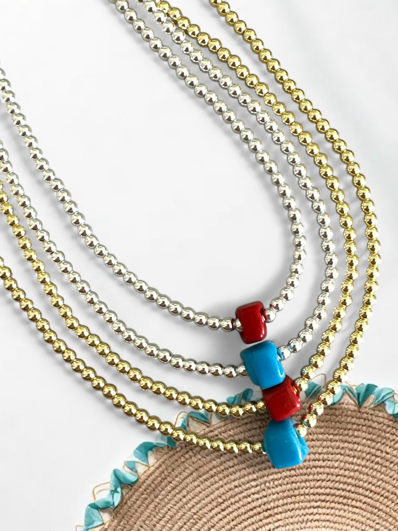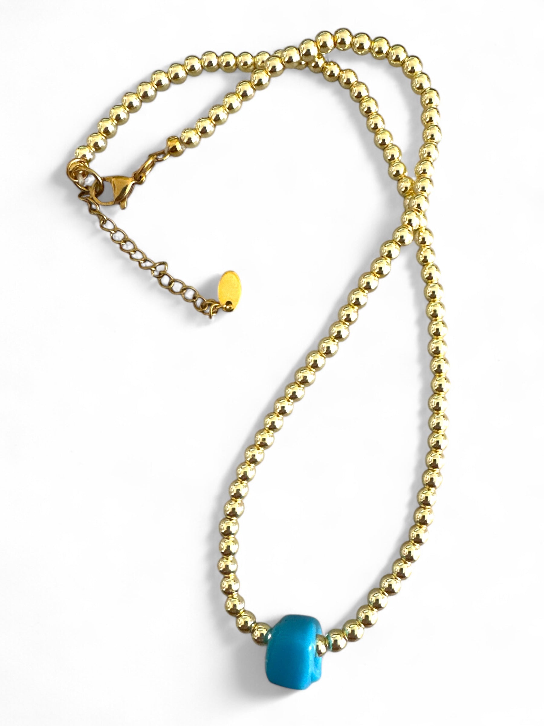 Ανέδειξε το ντεκολτέ σου με ένα ευκολοφόρετο κολιέ από λαμπερές χάντρες αιματίτη και γαλάζια ή κόκκινη χάντρα! Ατσάλινο κούμπωμα.