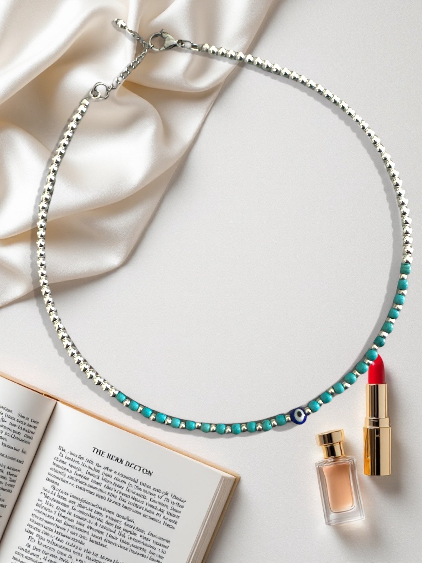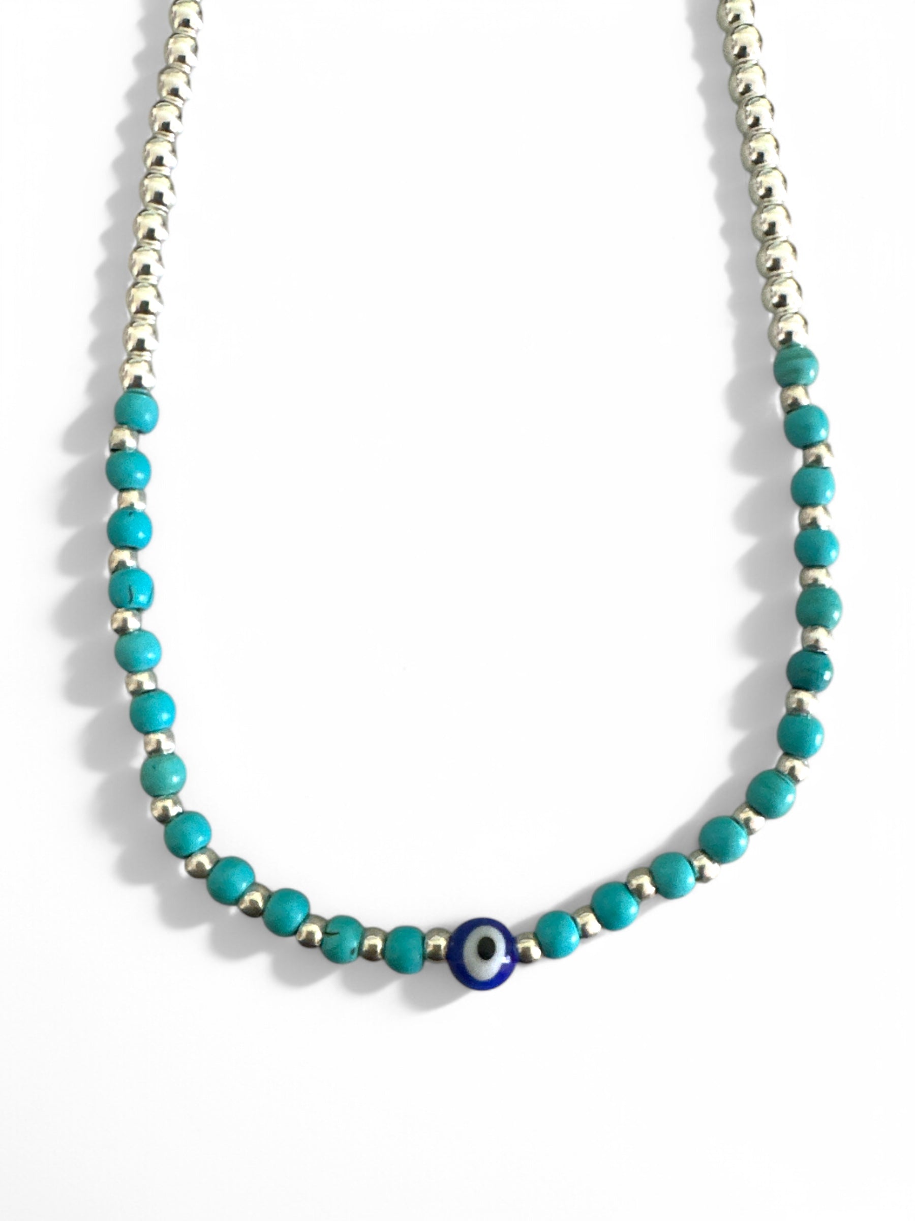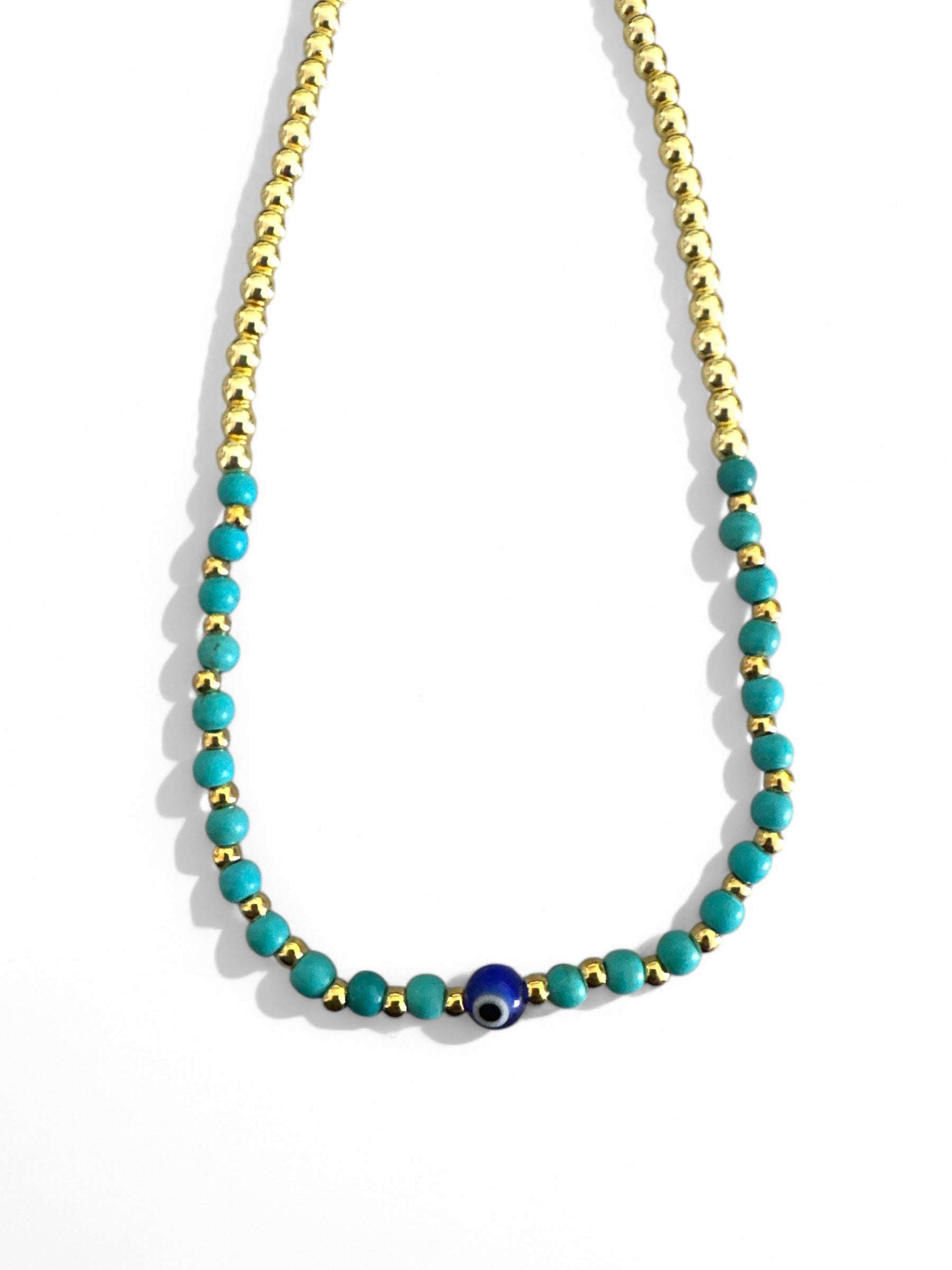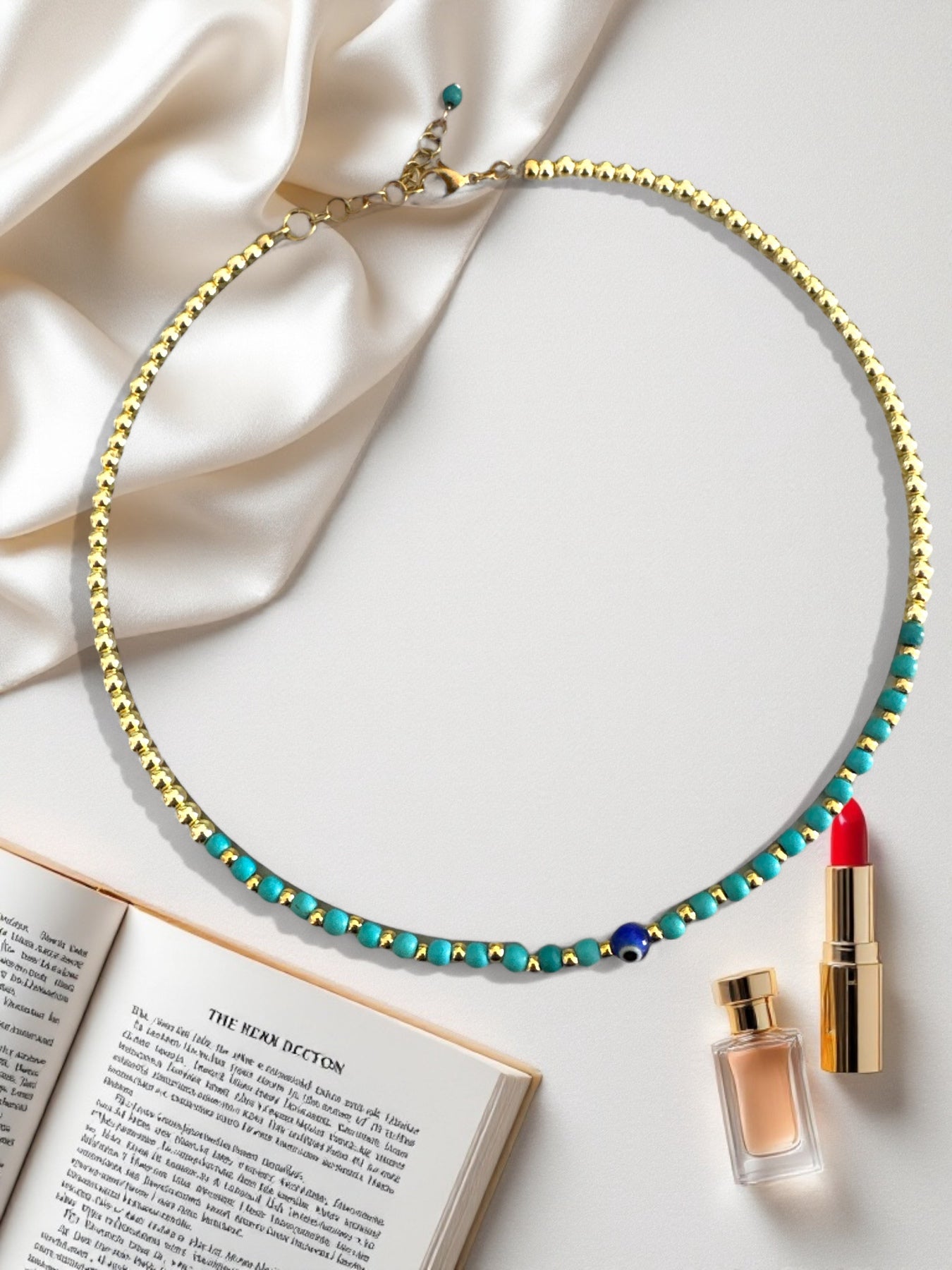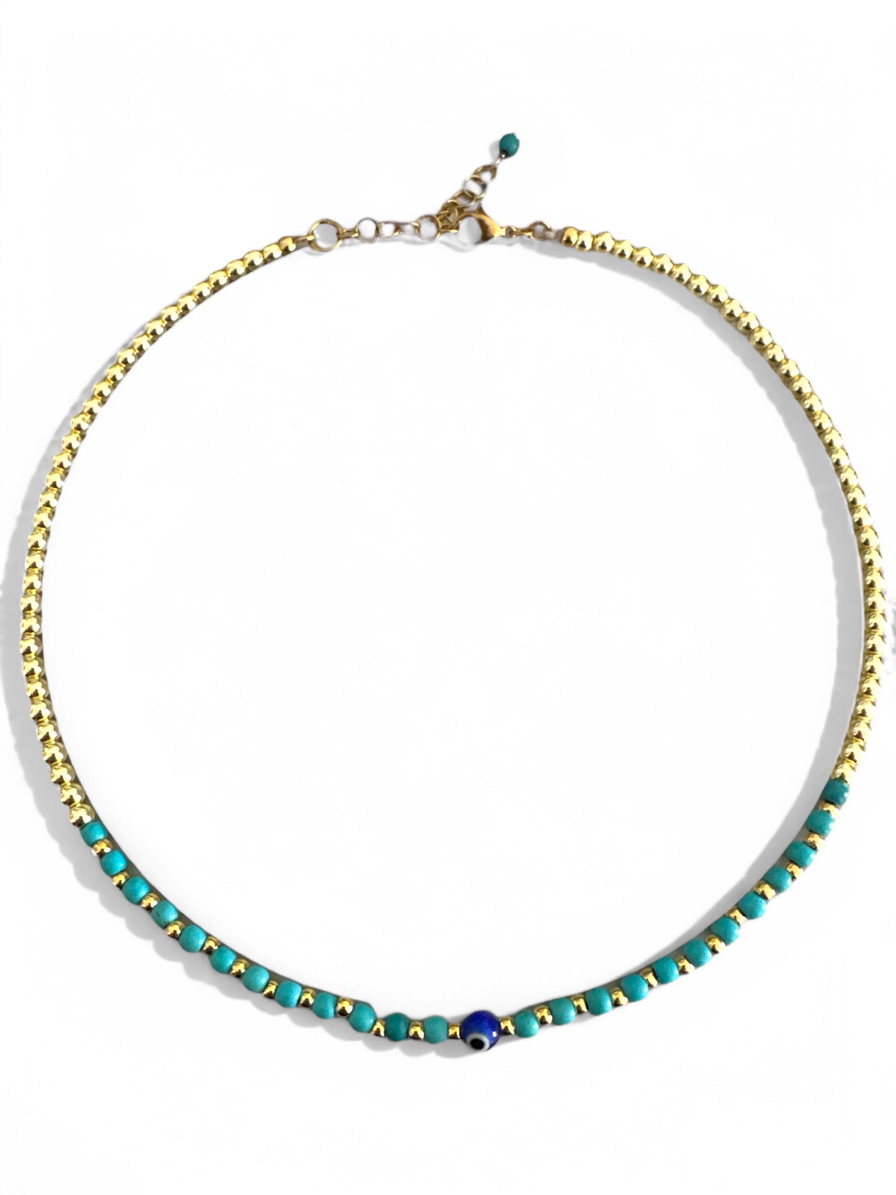 Χειροποίητο κολιέ με συνδυασμό από ημιπολύτιμες χάντρες αιματίτη και χαολίτη, μικρές χάντρες από ορείχαλκο και διακριτικό στρογγυλό ματάκι στο κέντρο.