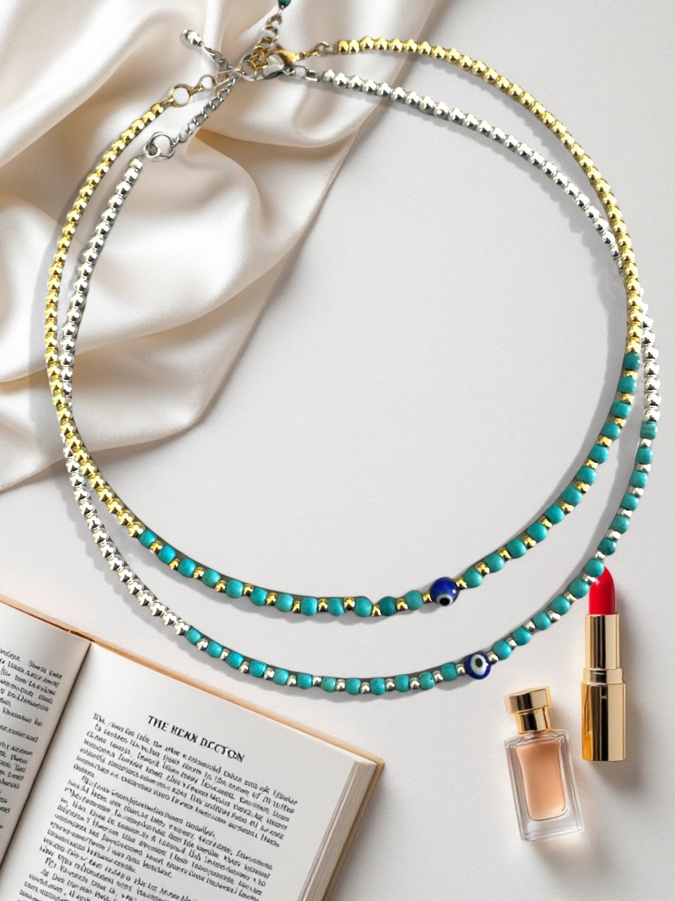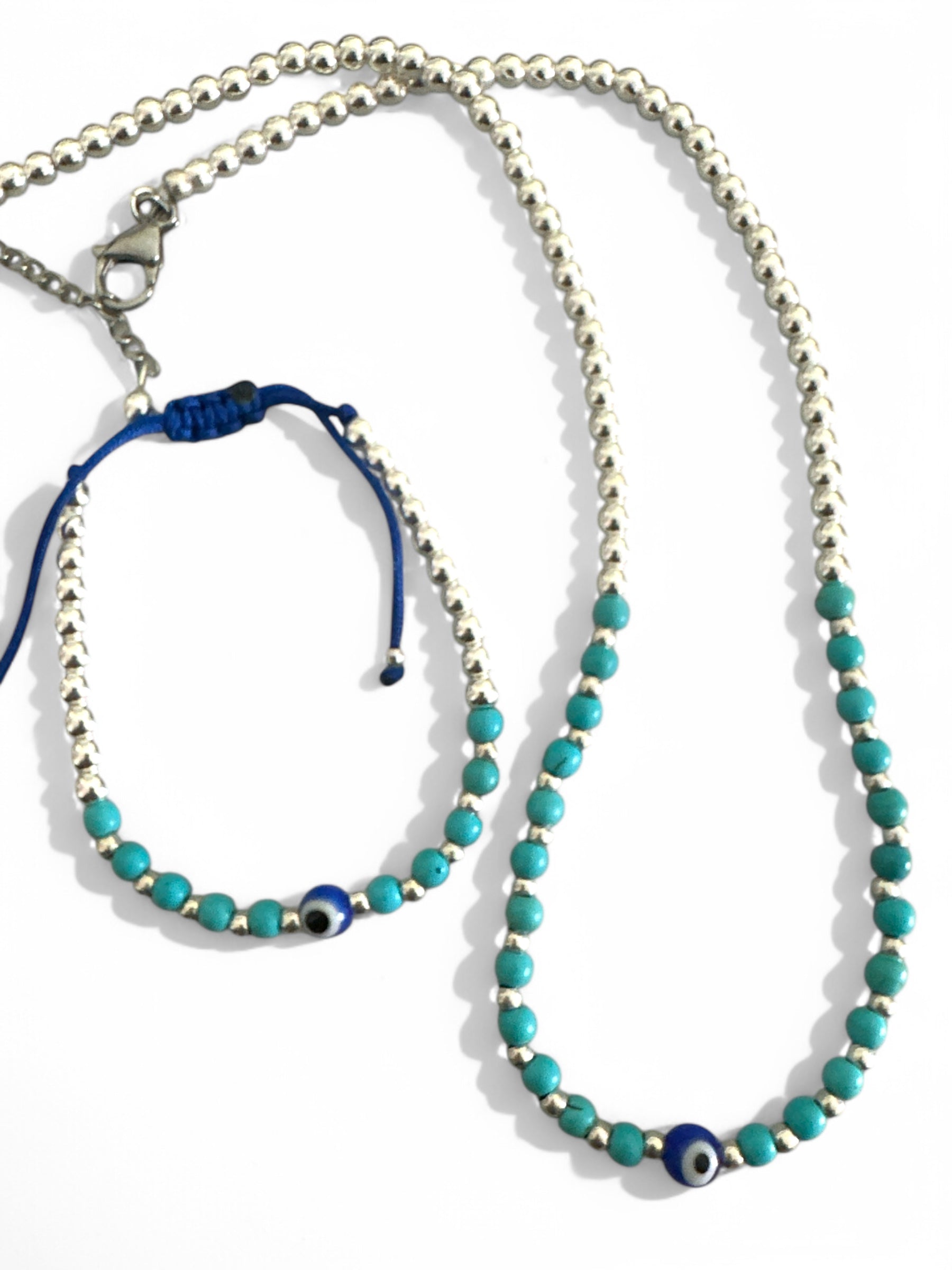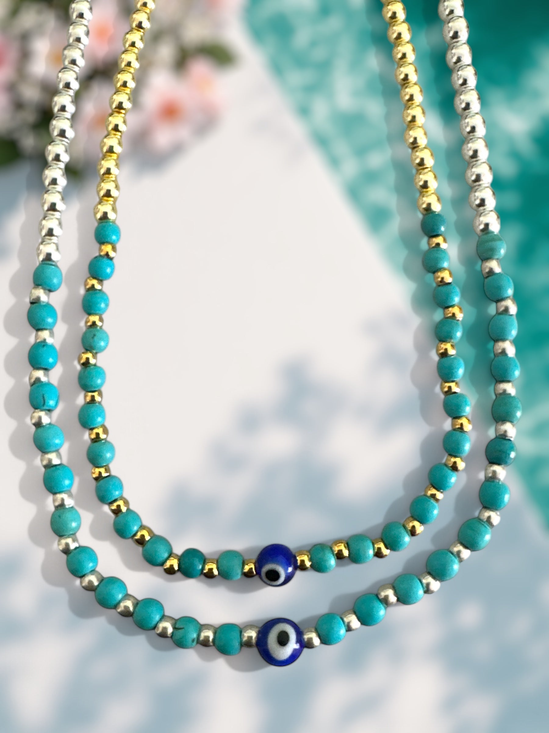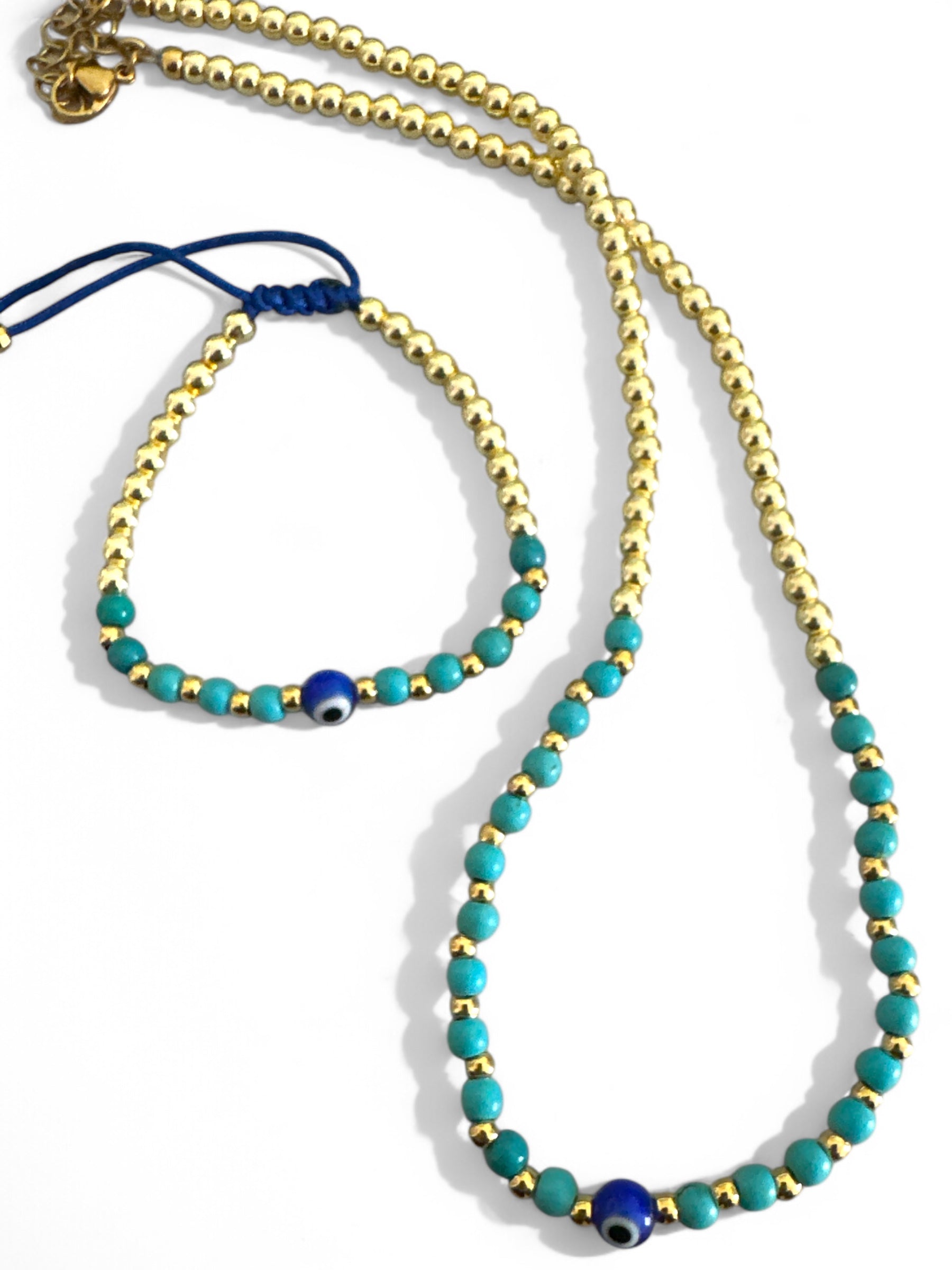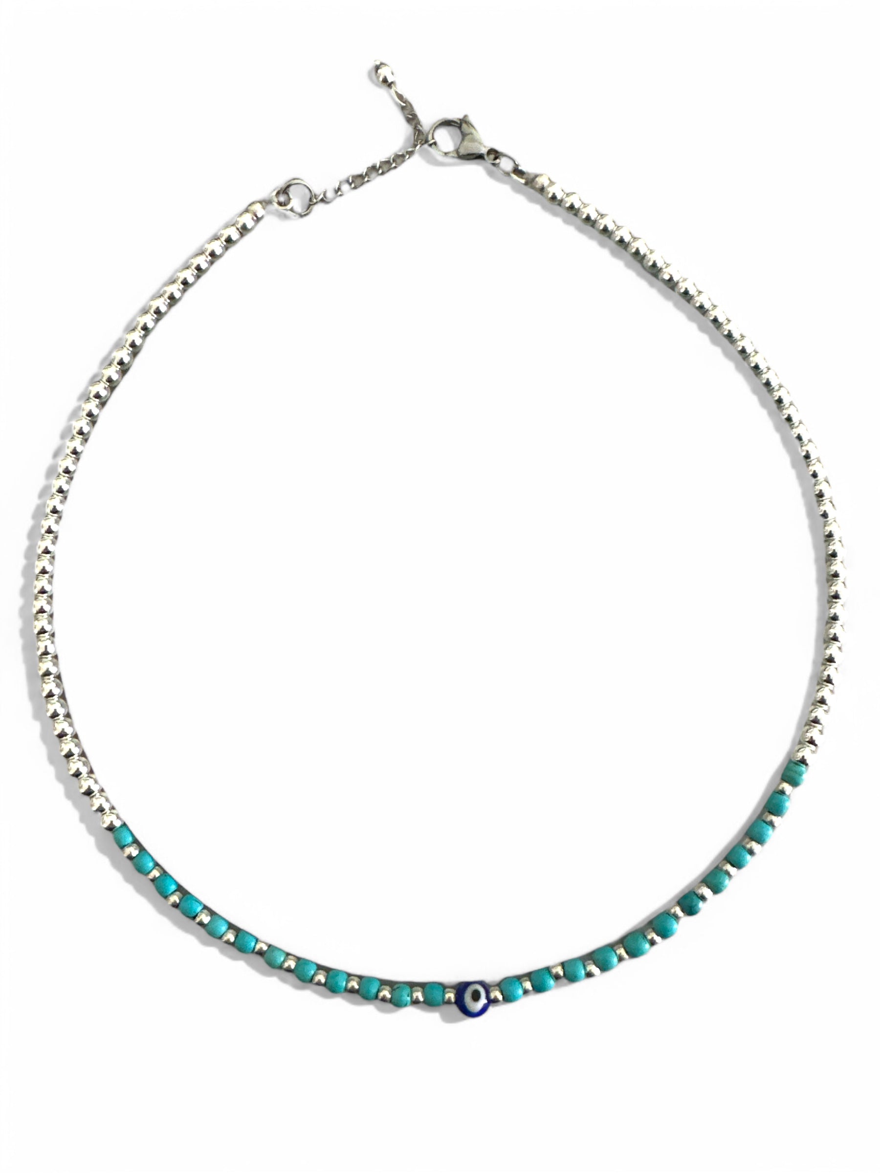 Χειροποίητο κολιέ με συνδυασμό από ημιπολύτιμες χάντρες αιματίτη και χαολίτη, μικρές χάντρες από ορείχαλκο και διακριτικό στρογγυλό ματάκι στο κέντρο.