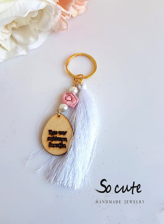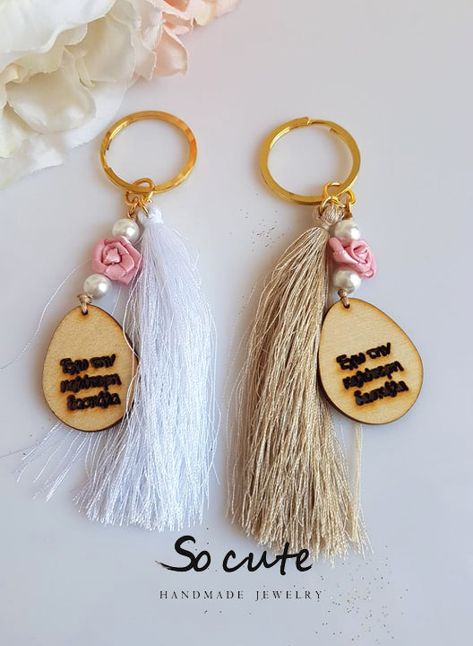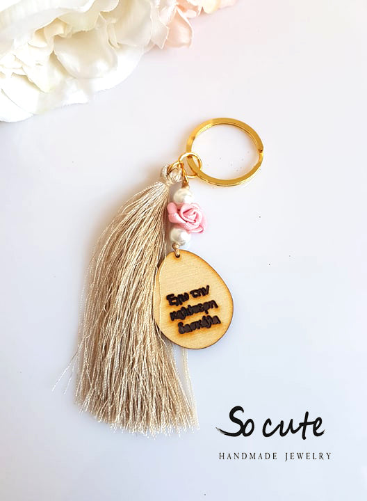 Χειροποίητο μπρελόκ με φούντα, πέρλες, τριανταφυλλάκι και ξύλινο στοιχείο με χαραγμένη την φράση "έχω την καλύτερη δασκάλα"