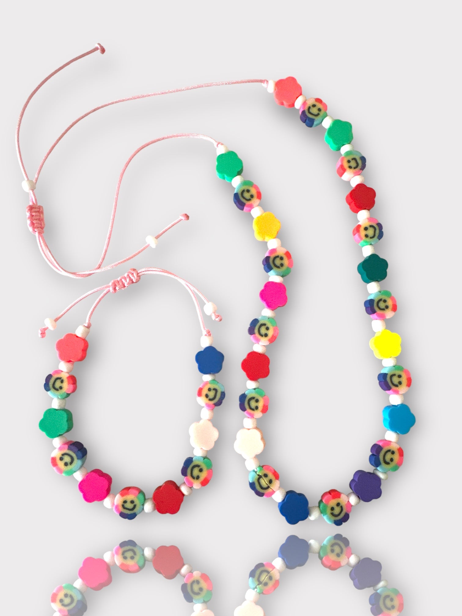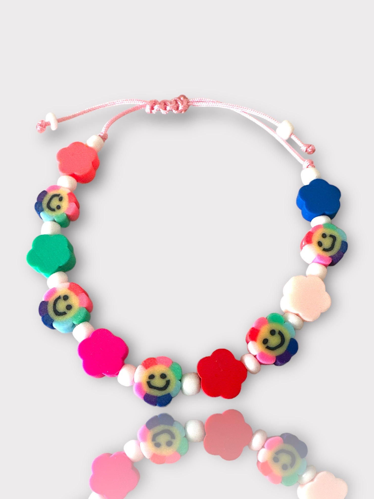 Χειροποίητο βραχιόλι με πολύχρωμες χάντρες φίμο σε σχήμα λουλουδιού με χαμογελάκι.