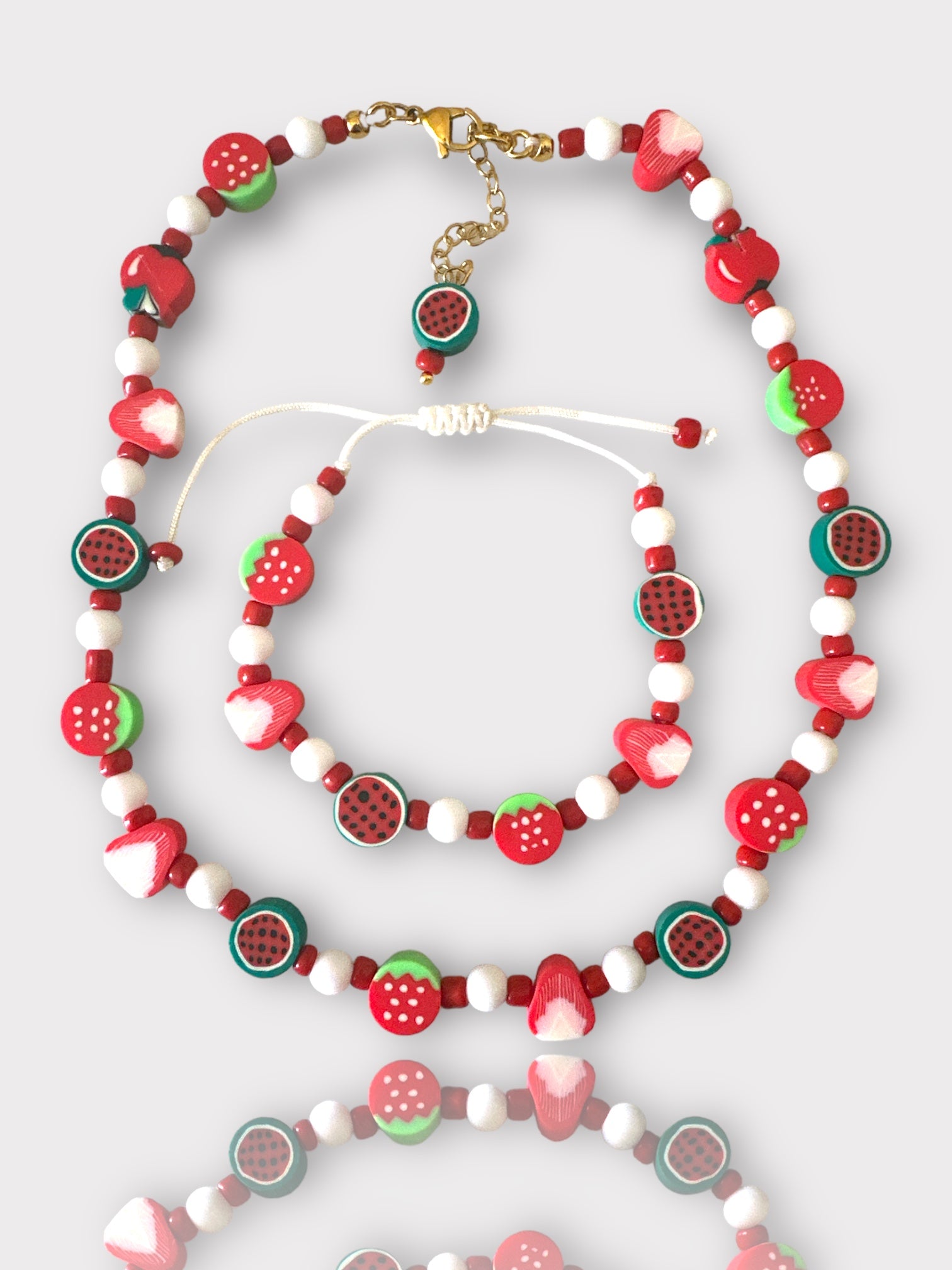 Χειροποίητο κολιέ με γυάλινες χάντρες, ακρυλικές χάντρες φίμο με διάφορα φρουτάκια και ατσάλινο κούμπωμα.