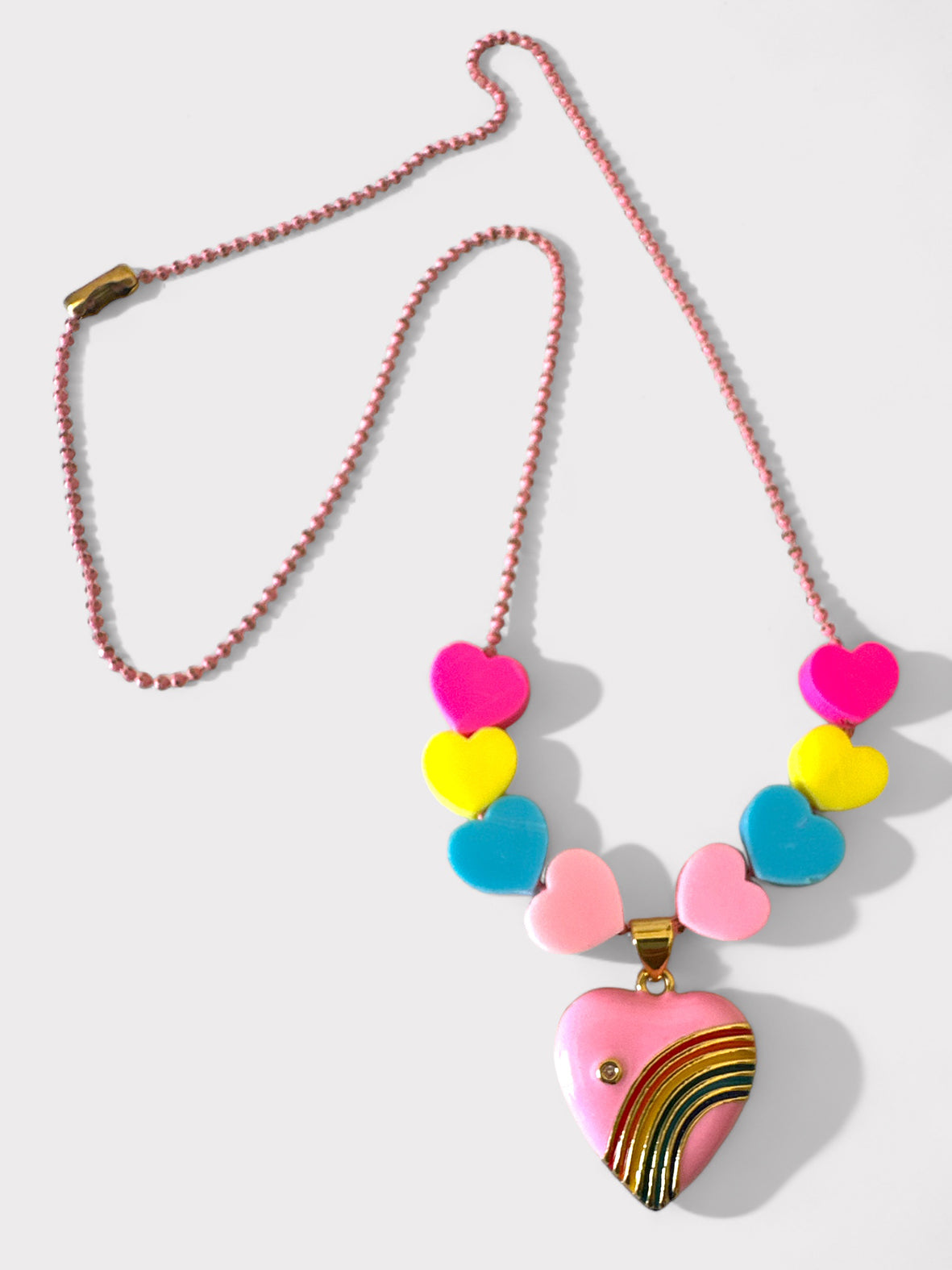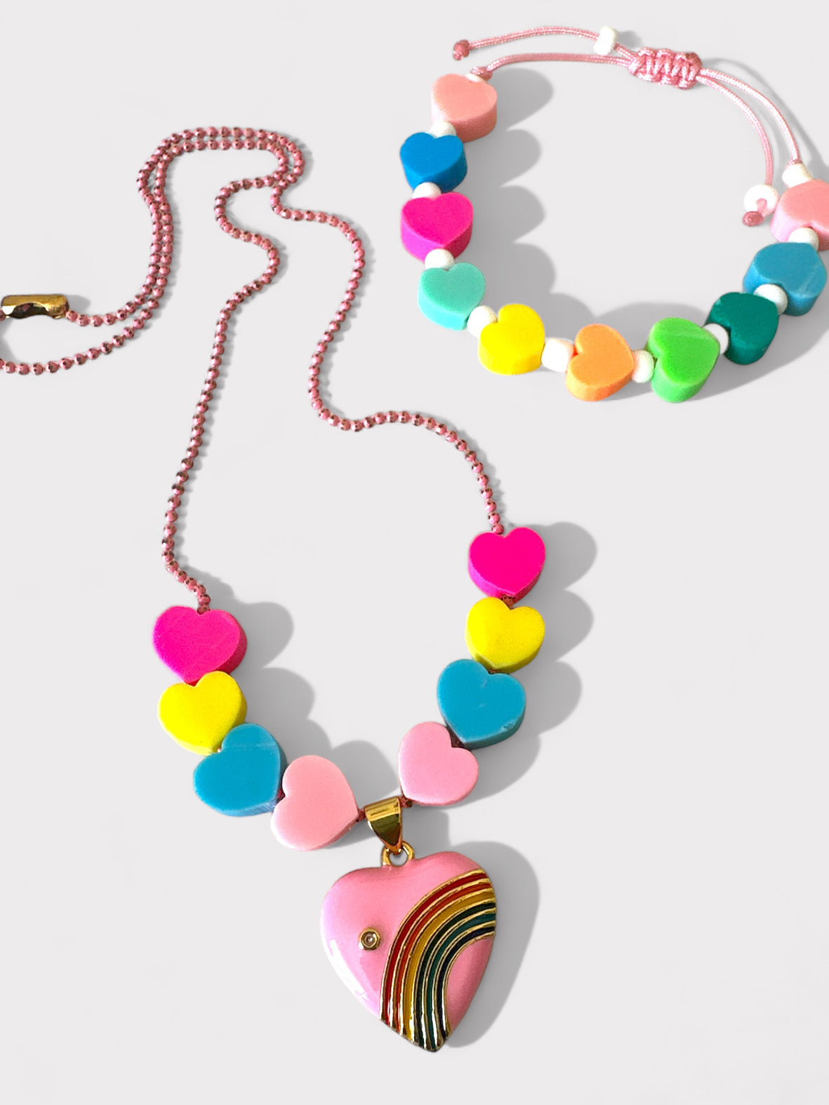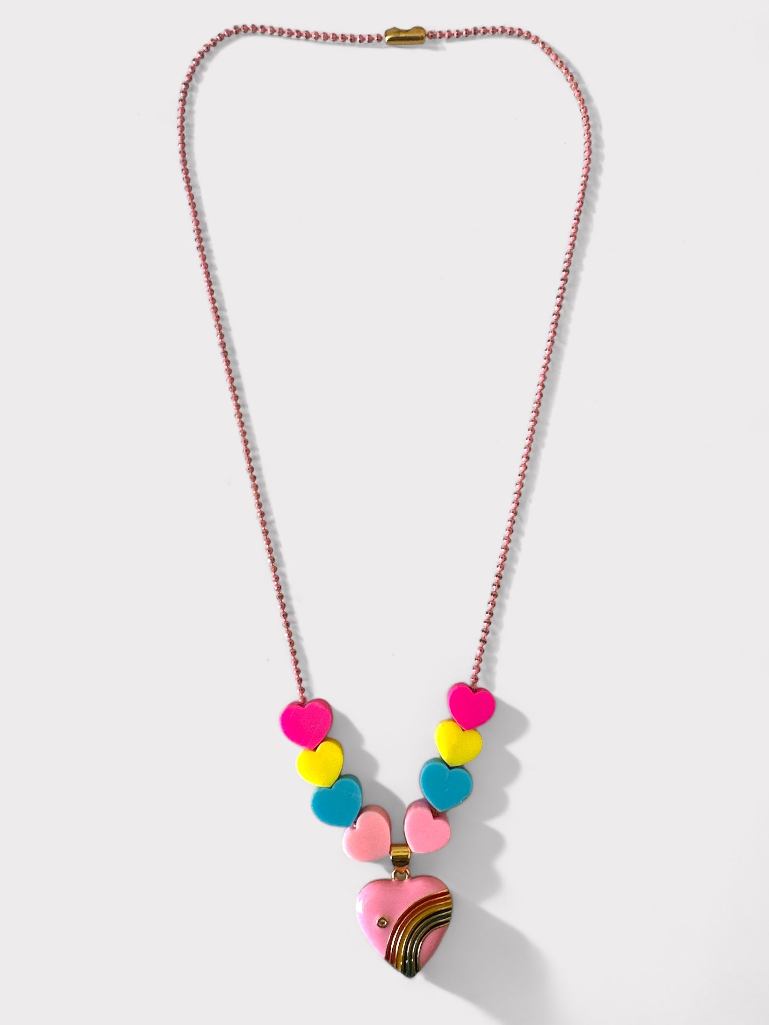 Χειροποίητο κολιέ με ατσάλινη χρωματιστή αλυσίδα, φίμο πολύχρωμες καρδούλες και επίχρυσο μοτίφ καρδιά με ουράνιο τόξο και ζιργκόν.