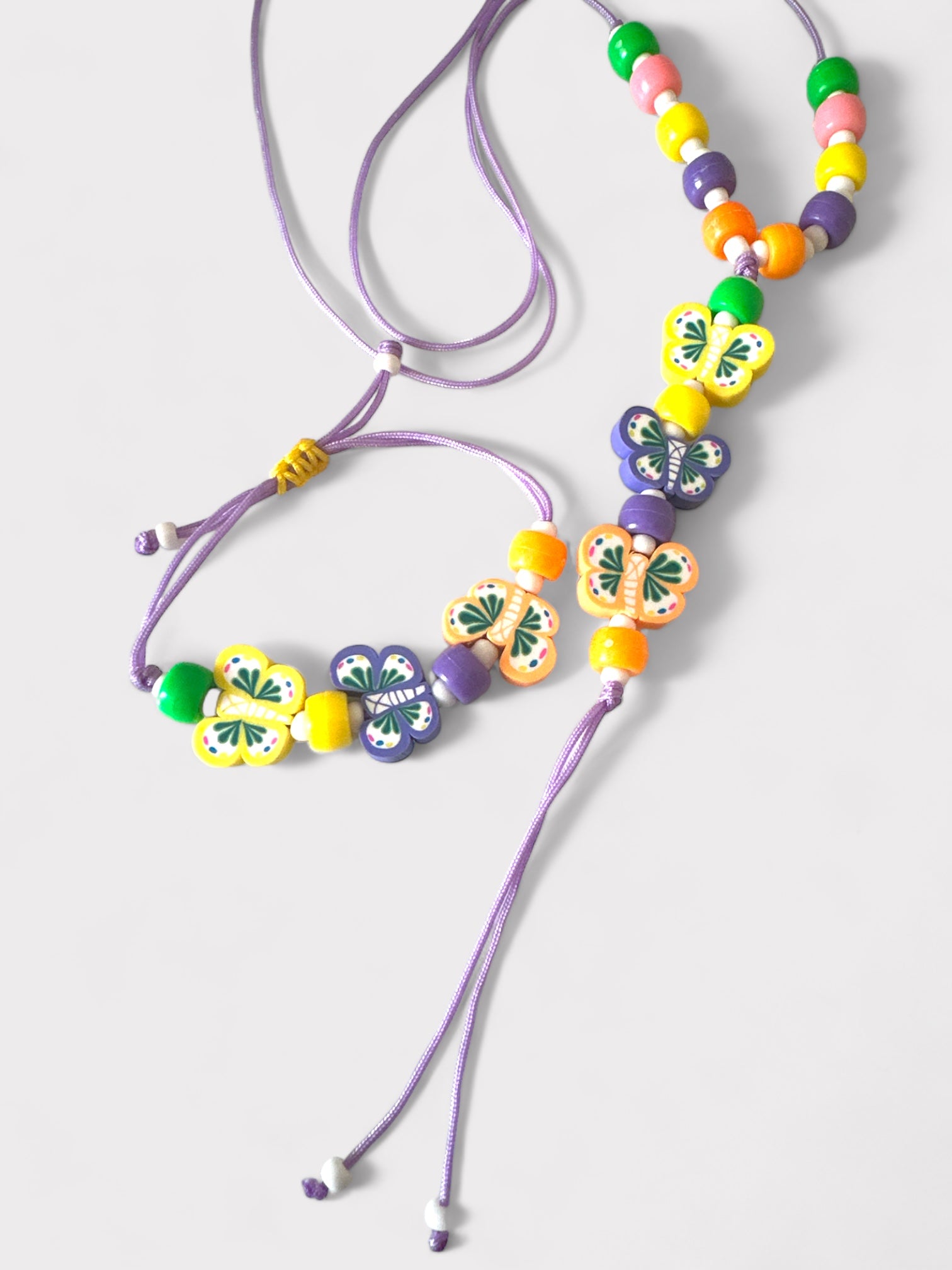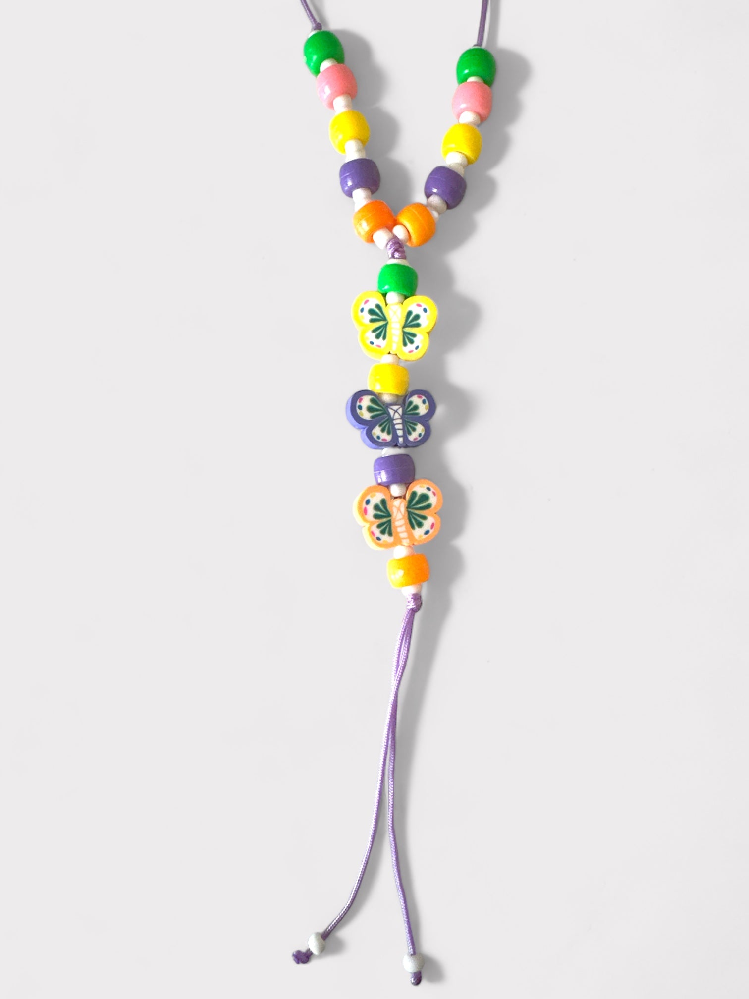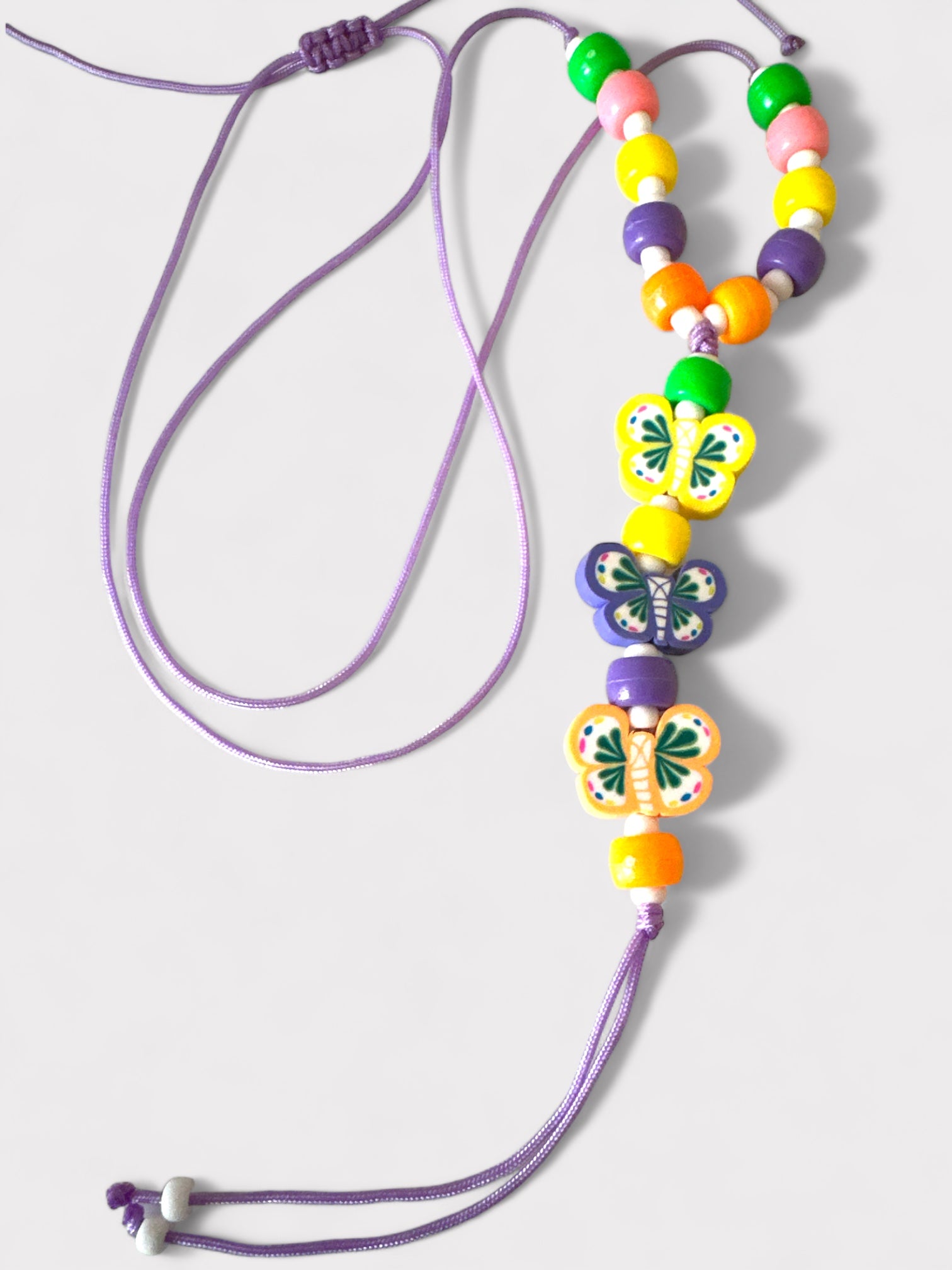 Χειροποίητο μακρύ κολιέ με κορδόνι, πολύχρωμες ακρυλικές χάντρες και κρεμαστές φίμο πολύχρωμες πεταλούδες με τελειώματα κορδόνια.