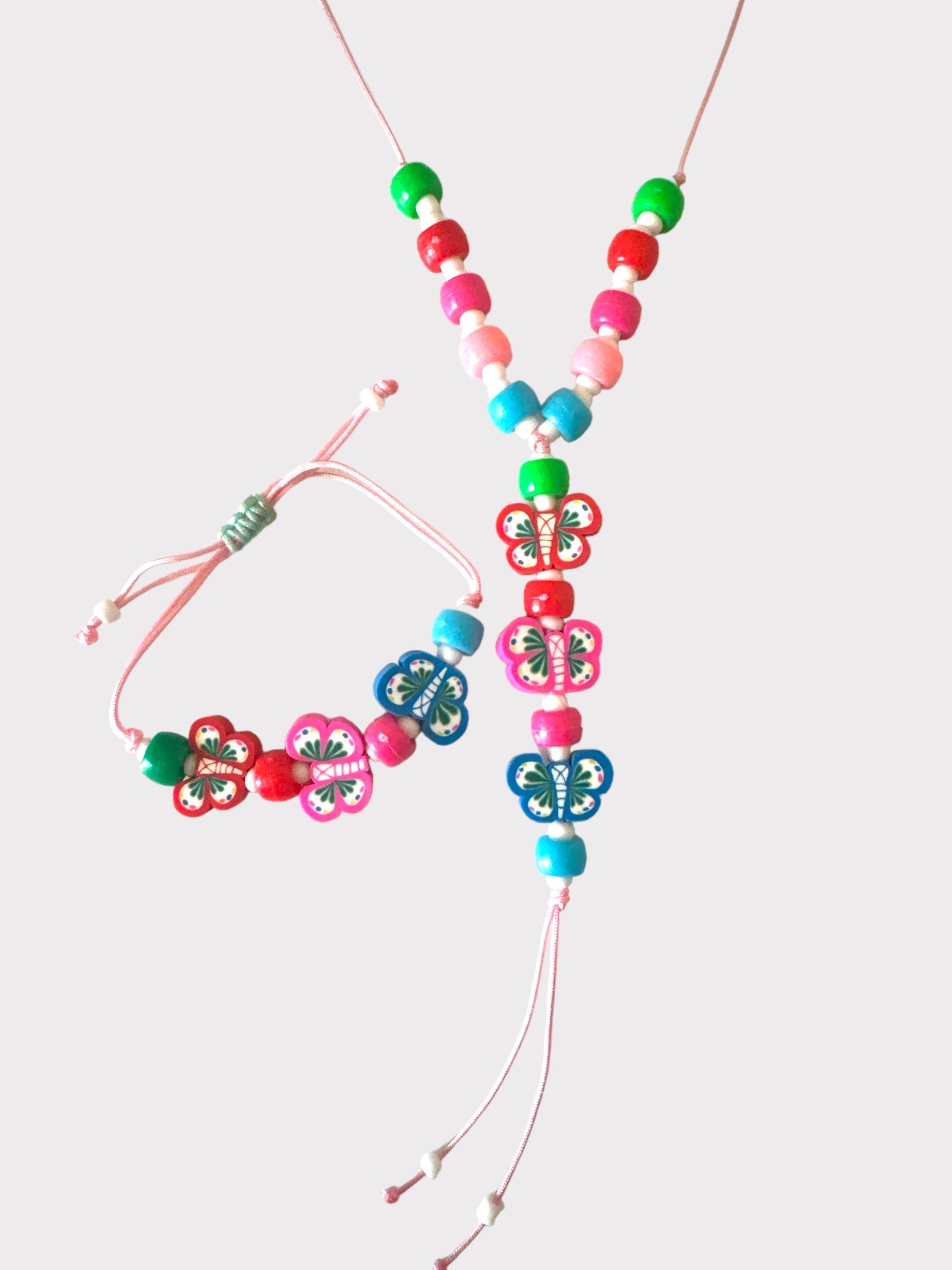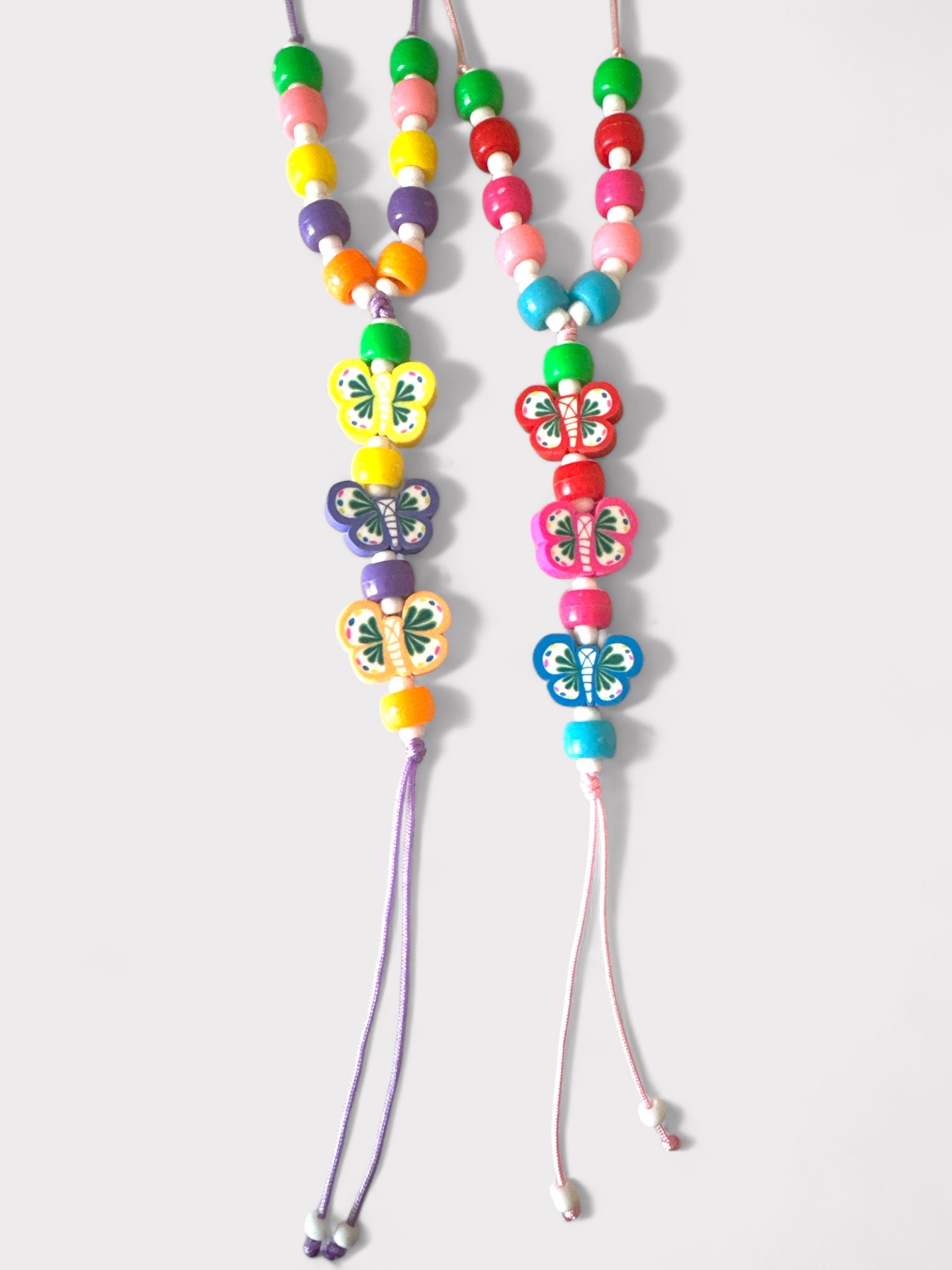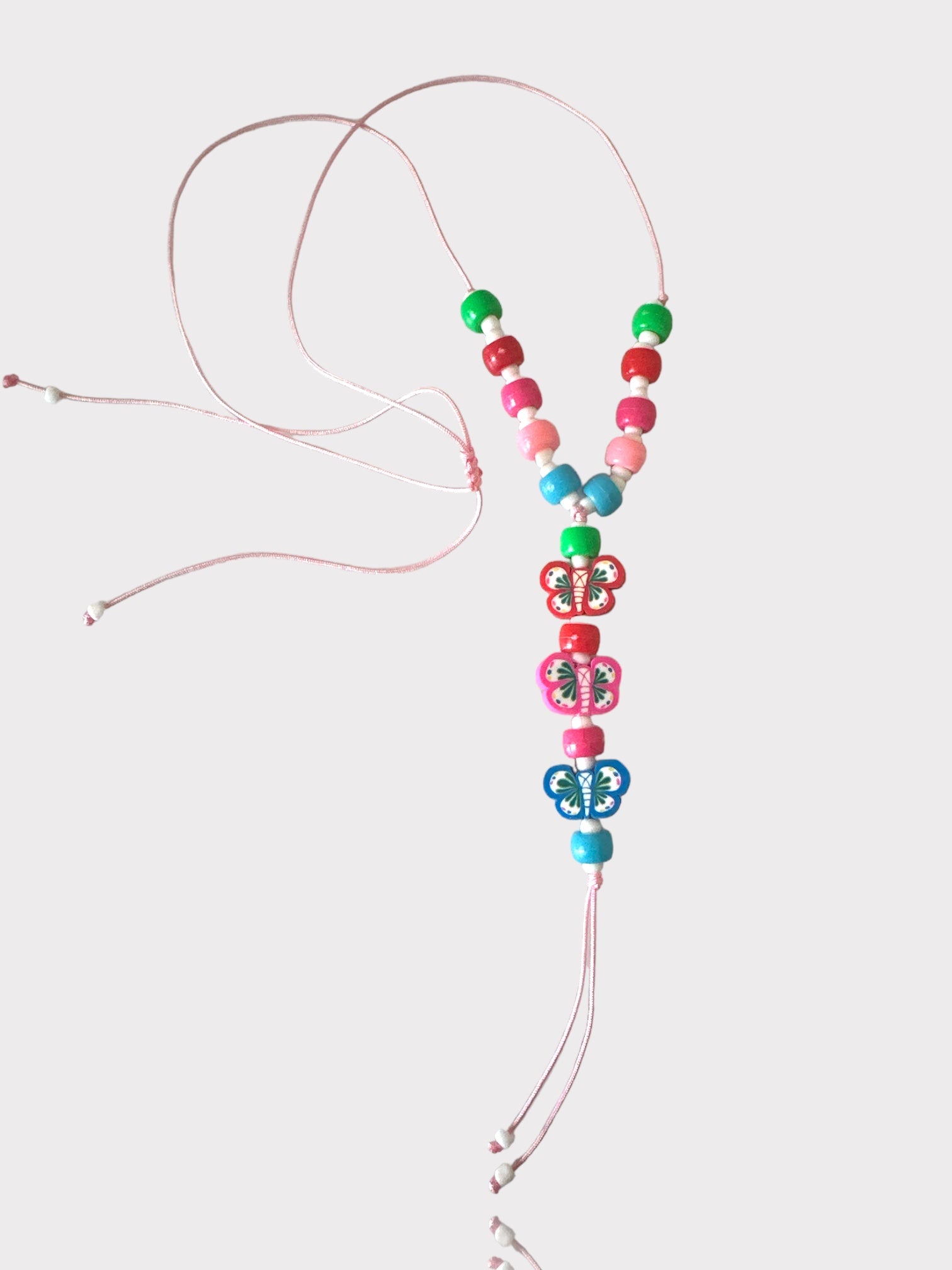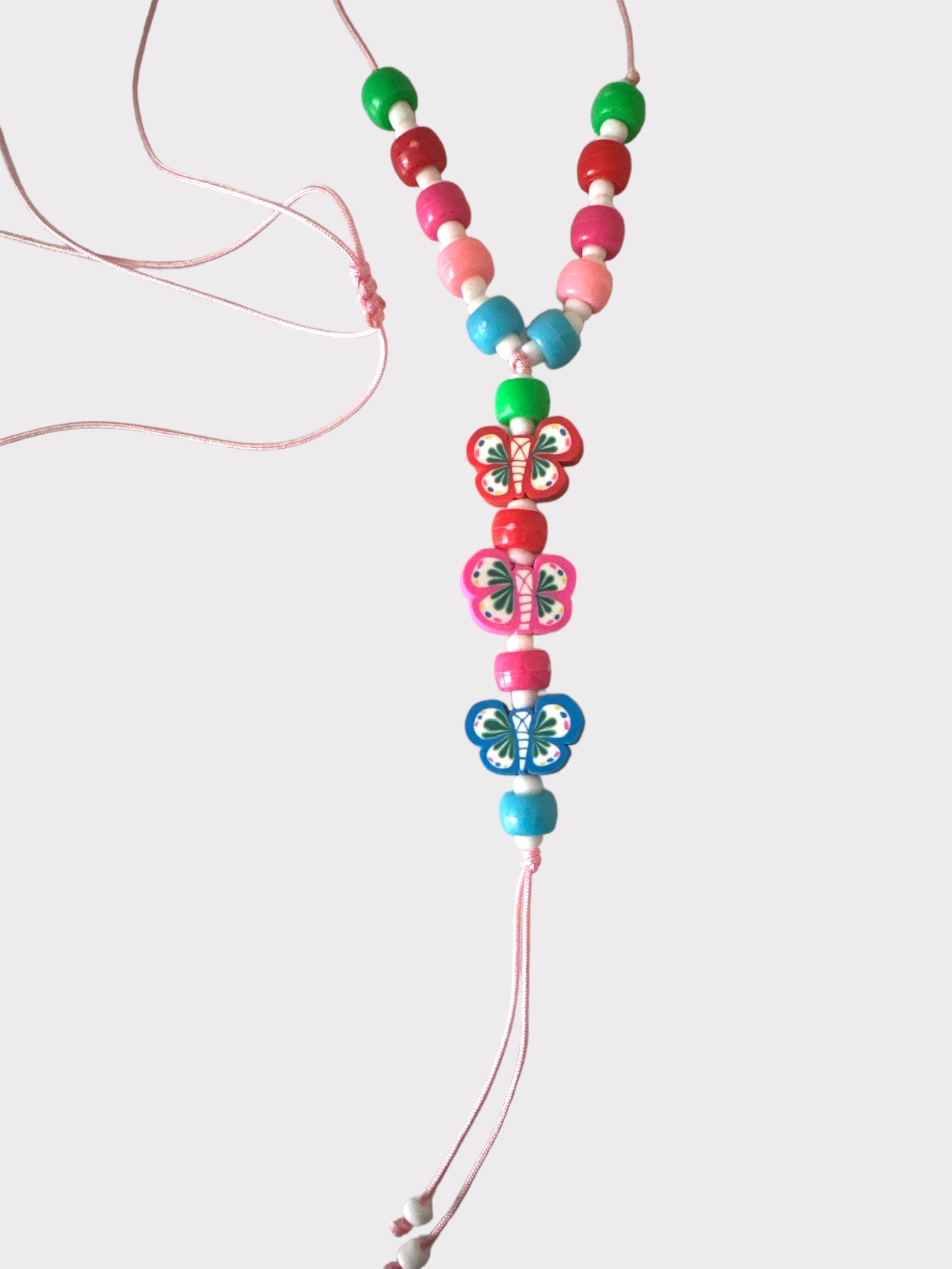 Χειροποίητο μακρύ κολιέ με κορδόνι, πολύχρωμες ακρυλικές χάντρες και κρεμαστές φίμο πολύχρωμες πεταλούδες με τελειώματα κορδόνια.