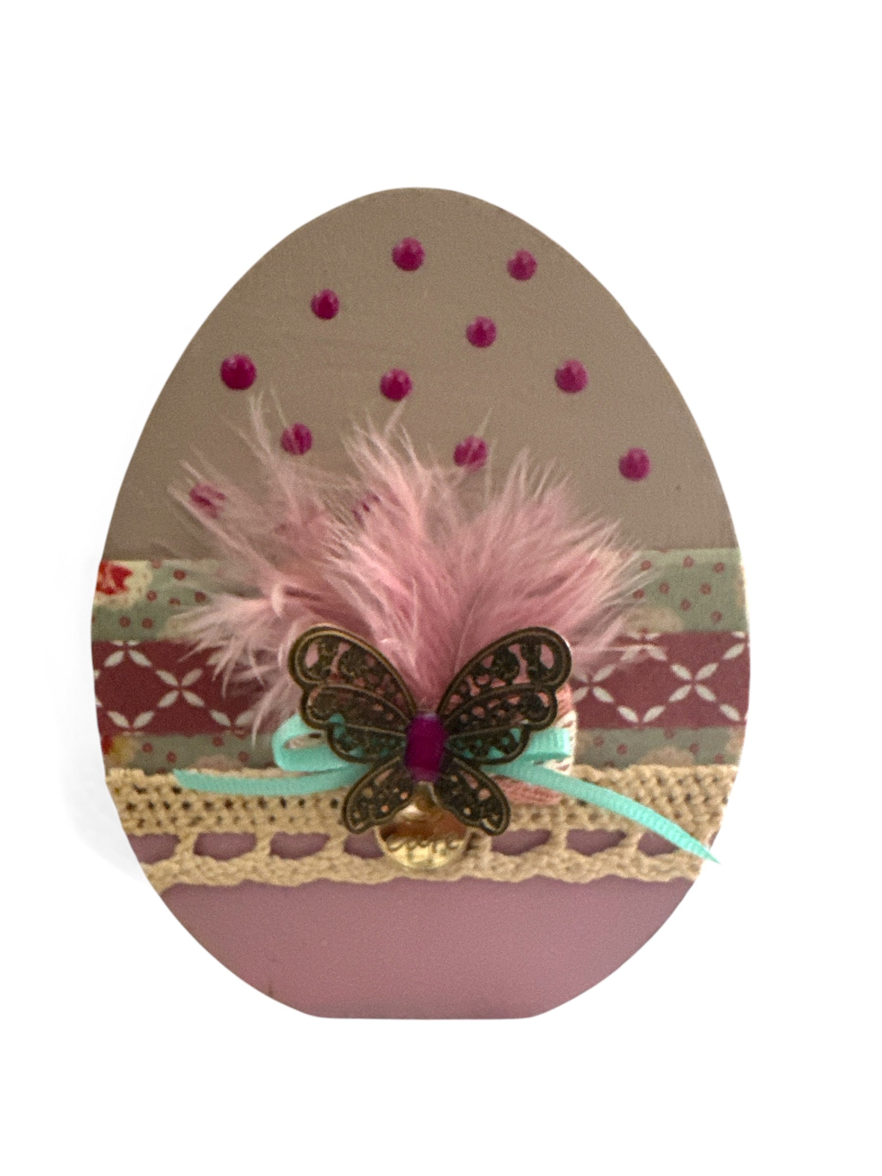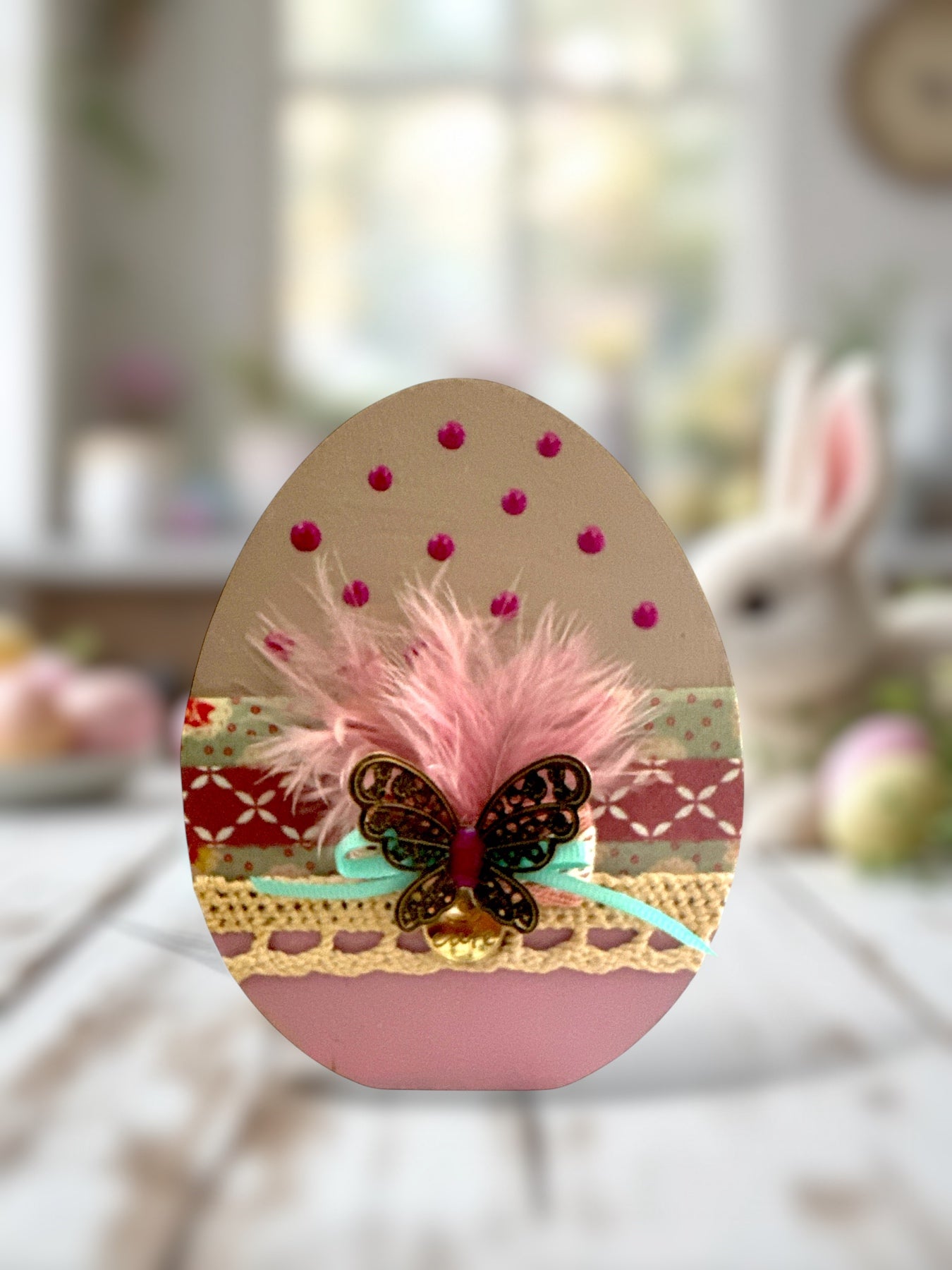 Φέτος το Πάσχα, στολίστε το σπίτι σας με ένα μοναδικό και χειροποίητο διακοσμητικό που θα σας ταξιδέψει στην καρδιά της άνοιξης! Ένα ξύλινο αυγό, σμιλεμένο με αγάπη και στολισμένο με φλοράλ και δαντελένιες κορδέλες που θυμίζουν την ανθισμένη φύση, ένα φυσικό φτερό που συμβολίζει την ανάσταση και φιογκάκια που προσθέτουν μια παιχνιδιάρικη πινελιά. Την παράσταση κλέβει μια μεταλλική vintage πεταλούδα, που φέρνει στο νου τις γλυκές αναμνήσεις του παλιού, καλού καιρού.