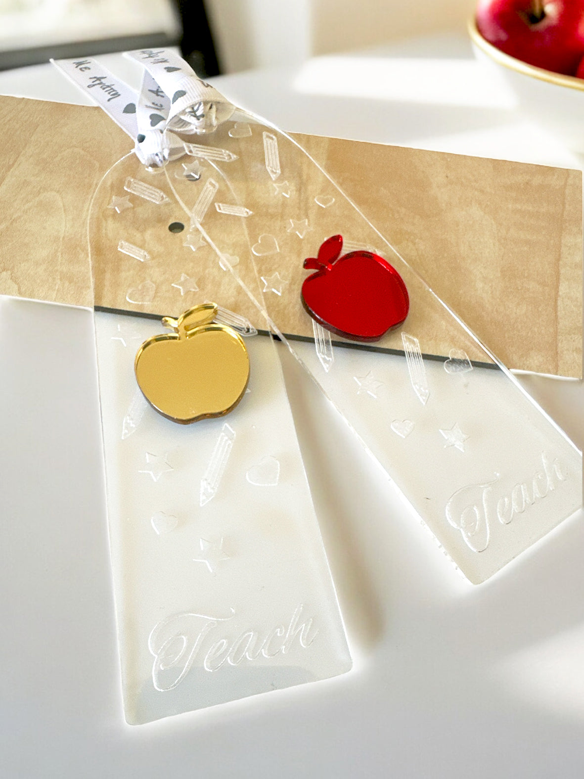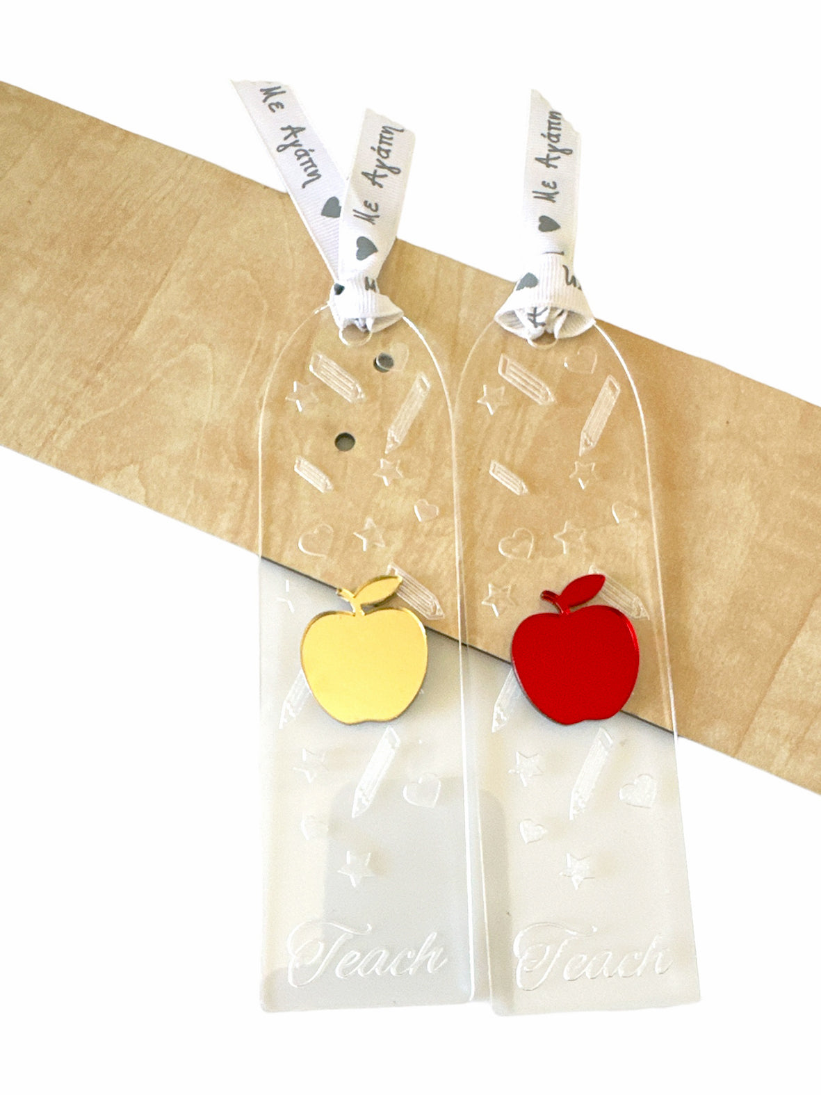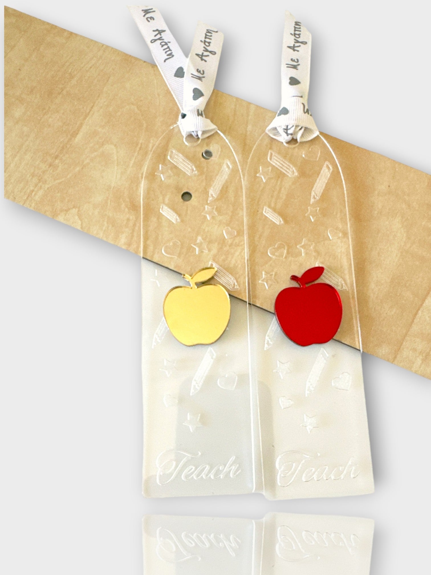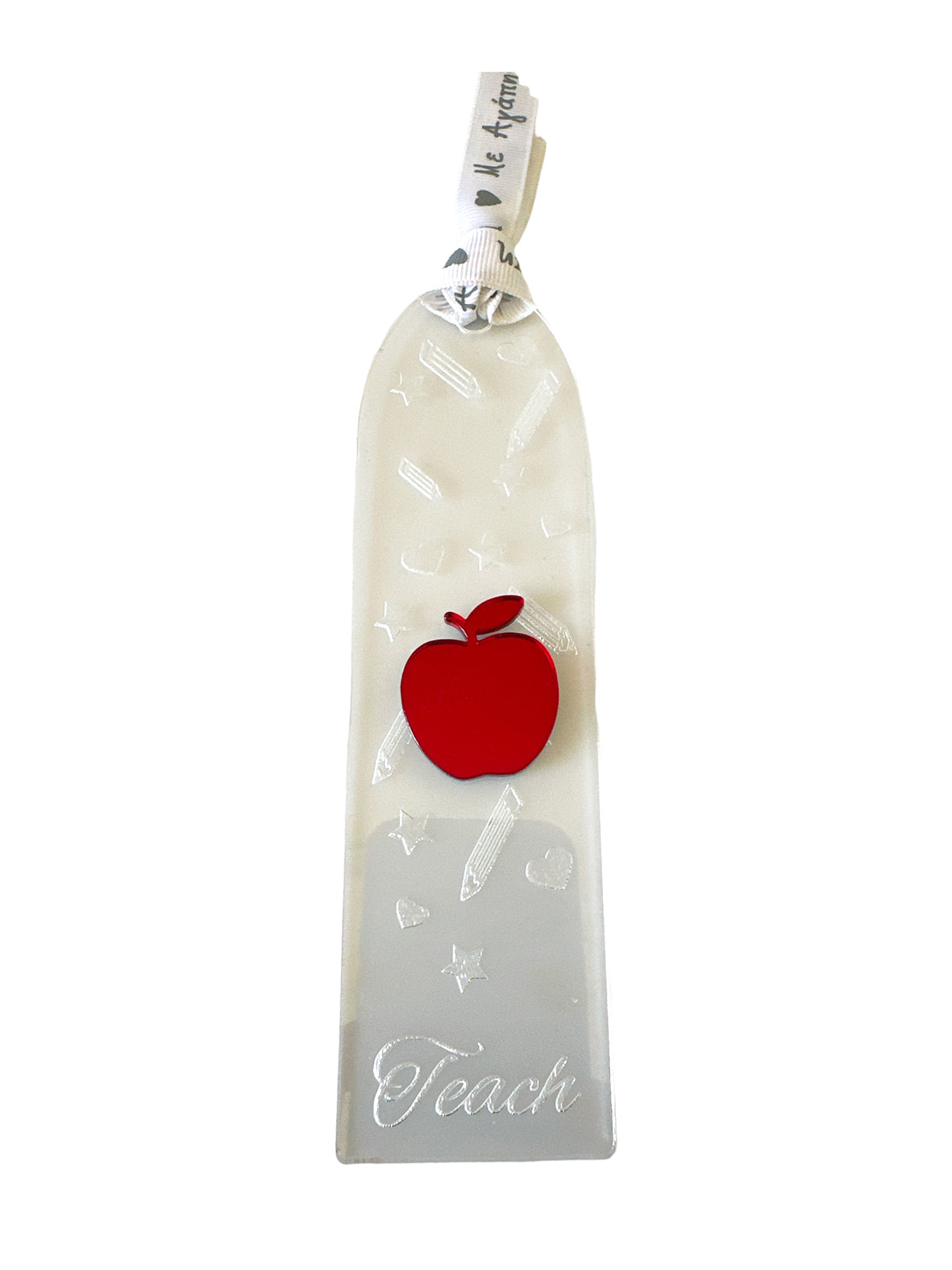Χειροποίητος σελιδοδείκτης από διάφανο πλεξιγκλάς με χαραγμένη την λέξη Teach καθώς και διάφορα σχέδια σε όλη την επιφάνεια. Επάνω υπάρχει μηλαράκι από πλεξιγκλάς καθρέφτη και γκρο κορδελίτσα Με αγάπη