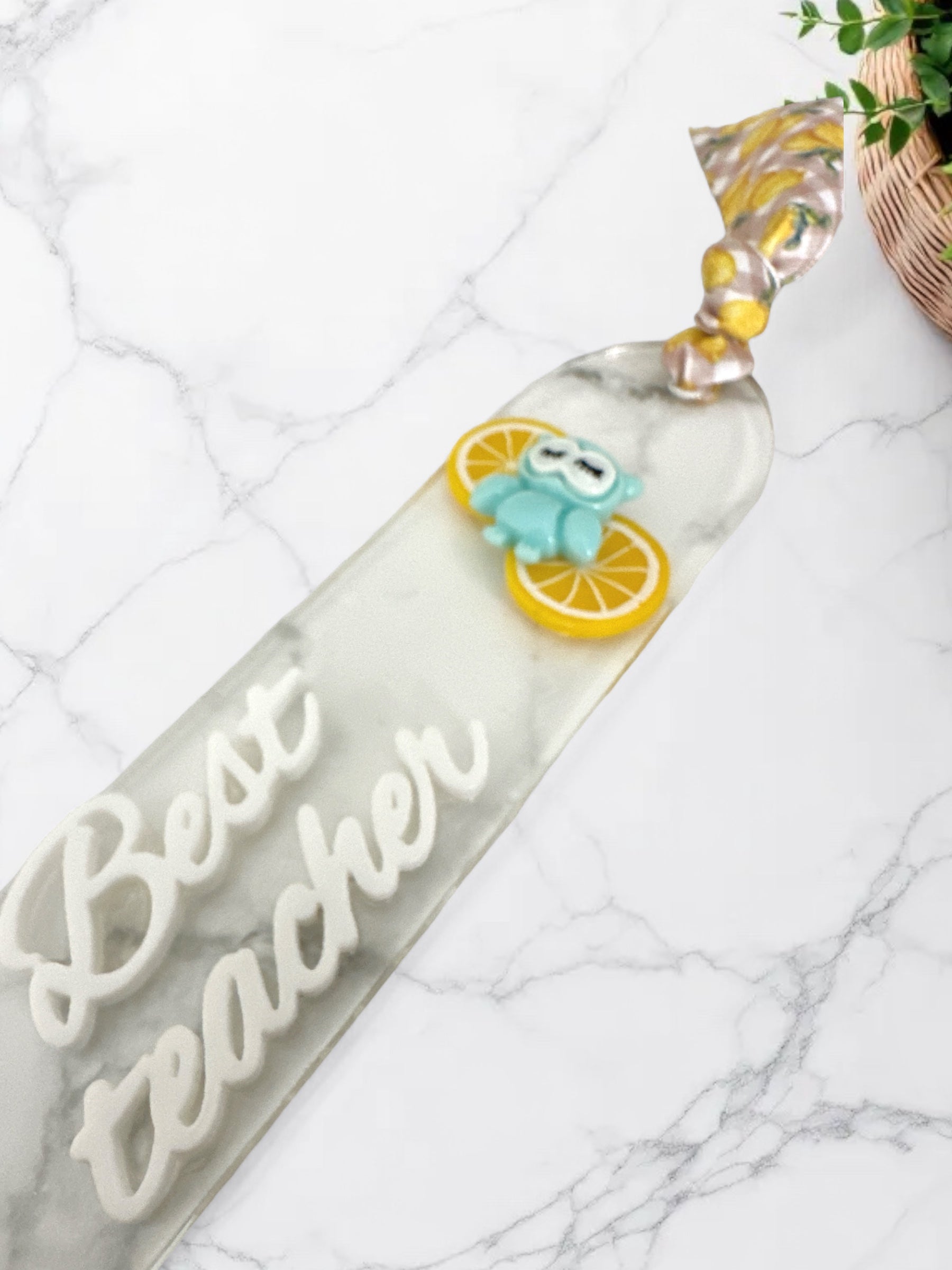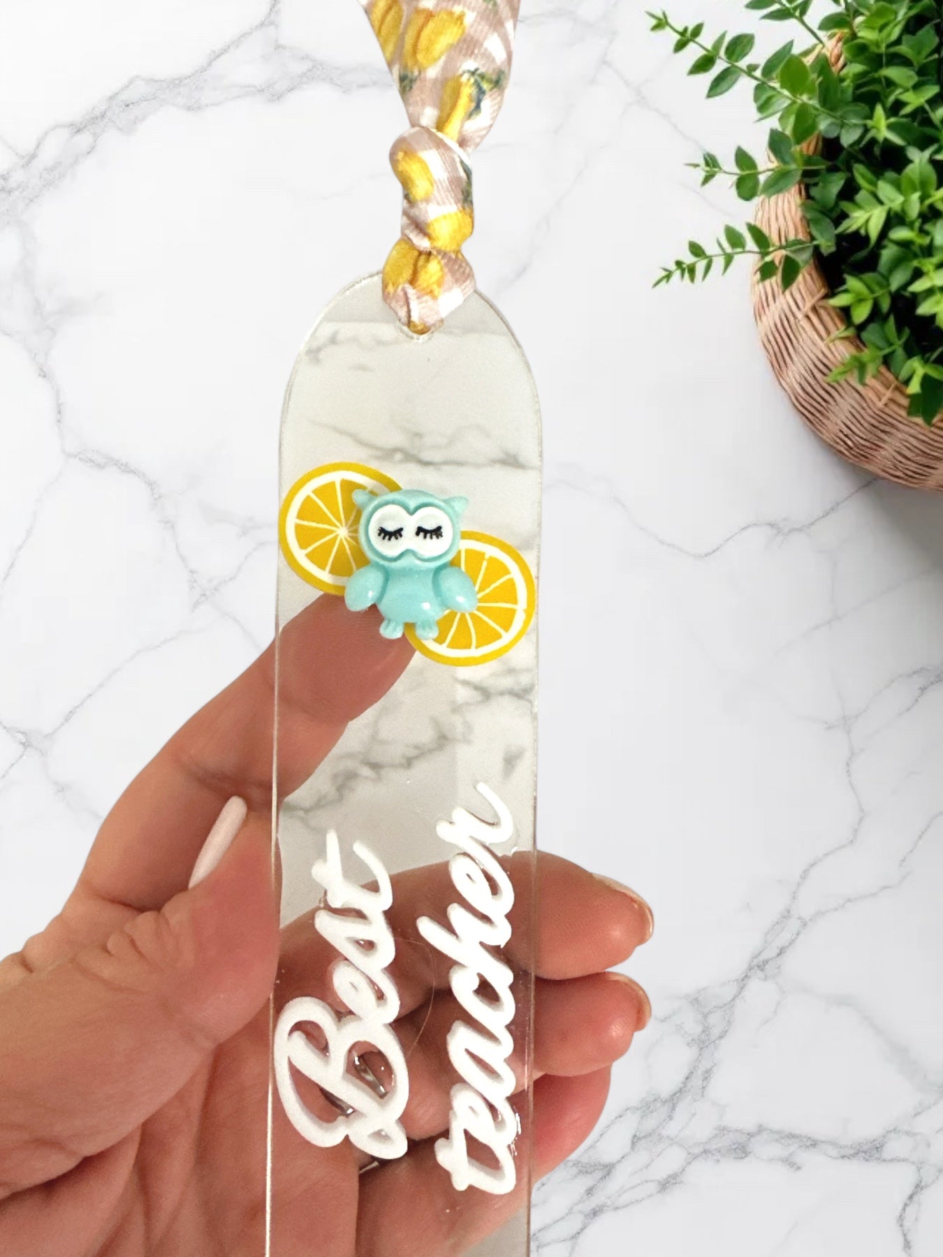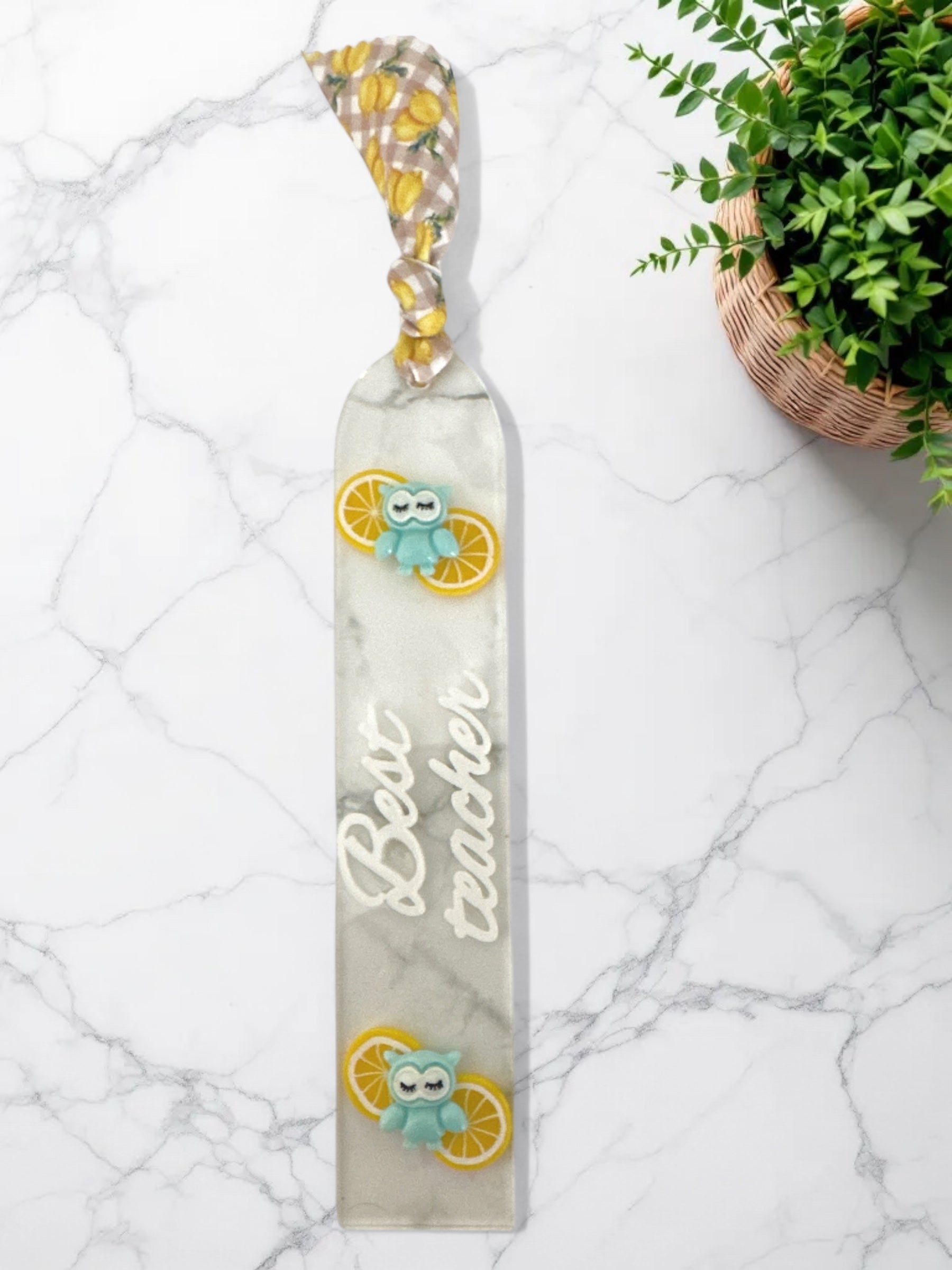 Καλοκαιρινός χειροποίητος σελιδοδείκτης από διάφανο πλεξιγκλάς, διακοσμημένος με δροσιστικά λεμονάκια και χαριτωμένη γαλάζια κουκουβάγια. Μια ευφάνταστη επιλογή δώρου για τη δασκάλα, ιδανική για καλοκαιρινό αποχαιρετισμό.