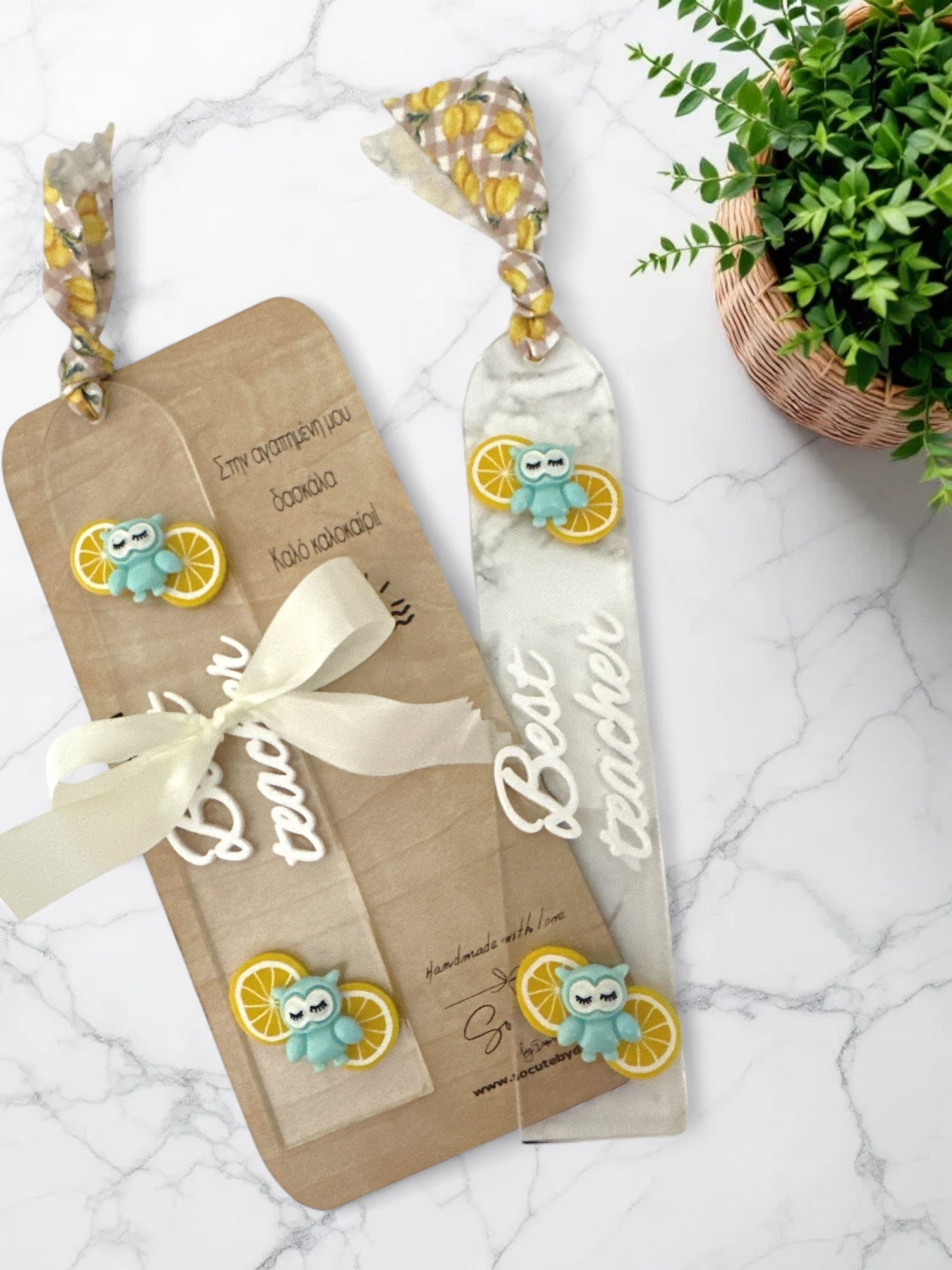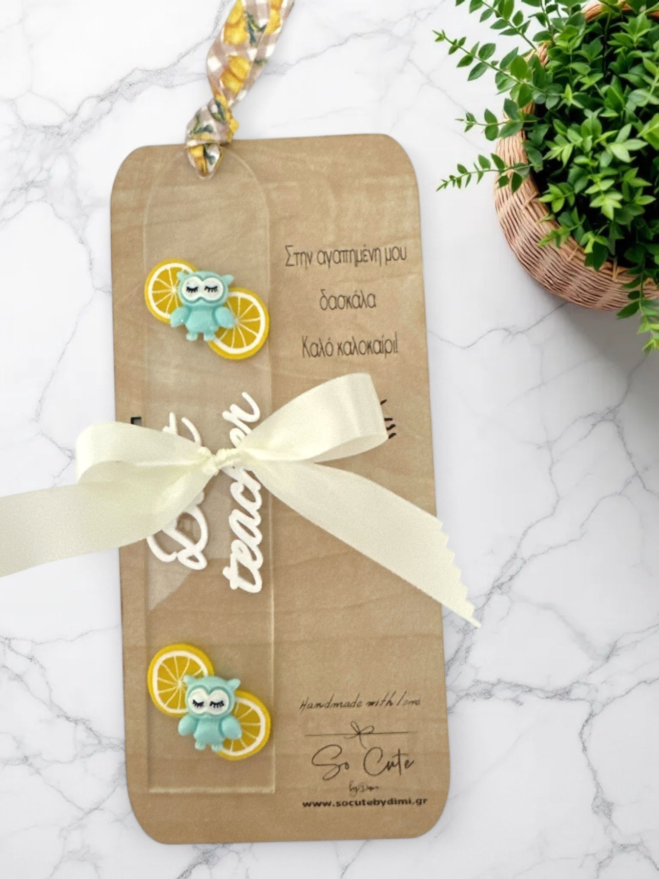 Διακόσμηση: Λεμονάκια, γαλάζια κουκουβάγια, επιγραφή “Best teacher”