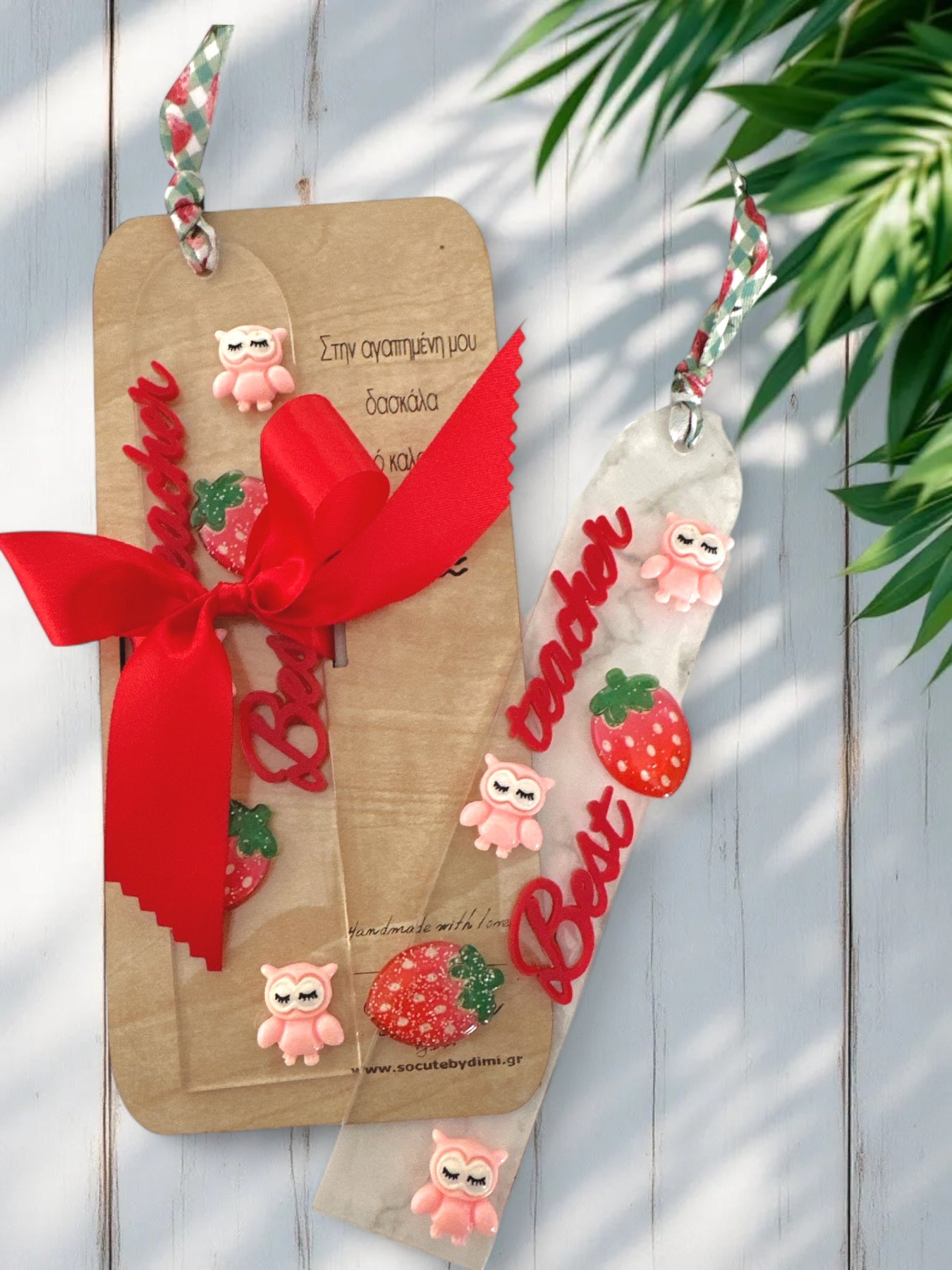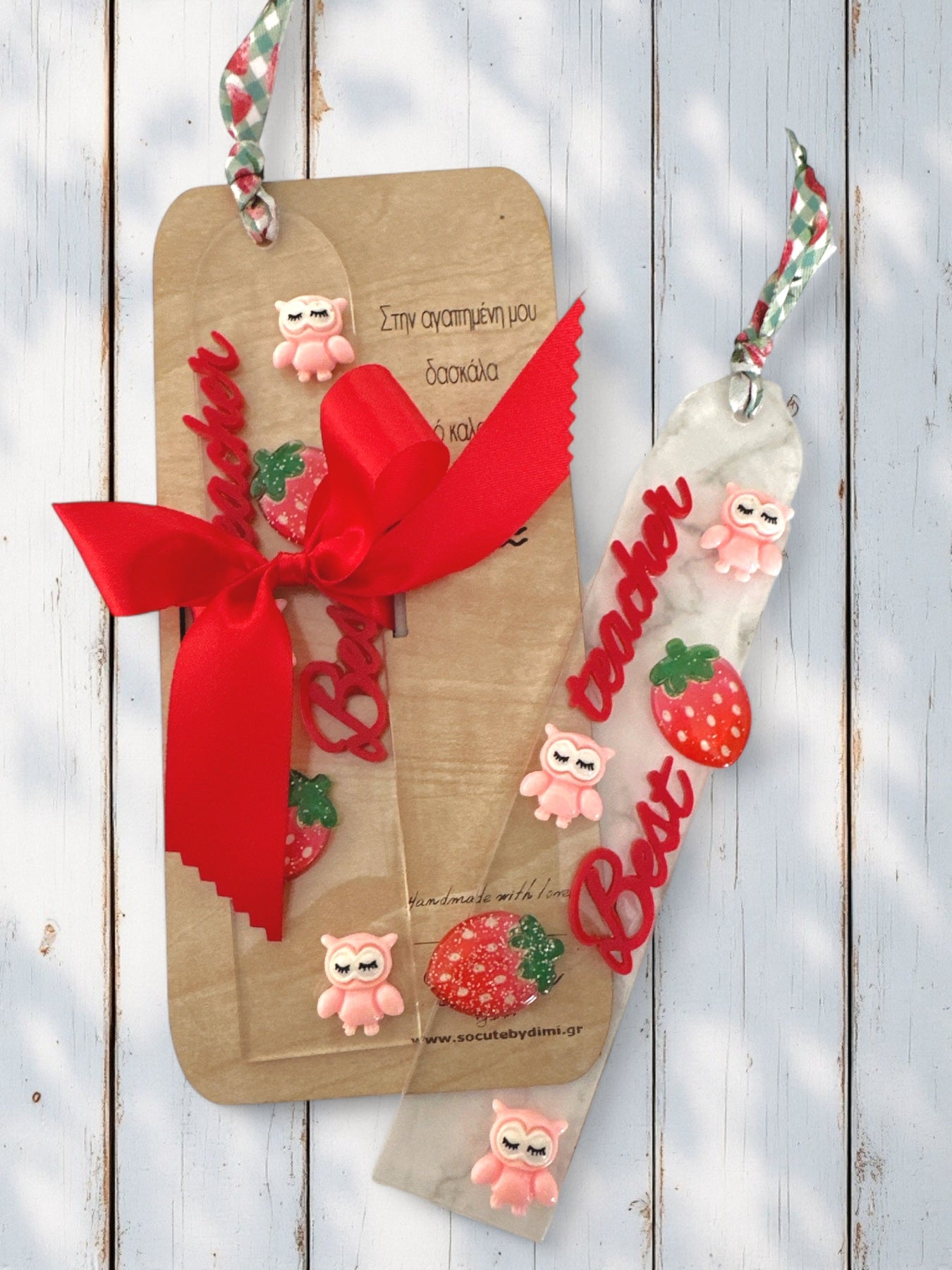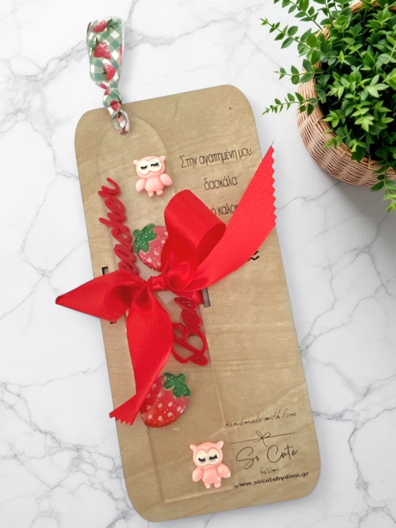 Στολισμός: Φράουλα, κουκουβάγια, κόκκινη κορδέλα, επιγραφή “Best Teacher”