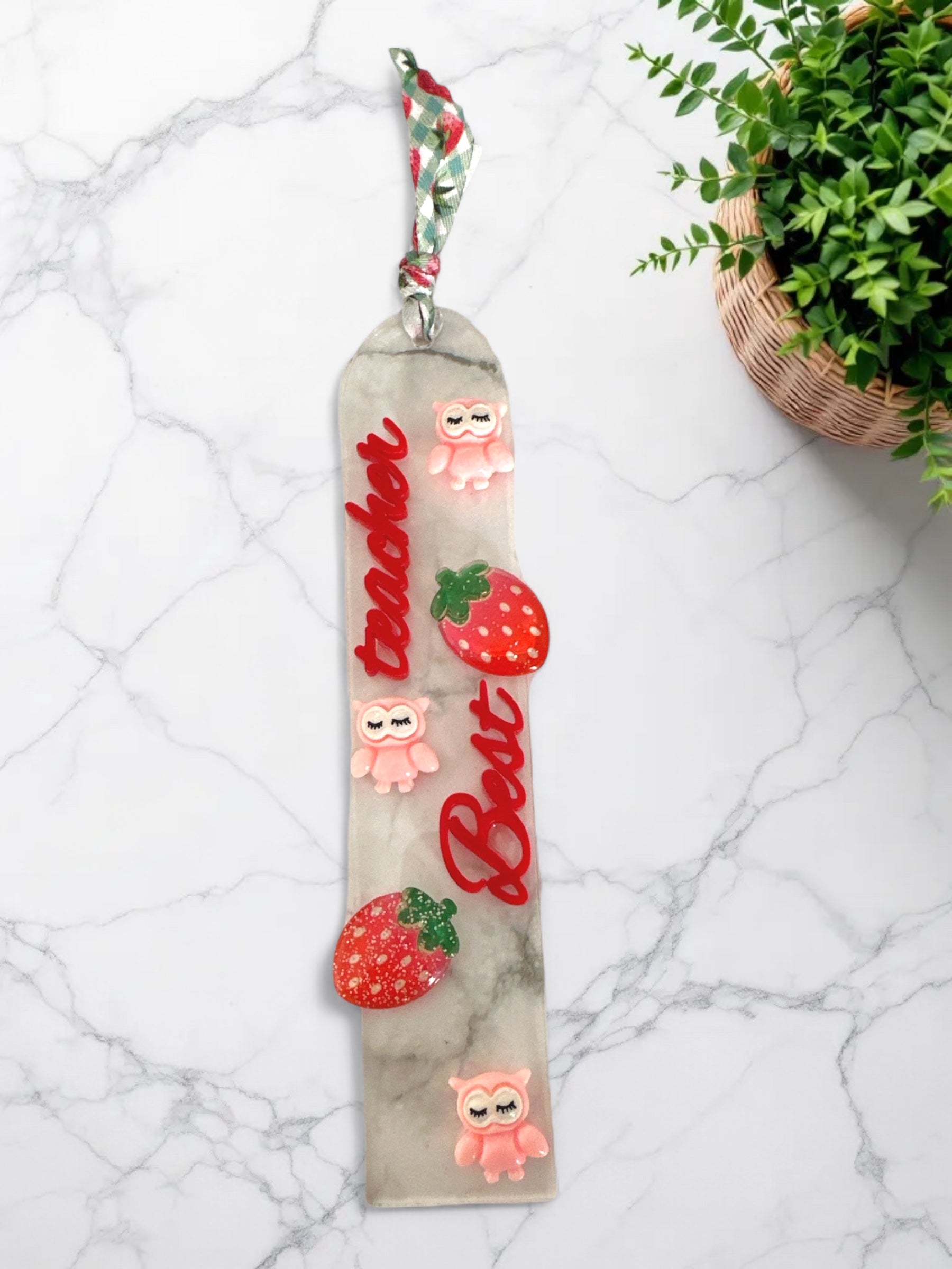 Χειροποίητος σελιδοδείκτης από διάφανο πλεξιγκλάς, διακοσμημένος με κόκκινες φράουλες, ροζ κουκουβάγιες και την επιγραφή "Best Teacher". Μια γλυκιά και παιχνιδιάρικη πρόταση για να ευχαριστήσετε τη δασκάλα στο τέλος της χρονιάς.