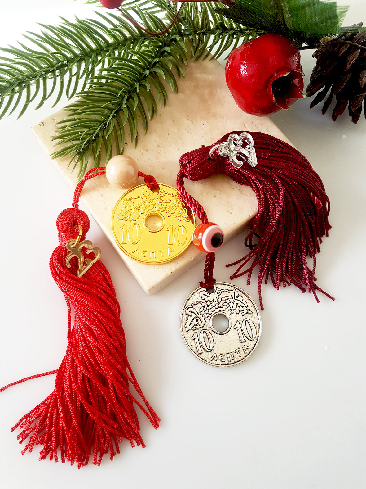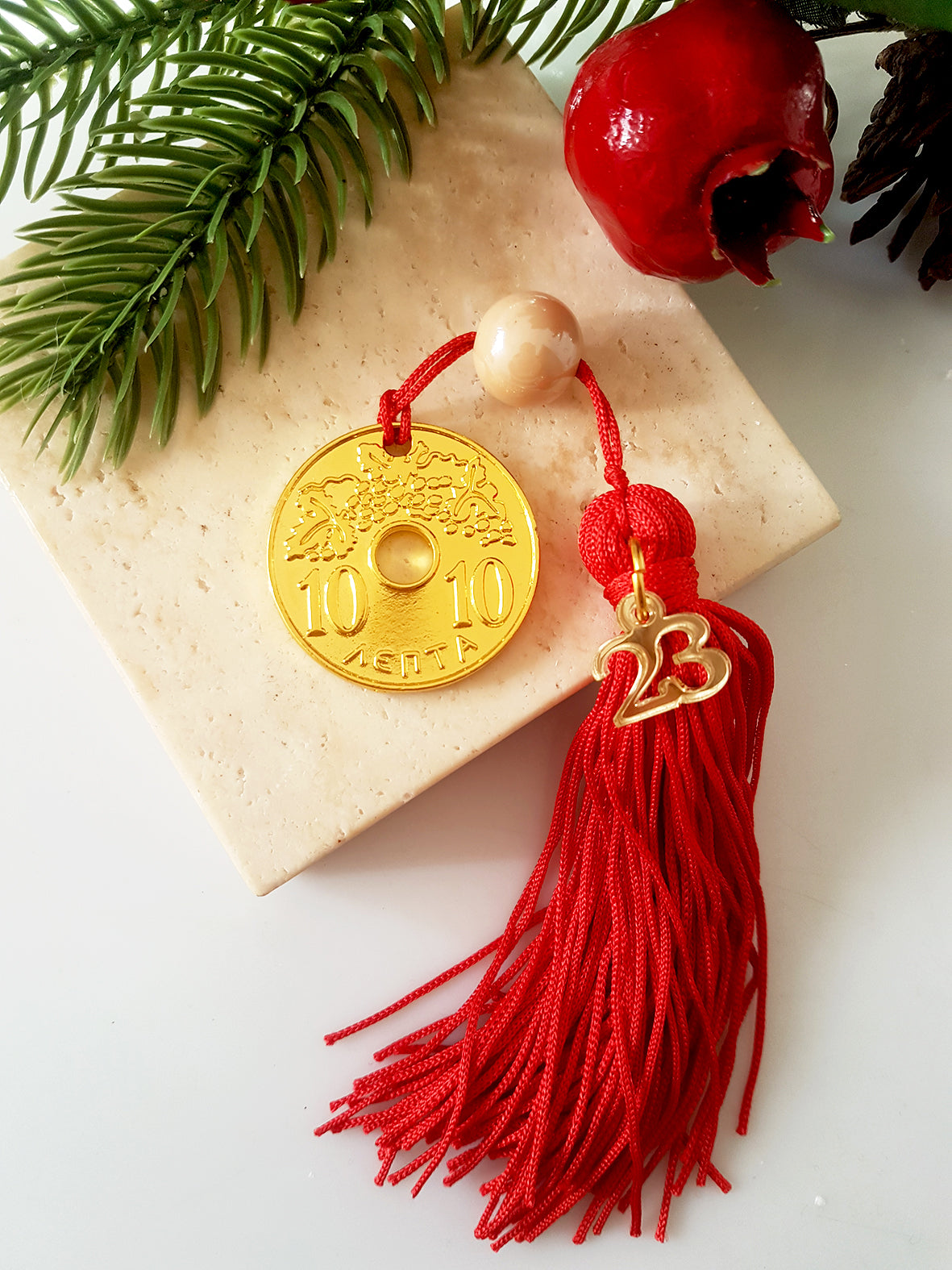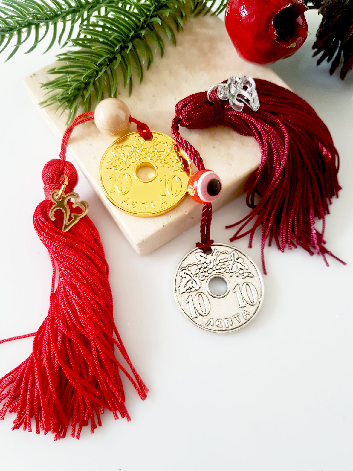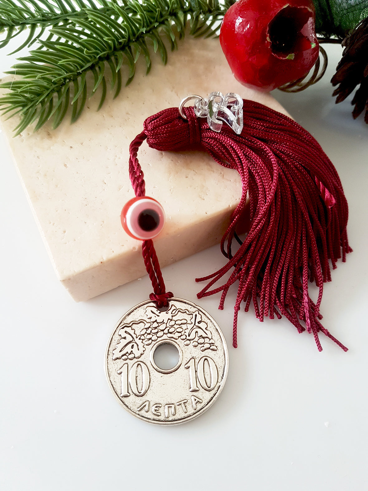 Χειροποίητο γούρι με μεταλλικό vintage νόμισμα και φούντα, μήκος 24 εκατοστά.