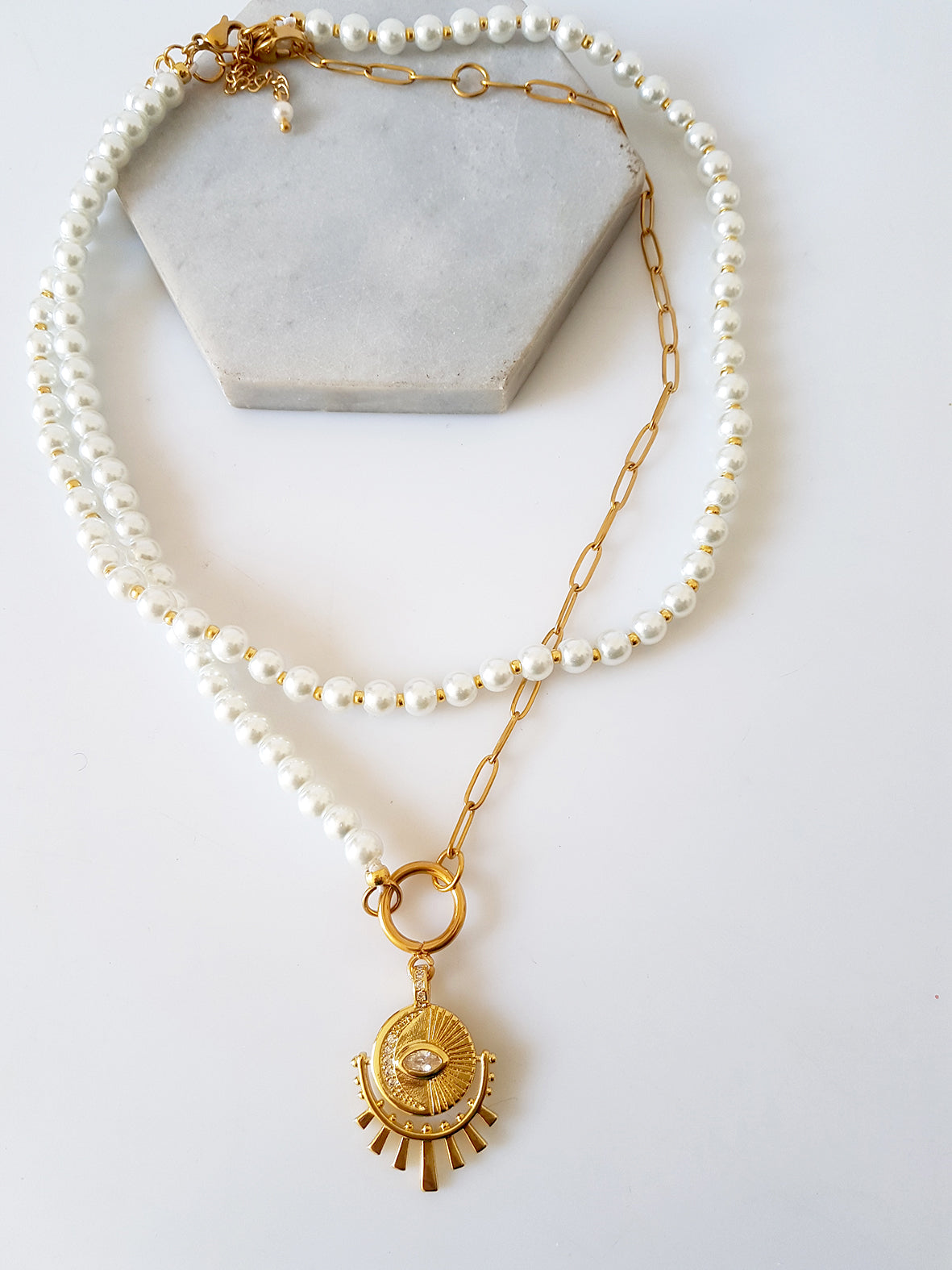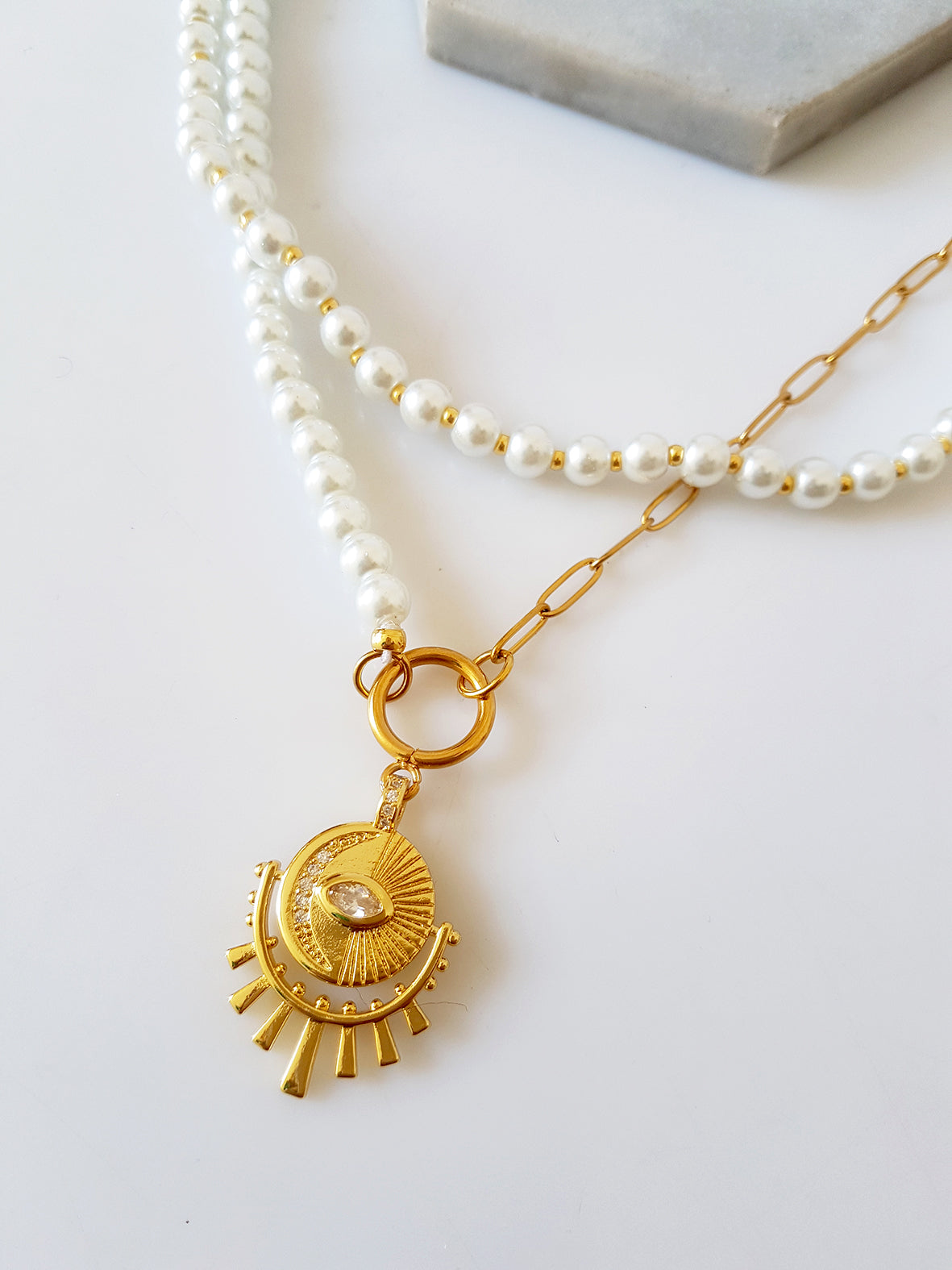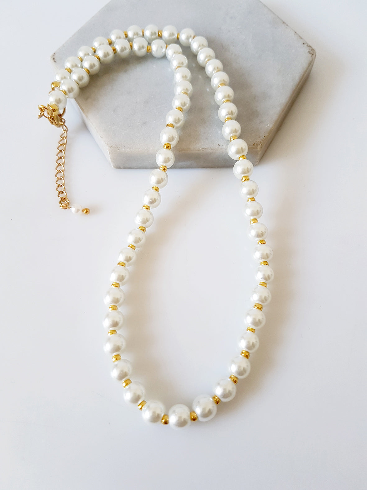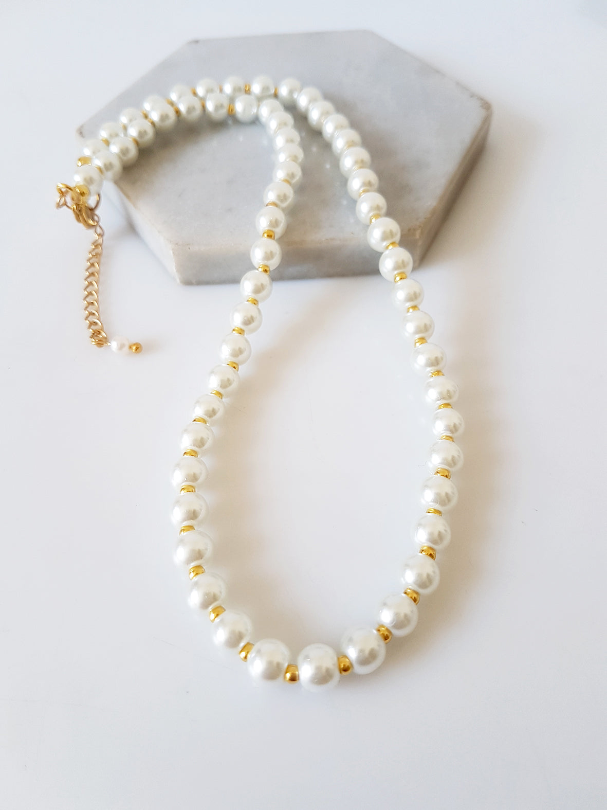 Χειροποίητο κοντό κολιέ με μονή σειρά πέρλες 6mm και επίχρυσα στοιχεία από ορείχαλκο. Περίμετρος 40 εκατοστά συν 5 εκατοστά αλυσίδα επέκτασης.