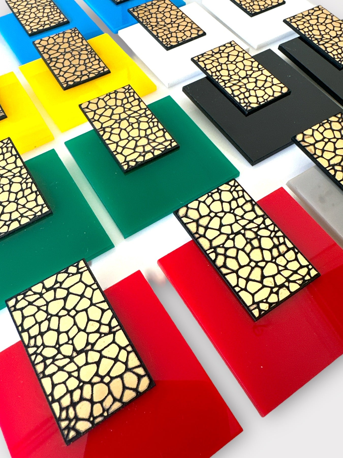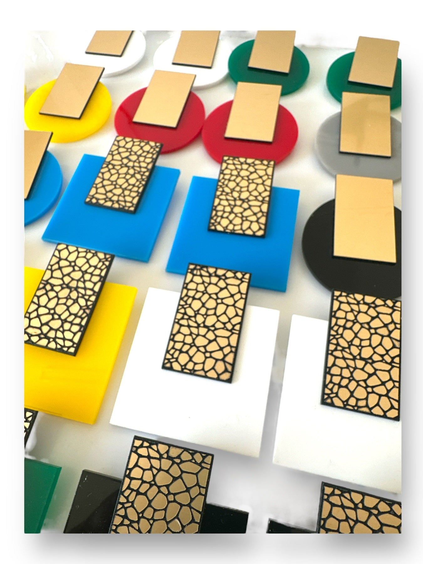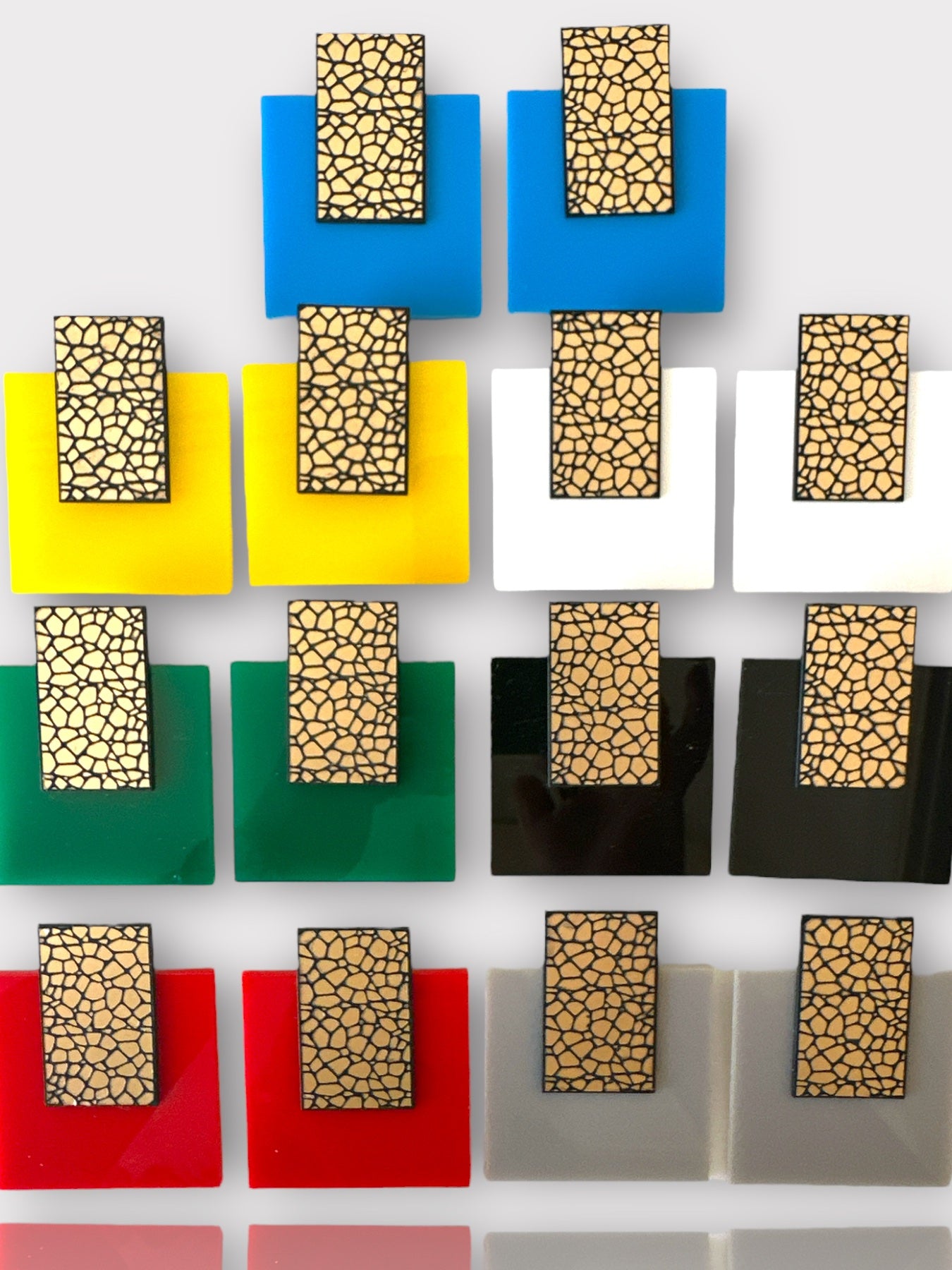 Χειροποίητα καρφωτά σκουλαρίκια σε τετράγωνο σχήμα με κάθετο ορθογώνιο τμήμα με εφέ πέτρας, από πλεξιγκλάς.