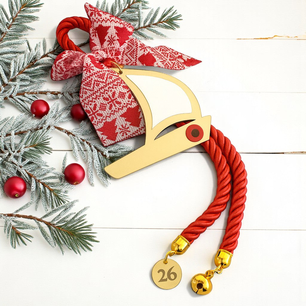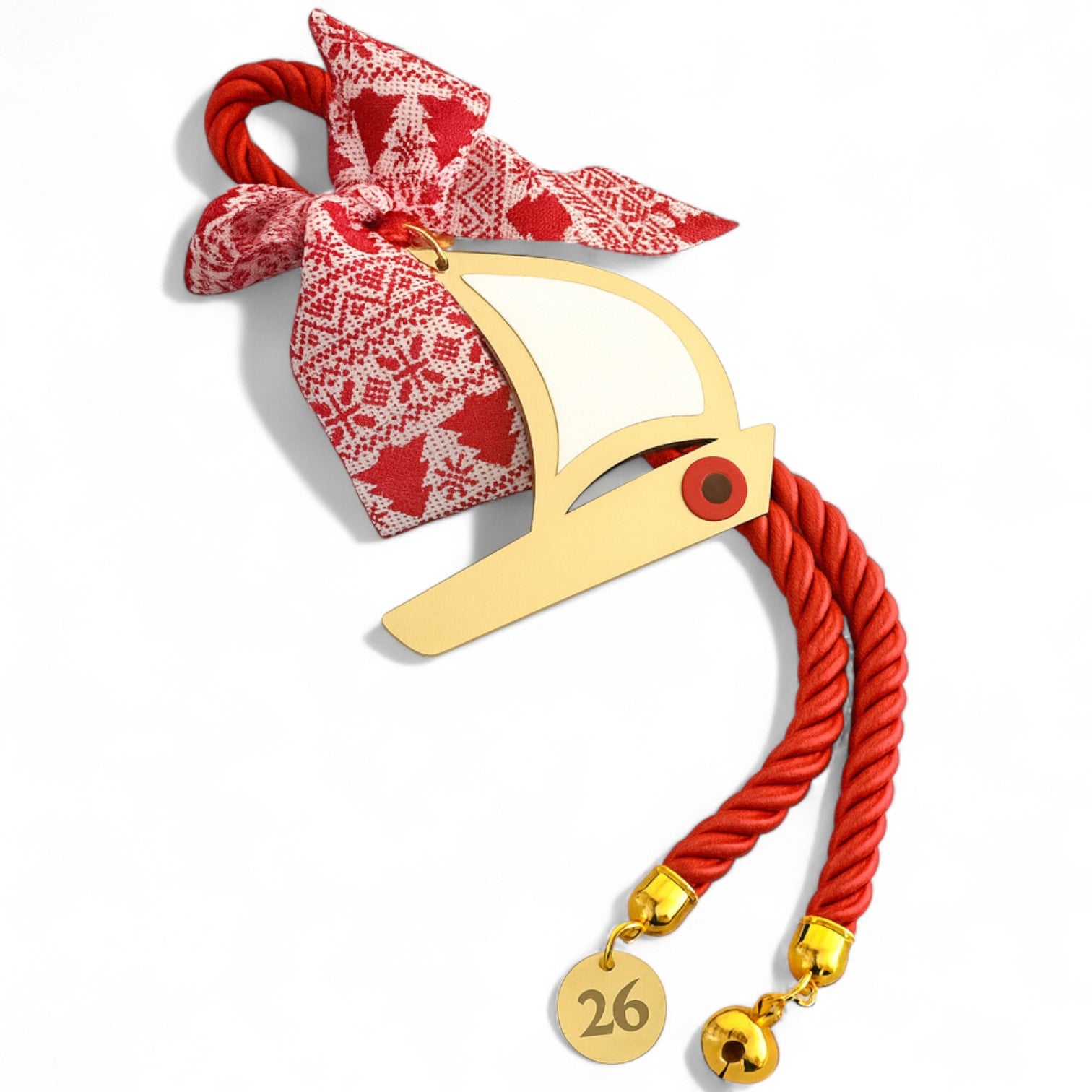 Χειροποίητο κρεμαστό γούρι καραβάκι 2026 από ποιοτικό plexiglass καθρέφτη σε χρυσό, με μάτι προστασίας και κόκκινο σατέν στριφτό κορδόνι. Ολοκληρώνεται με φιόγκο και μεταλλικό στοιχείο 2026, συνδυάζοντας την ελληνική παράδοση με πολυτελές, μοντέρνο design.