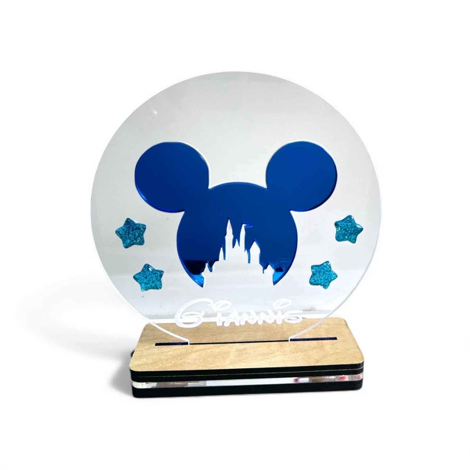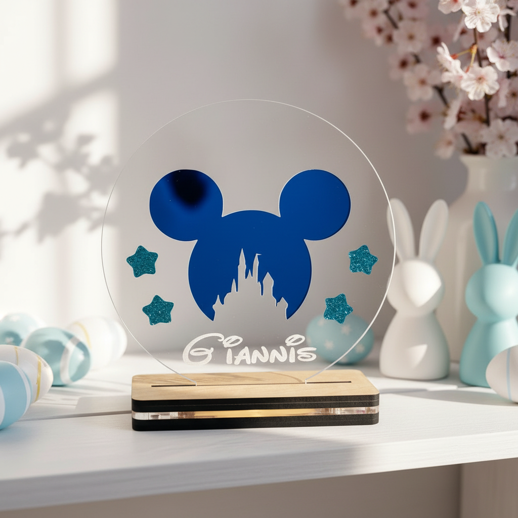 Επιτραπέζιο LED φωτιστικό με φιγούρα Μίκυ, σχεδιασμένο για παιδικά δωμάτια και θεματικές συλλογές δώρου υψηλής αναγνωρισιμότητας. Η ακρυλική πλακέτα διακοσμείται με απλικέ φιγούρα Μίκυ από πλεξιγκλάς καθρέφτη, σε συνδυασμό με διακοσμητικά αστεράκια, δημιουργώντας ένα φωτεινό και playful αποτέλεσμα.