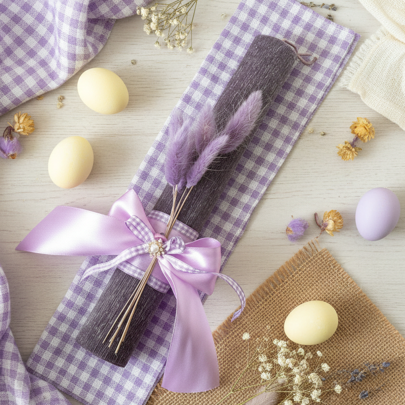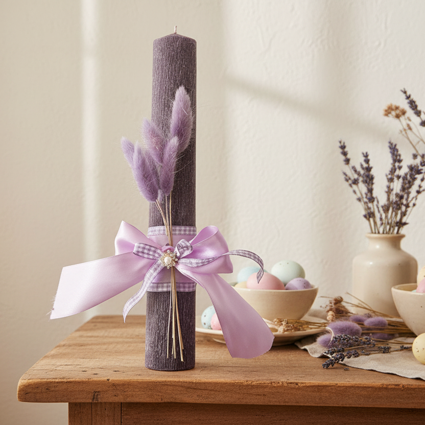 🤍✨ Χειροποίητη Πασχαλινή Λαμπάδα με Μωβ Στάχυ