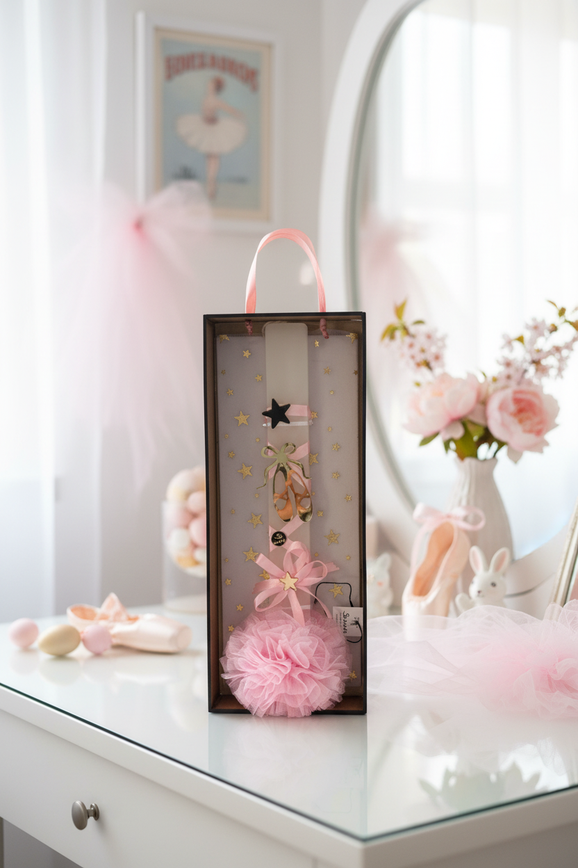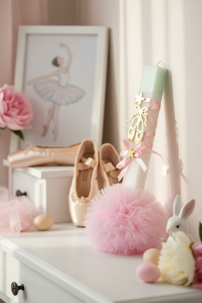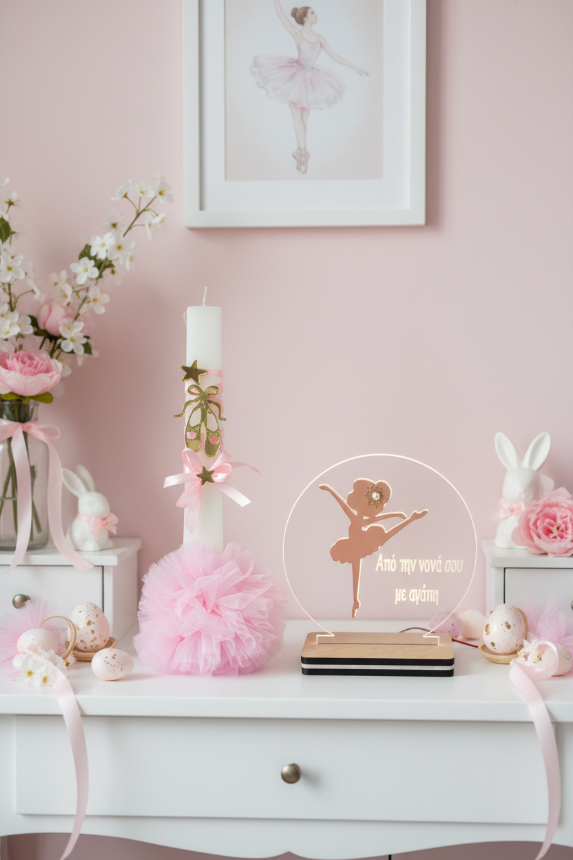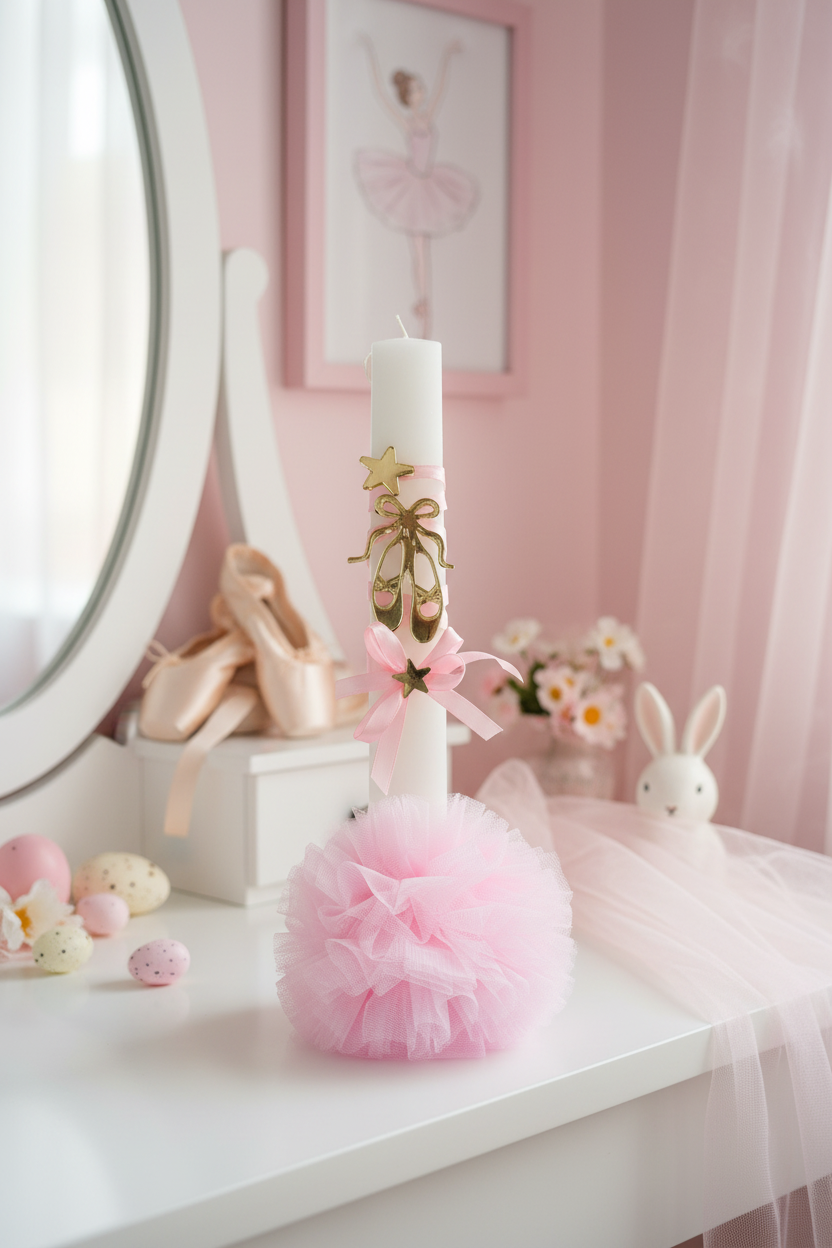 Χειροποίητη πασχαλινή λαμπάδα με αρωματικό κερί, πλούσιο στολισμό από πουέντ πλεξιγκλάς gold mirror, αστέρια, κορδέλες, φιόγκους και μεγάλο τούλινο πον πον, σχεδιασμένη για κορίτσια που αγαπούν το ρομαντικό και παραμυθένιο ύφος. Προαιρετικά συνδυάζεται με επιτραπέζιο φωτιστικό LED με απλικέ μπαλαρίνα από ροζ χρυσό καθρέφτη και αφιέρωση, μετατρέποντας τη λαμπάδα σε ολοκληρωμένο πασχαλινό δώρο υψηλού gift value. Η δυνατότητα αλλαγής κειμένου/αφιέρωσης με έξτρα χρέωση αποτελεί ισχυρό πλεονέκτημα πώλησης, καθώς τα προσωποποιημένα δώρα προτιμώνται έντονα από νονούς και γονείς. Διατίθεται και προαιρετική συσκευασία σε ξύλινο κουτί στολισμένο ασορτί.