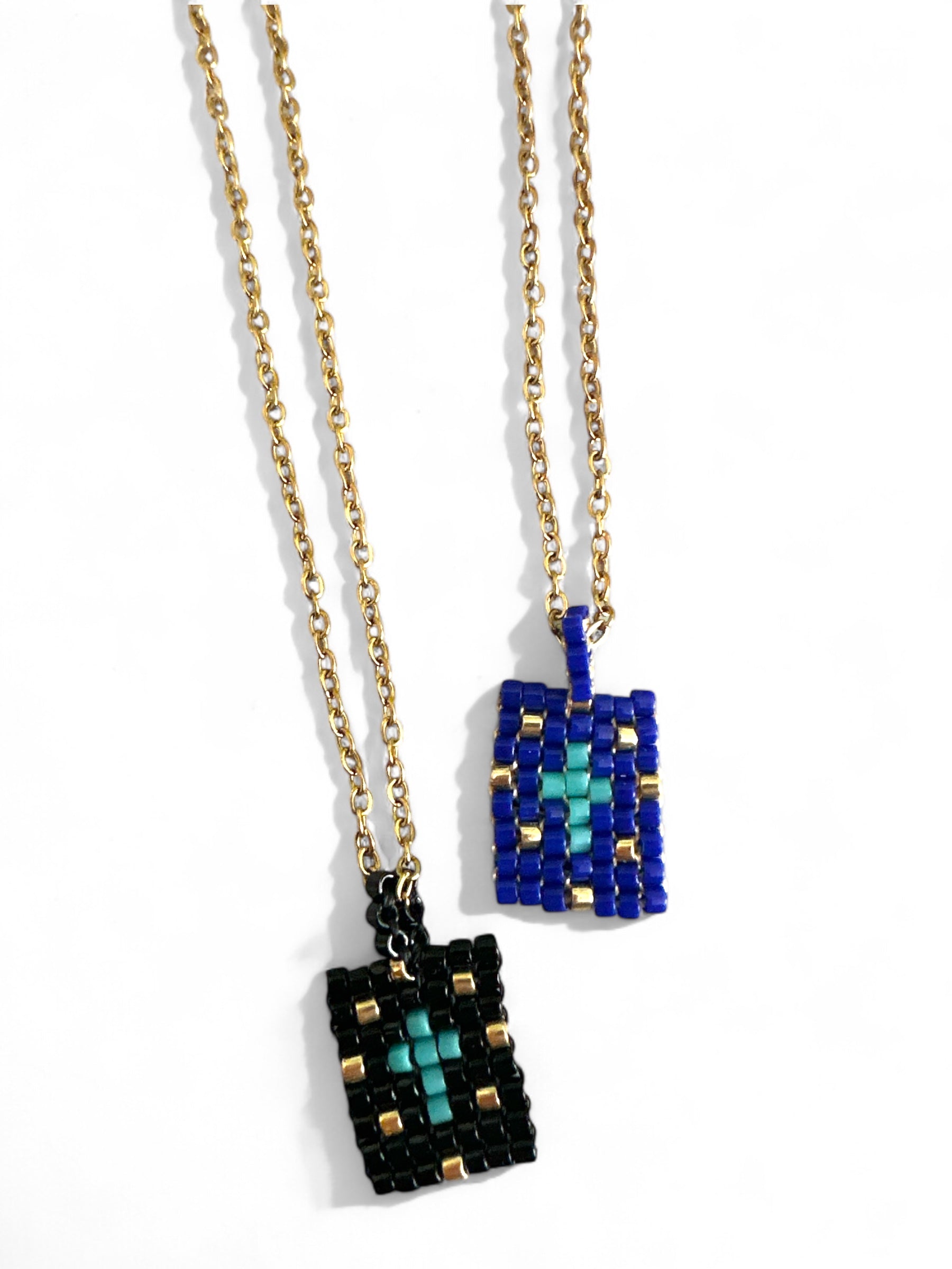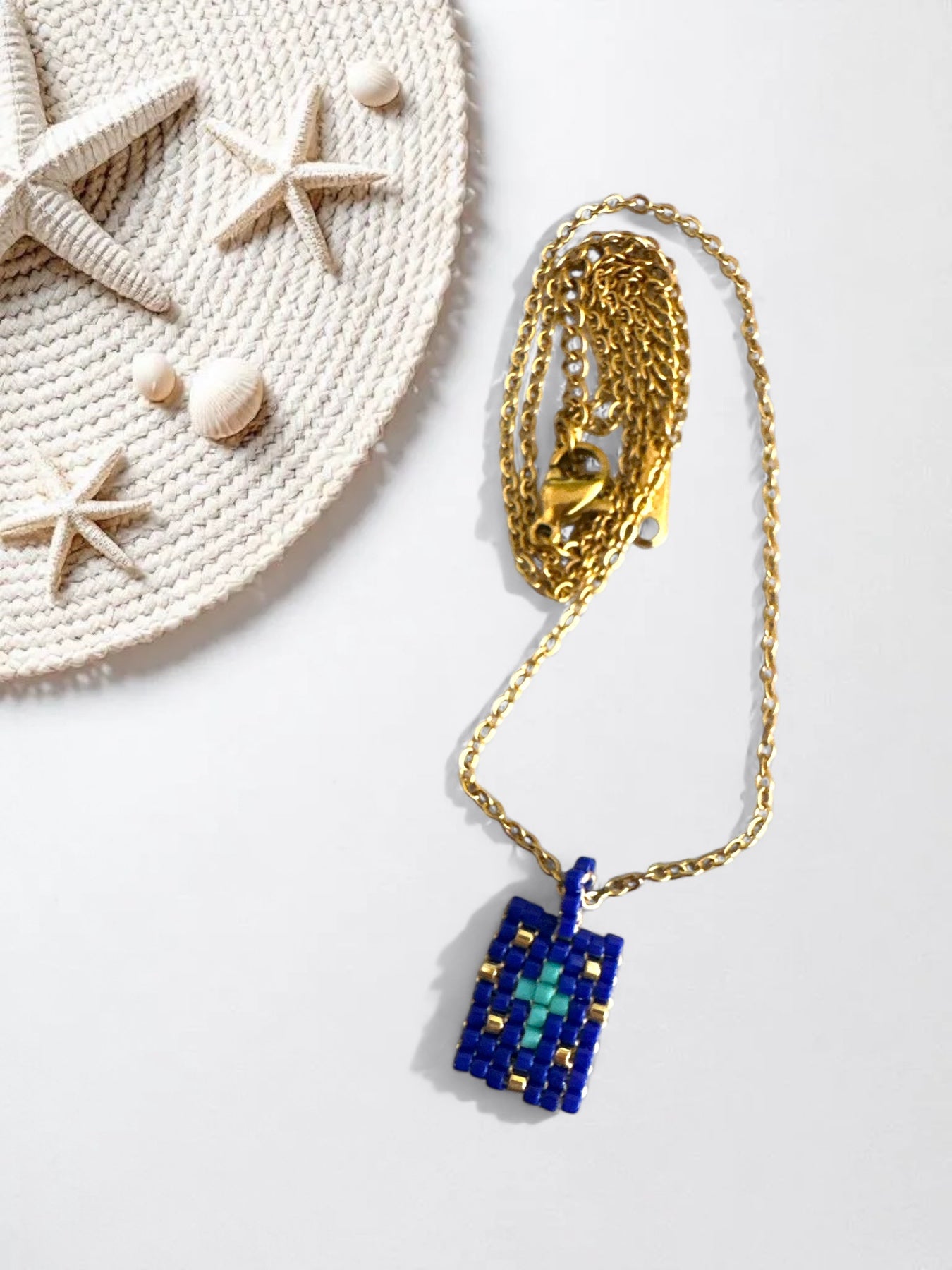 Μικρό αλλά mighty! Ένα γεωμετρικό, χειροποίητο κολιέ με μίνι ορθογώνιο pendant πλεγμένο bead-by-bead με ιαπωνικές Miyuki Delica. Η φωτεινή τιρκουάζ “bar” στο κέντρο πλαισιώνεται από χρυσούς cube beads, ενώ το μαύρο (Noir) ή βαθύ μπλε (Cobalt) background δίνει graphic χαρακτήρα. Η επιχρυσωμένη ατσάλινη αλυσίδα (stainless steel) αντέχει σε θάλασσα & ιδρώτα, για 24/7 wear από το πρωινό beach stroll μέχρι το βραδινό rooftop.