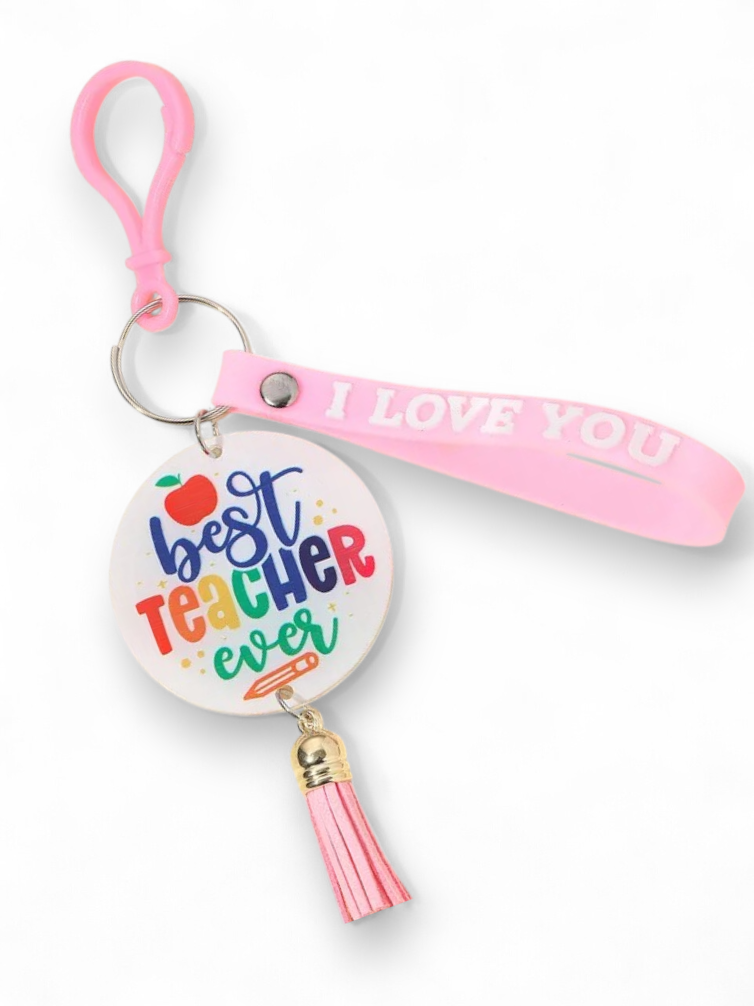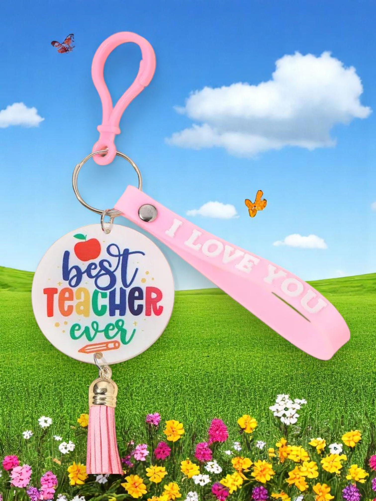 Το Best Teacher Ever – Ροζ Edition είναι ένα στρογγυλό μπρελόκ από πλεξιγκλάς, με τυπωμένο το μήνυμα "Best Teacher Ever" σε υπέροχη καλλιγραφική γραμματοσειρά, πλαισιωμένο από χαρούμενα σχέδια με μηλαράκι και μολυβάκι.
