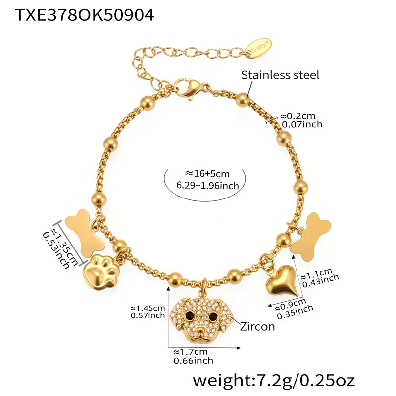 Βραχιόλι από 304 stainless steel με 18K επιχρύσωση PVD. Εμπλουτισμένο με χαριτωμένα charms – πατουσάκι, καρδιά, κοκαλάκι – και κεντρικό charm σκυλάκι με ζιργκόν που δίνει glam αίσθηση.
