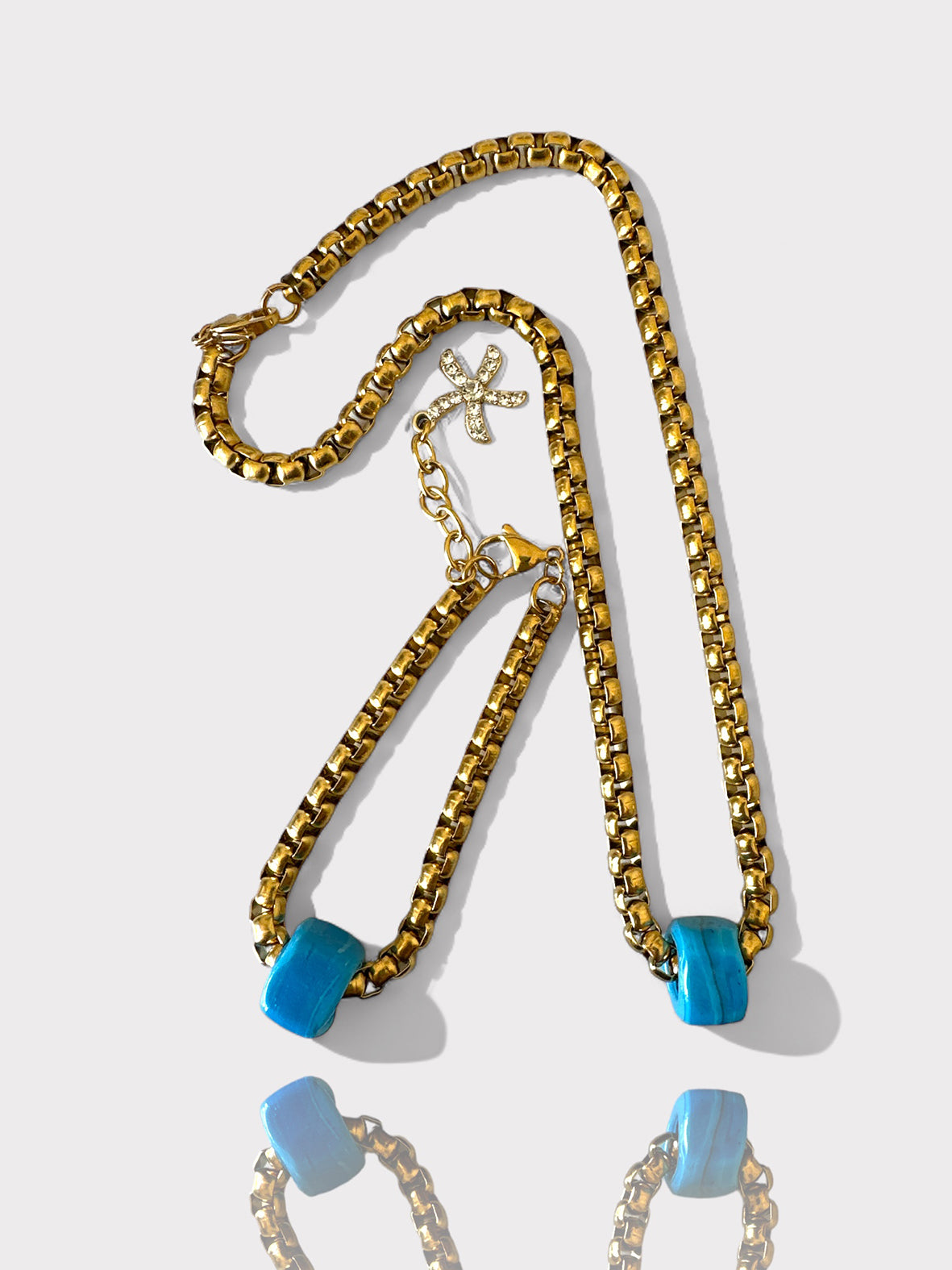 Χειροποίητο κολιέ με χοντρή ατσάλινη αλυσίδα και ακανόνιστο γυάλινο κύβο.