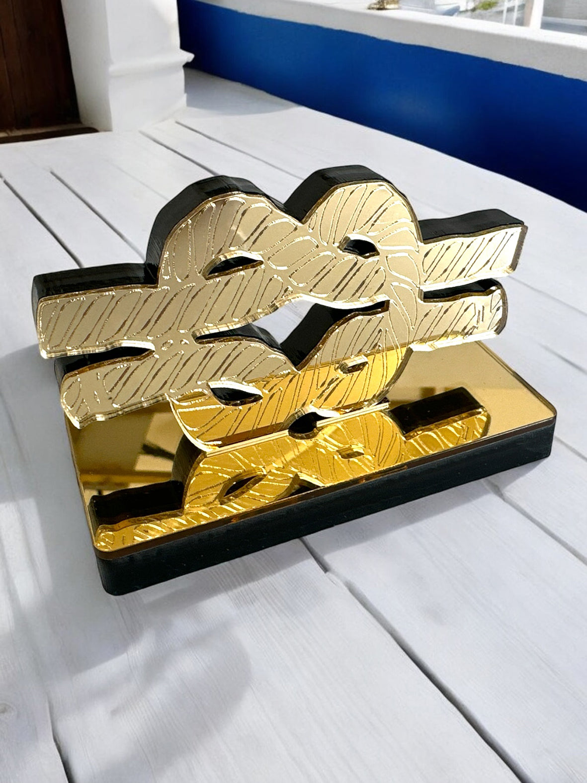 Χειροποίητο επιτραπέζιο διακοσμητικό γούρι ναυτικός κόμπος από πλεξιγκλάς, Το μπροστινό μέρος έχει επικάλυψη από χρυσό καθρέφτη με χάραξη και στέκεται σε βάση επενδυμένη επίσης με χρυσό πλεξιγκλάς καθρέφτη.
