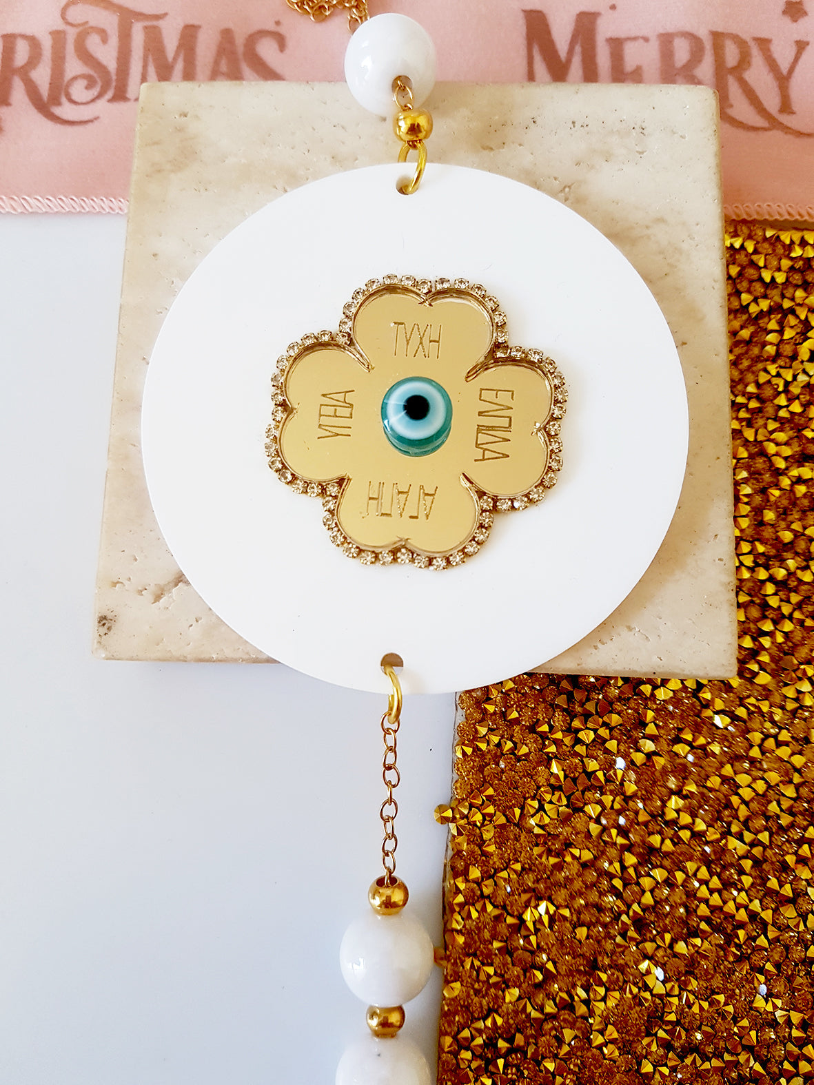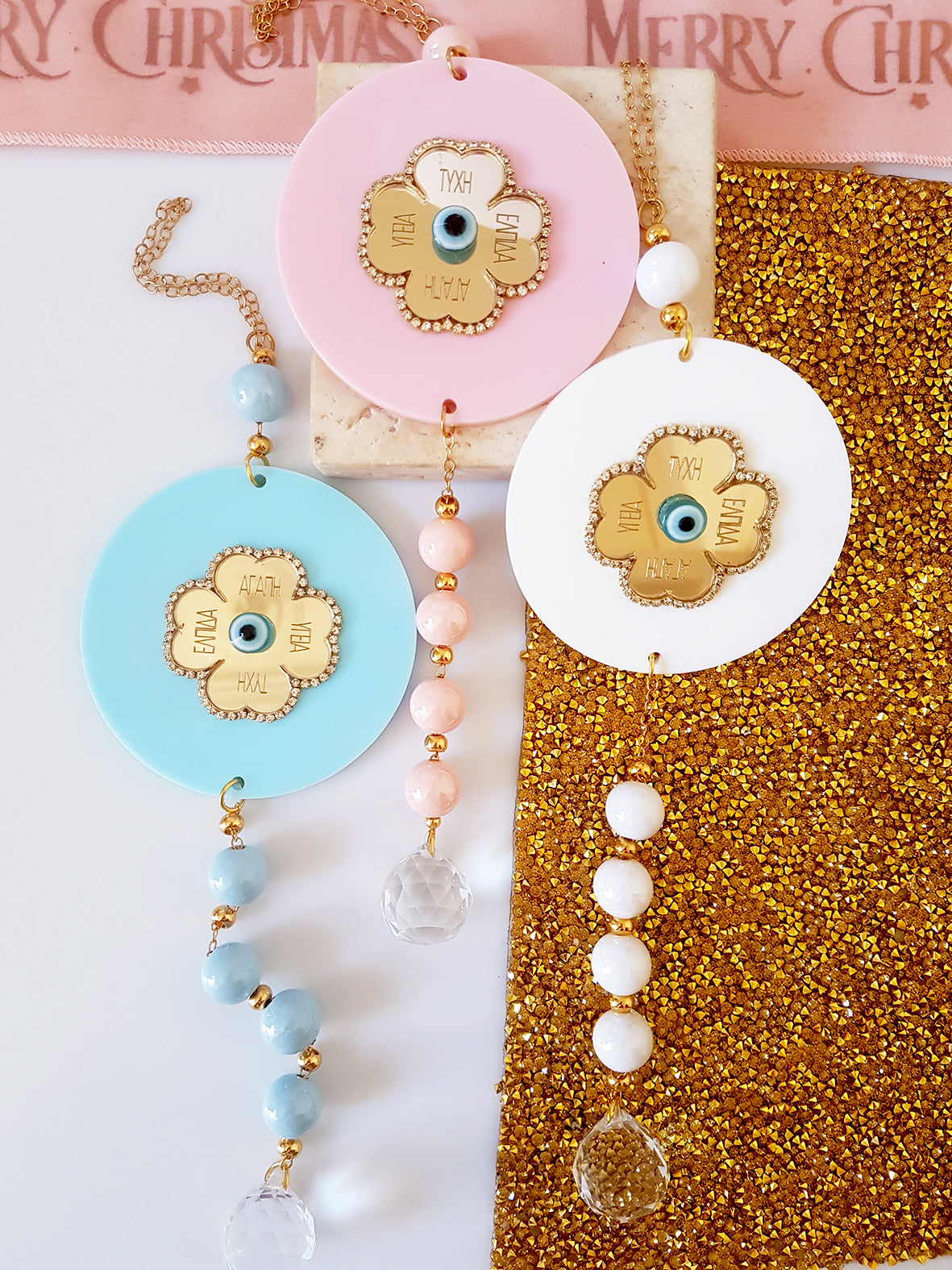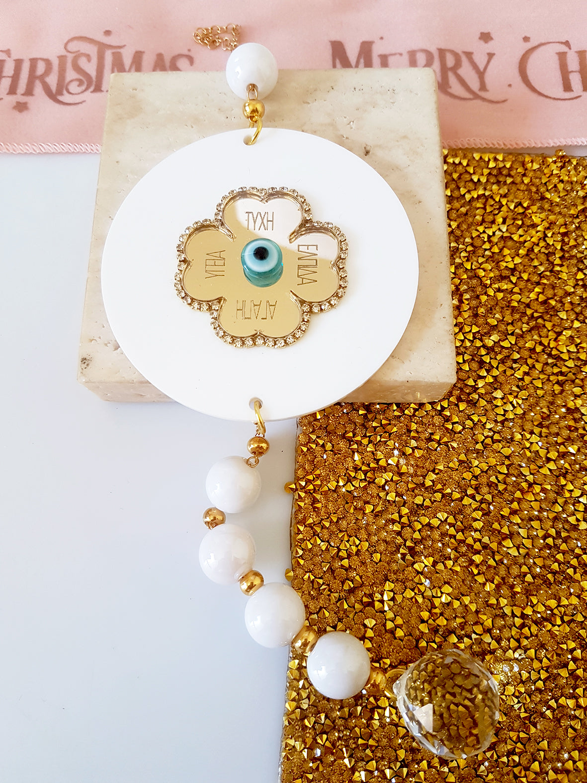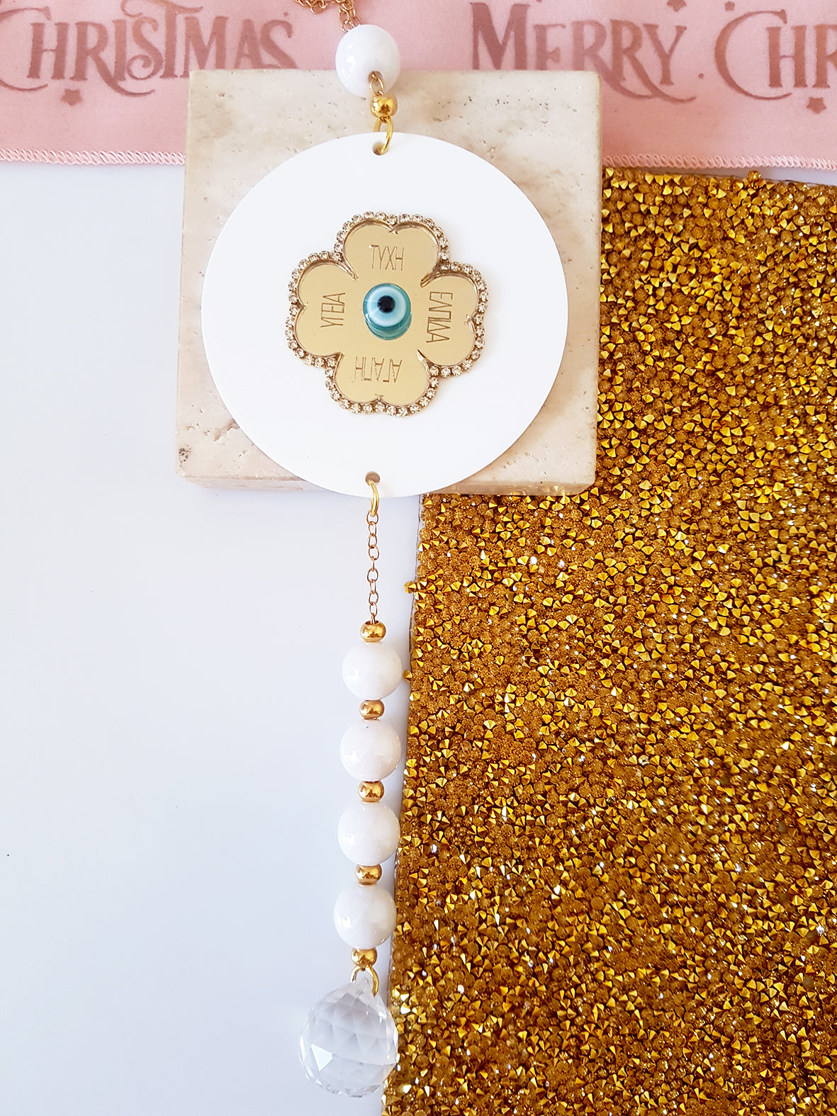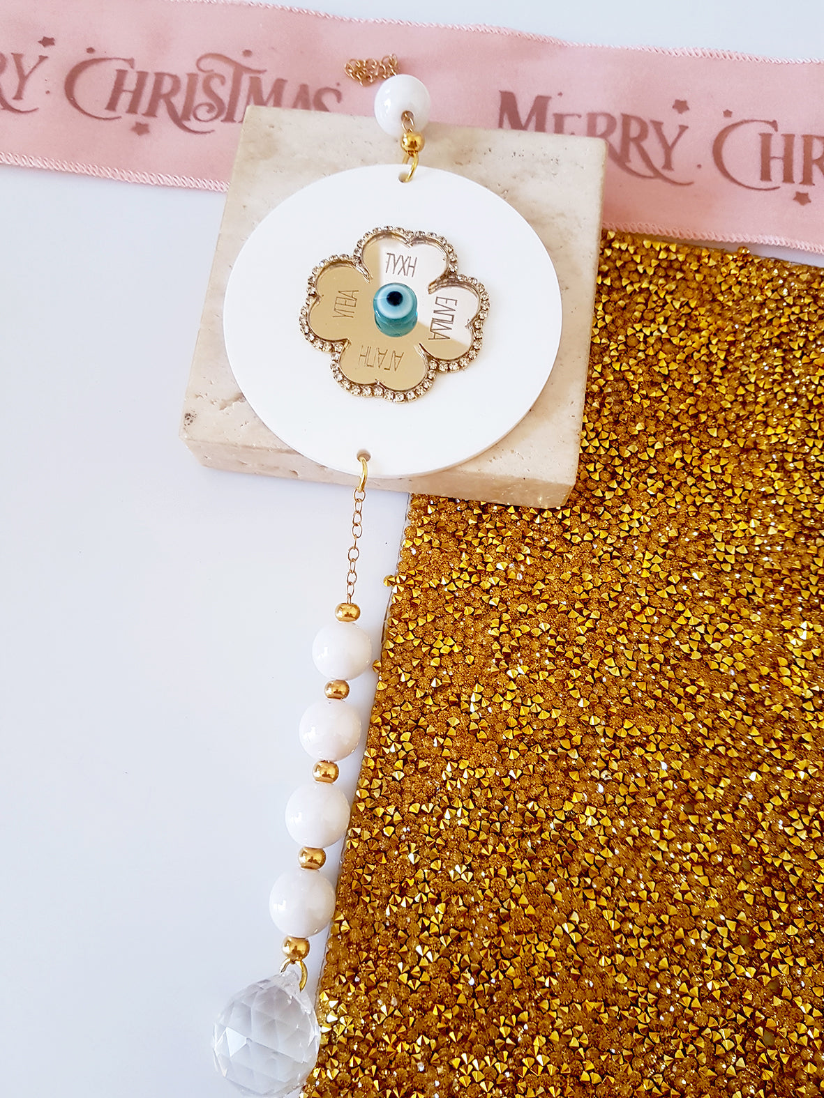 Χειροποίητο κρεμαστό γούρι από την Elegant συλλογή μας, ατσάλινη αλυσίδα, τετράφυλλο τριφύλλι από πλεξιγκλάς καθρέφτη με χάραξη ευχές, ματάκι και περίγραμμα από στρας, σε στρογγυλή πλεξιγκλάς βάση με κρεμαστές χάντρες και κρύσταλλο.