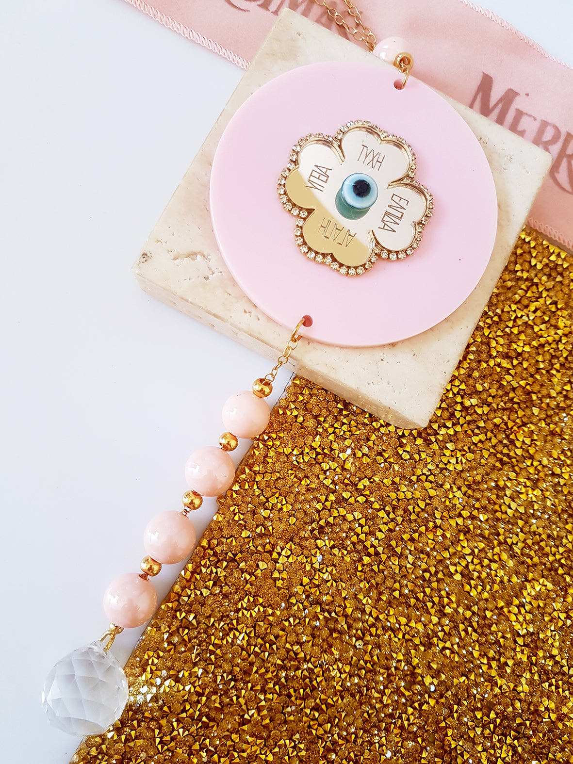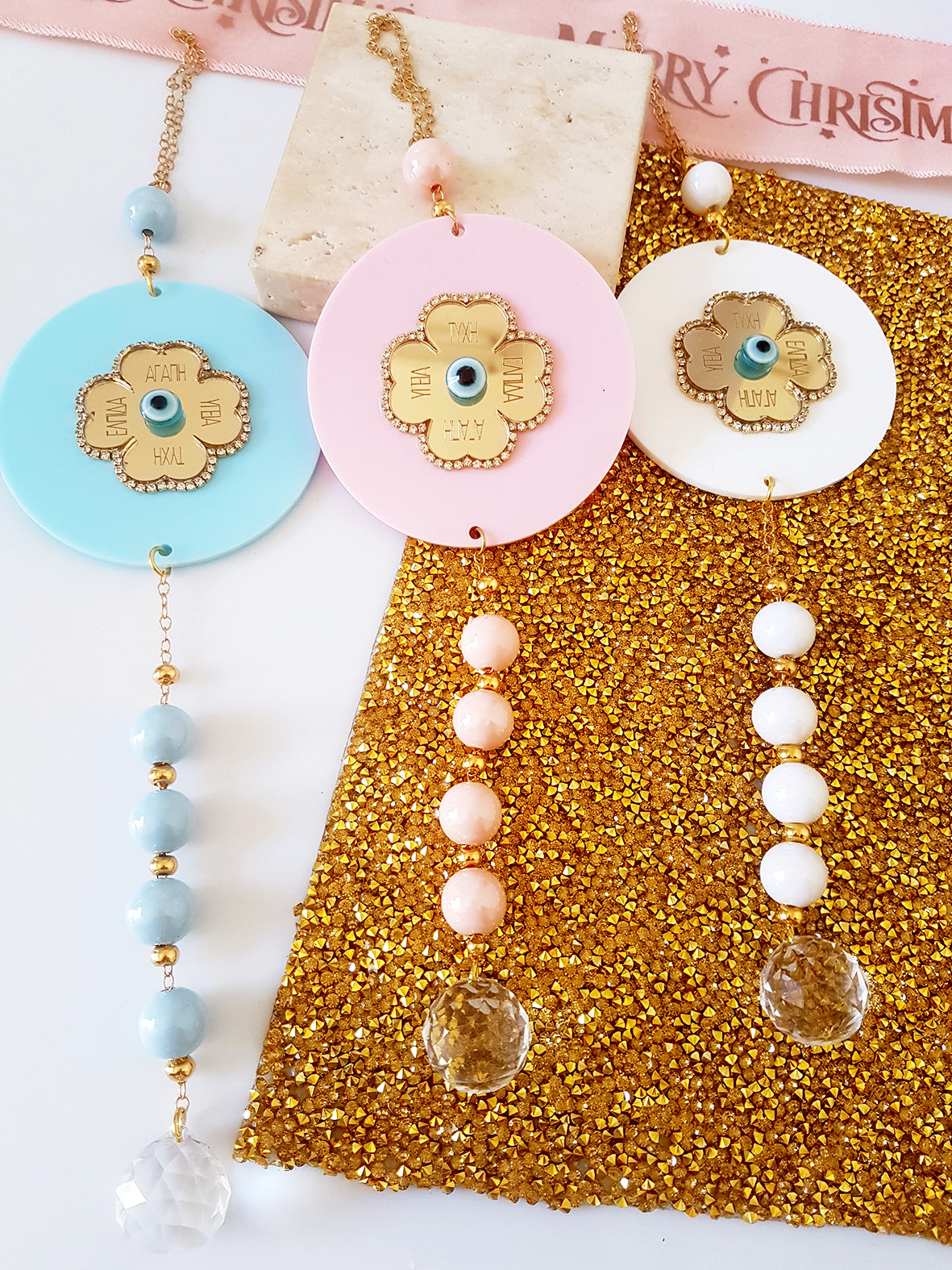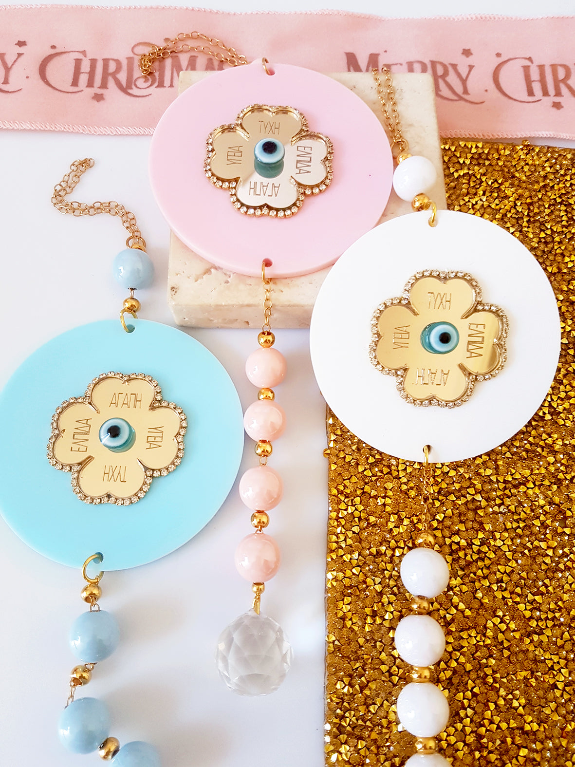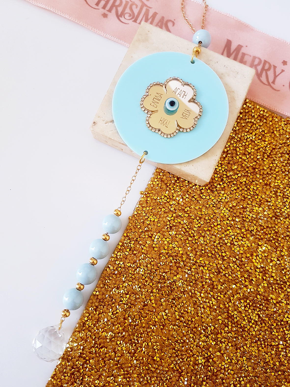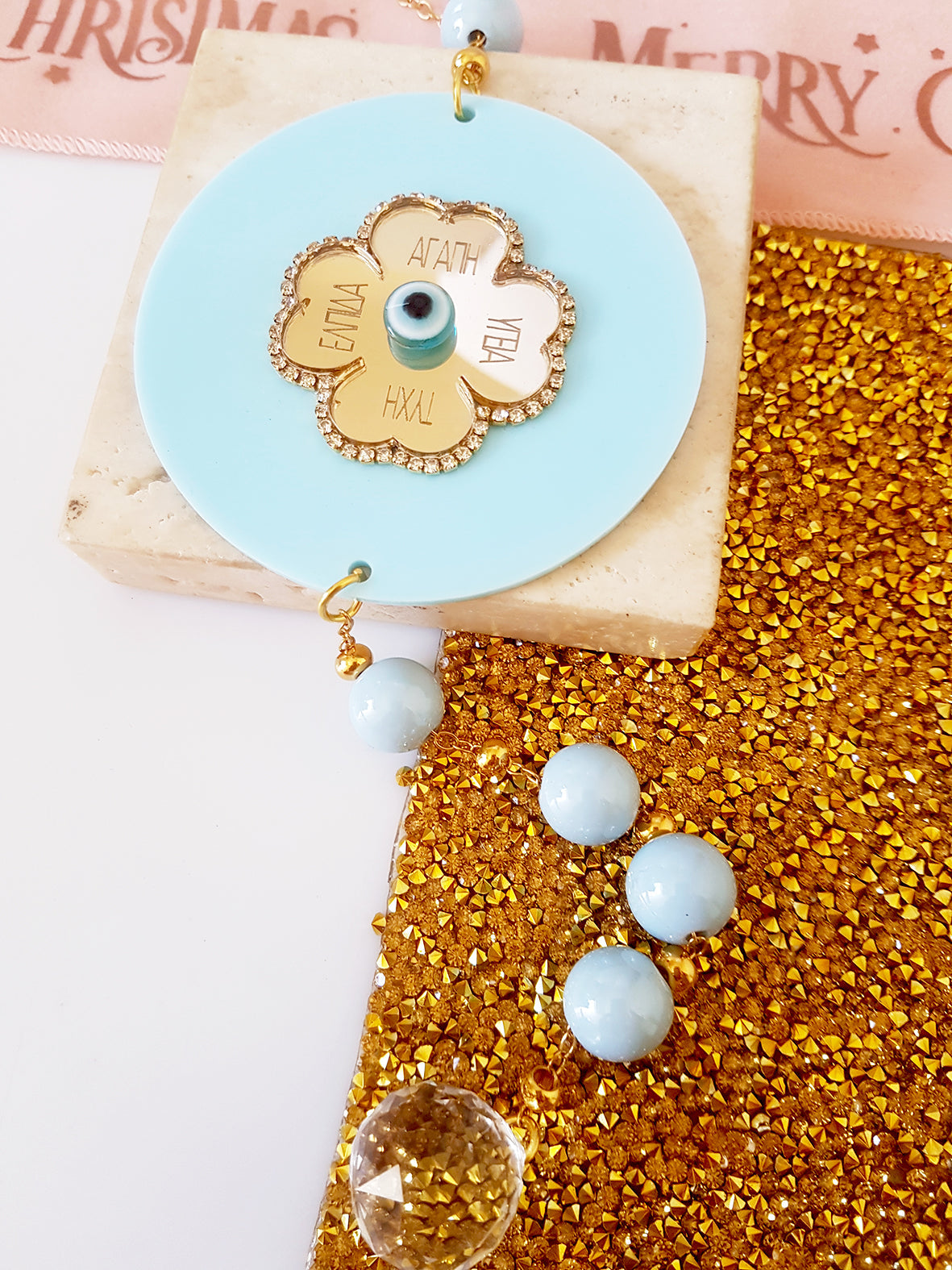 Χειροποίητο κρεμαστό γούρι από την Elegant συλλογή μας, ατσάλινη αλυσίδα, τετράφυλλο τριφύλλι από πλεξιγκλάς καθρέφτη με χάραξη ευχές, ματάκι και περίγραμμα από στρας, σε στρογγυλή πλεξιγκλάς βάση με κρεμαστές χάντρες και κρύσταλλο.