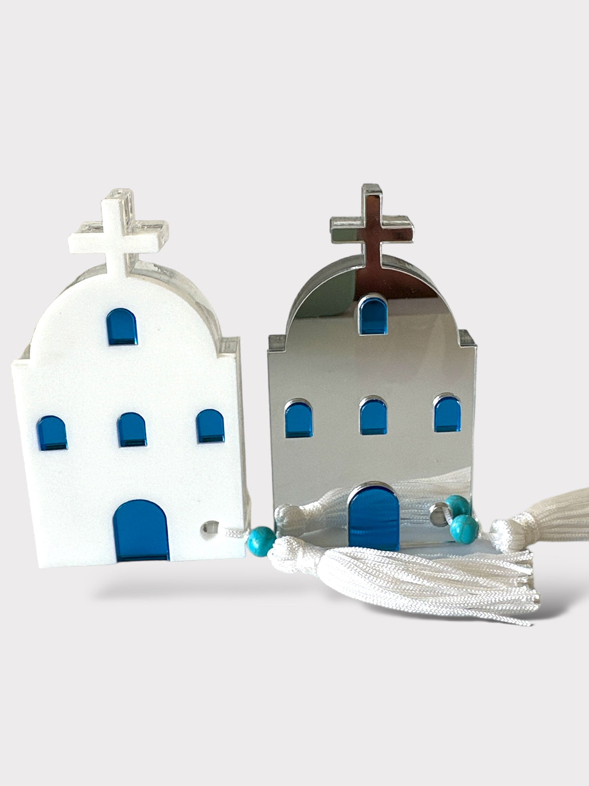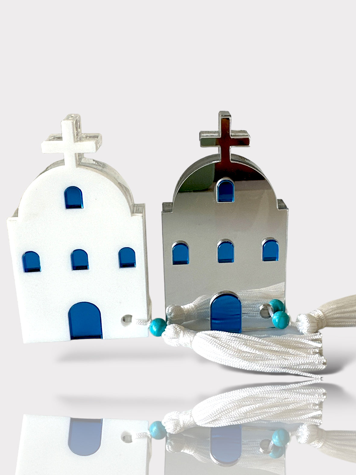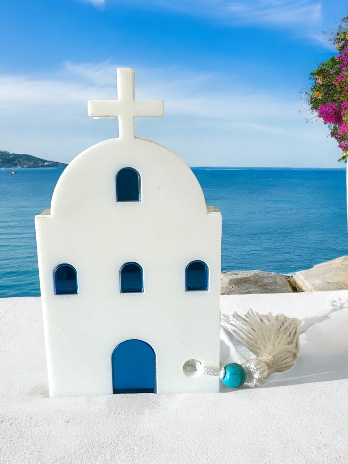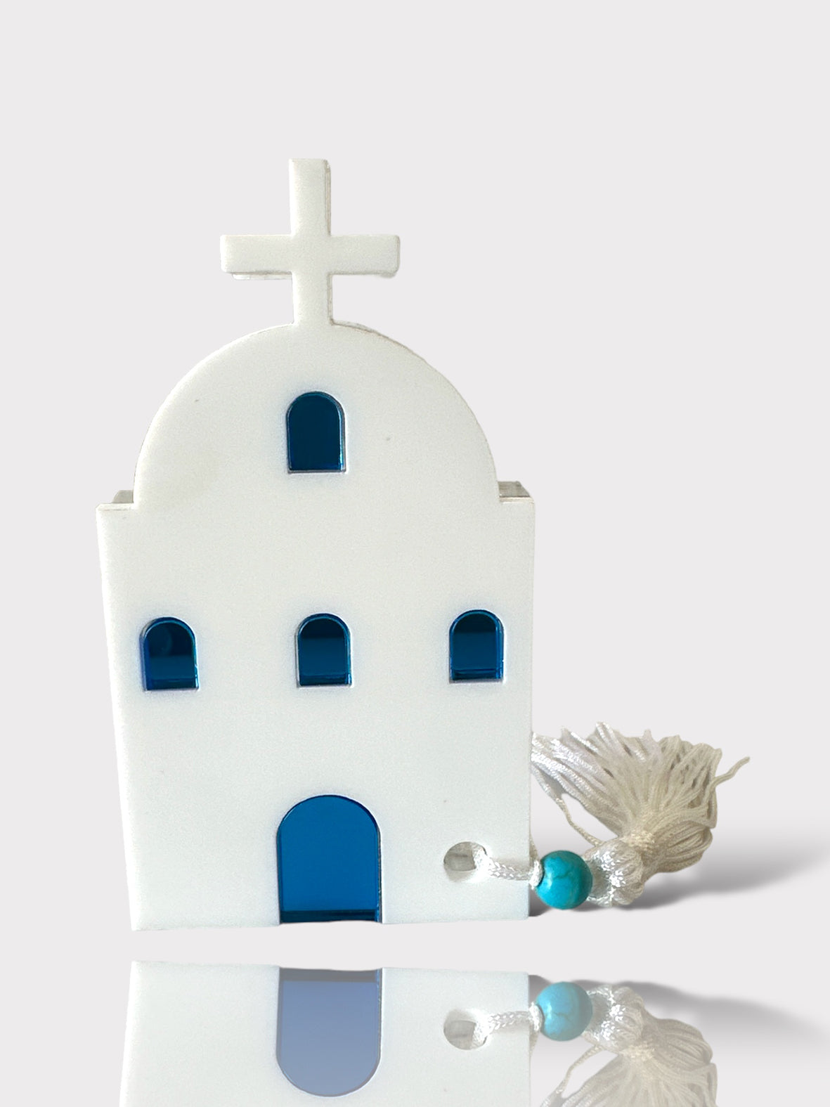 Χειροποίητο επιτραπέζιο διακοσμητικό γούρι Εκκλησάκι από πλεξιγκλάς με φούντα. Η πίσω πλευρά είναι ακριβώς ίδια με την μπροστινή.