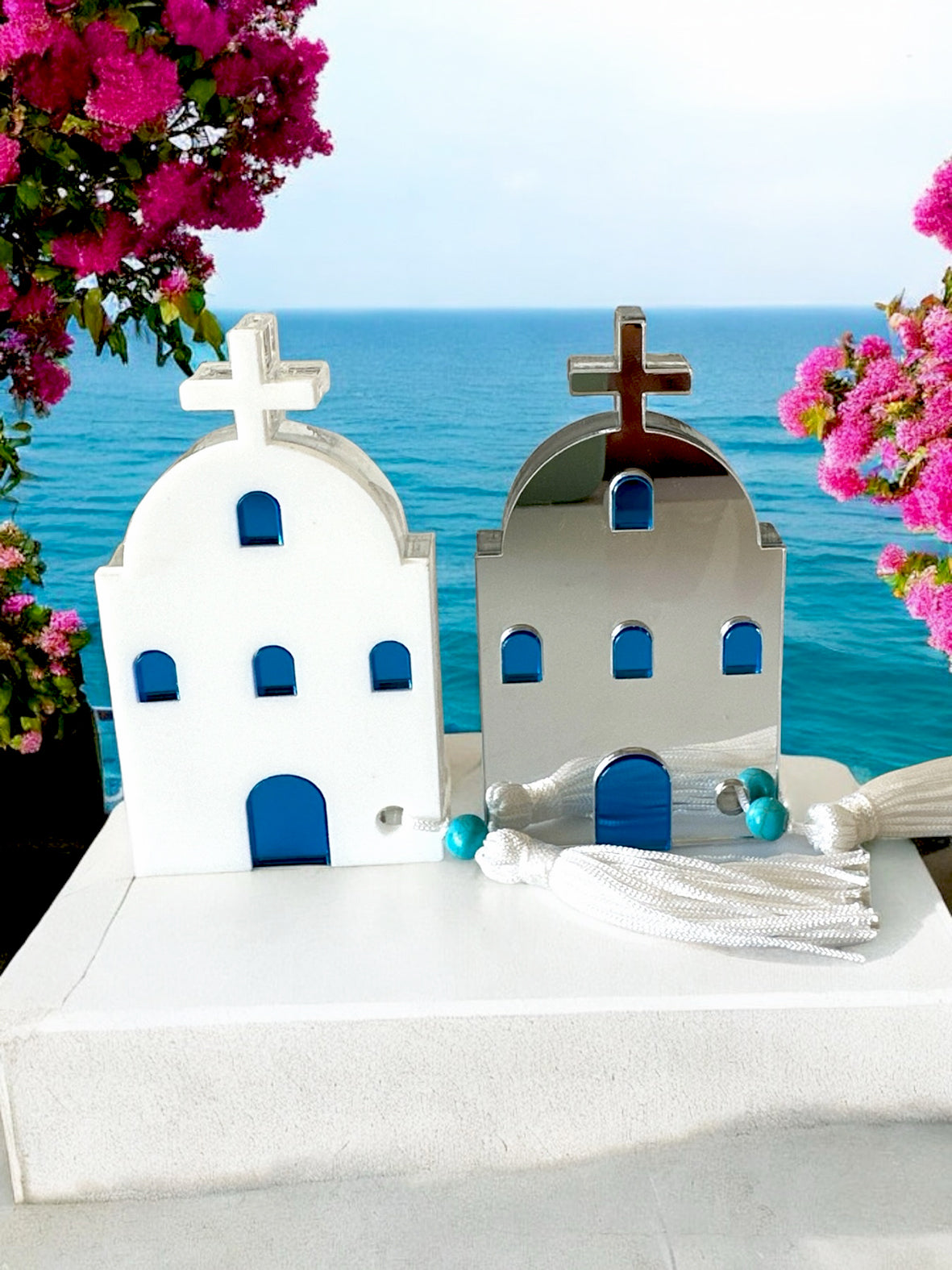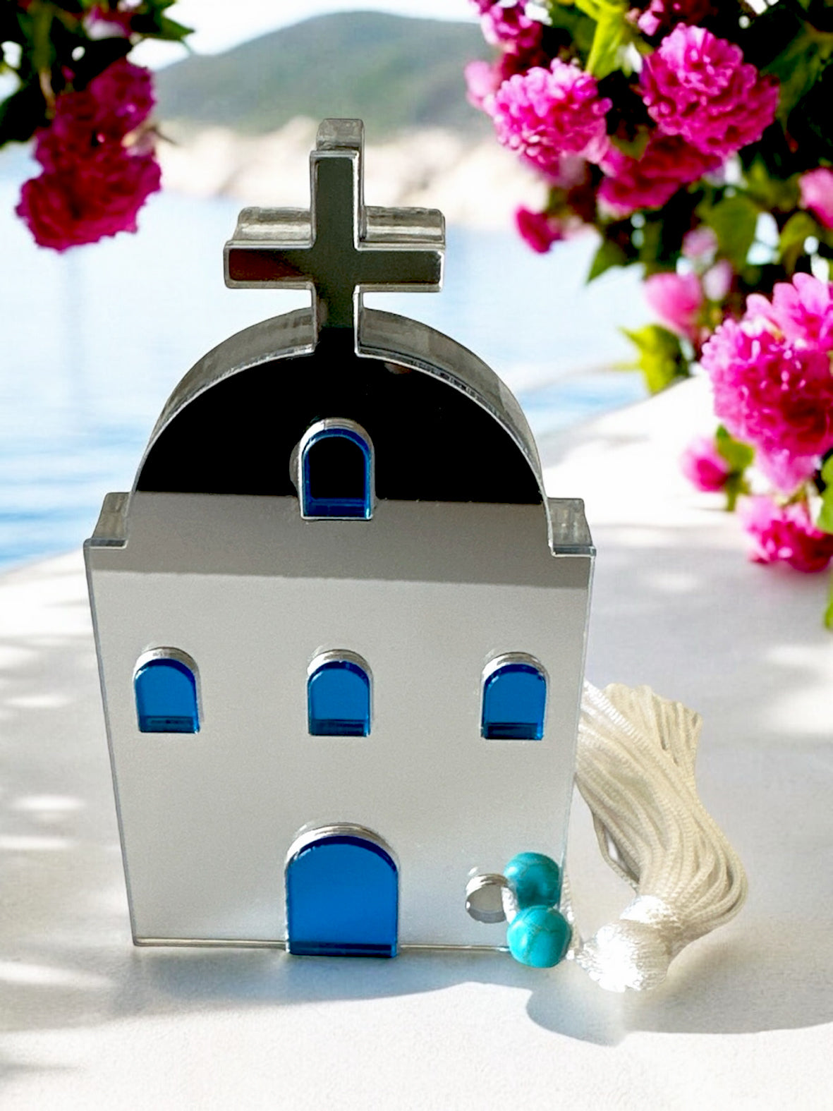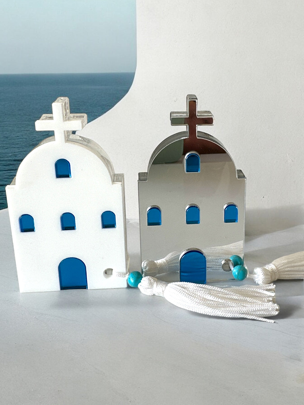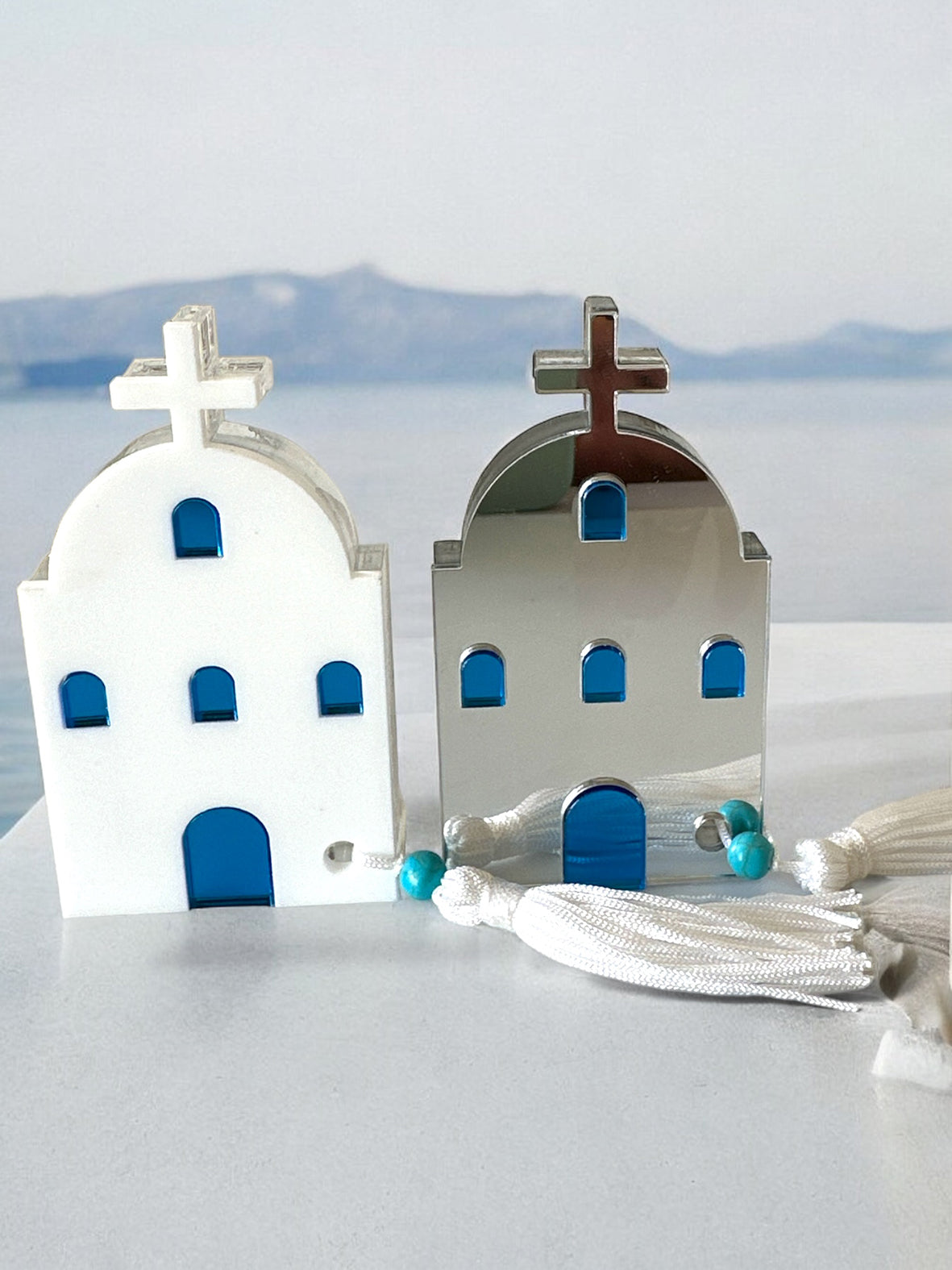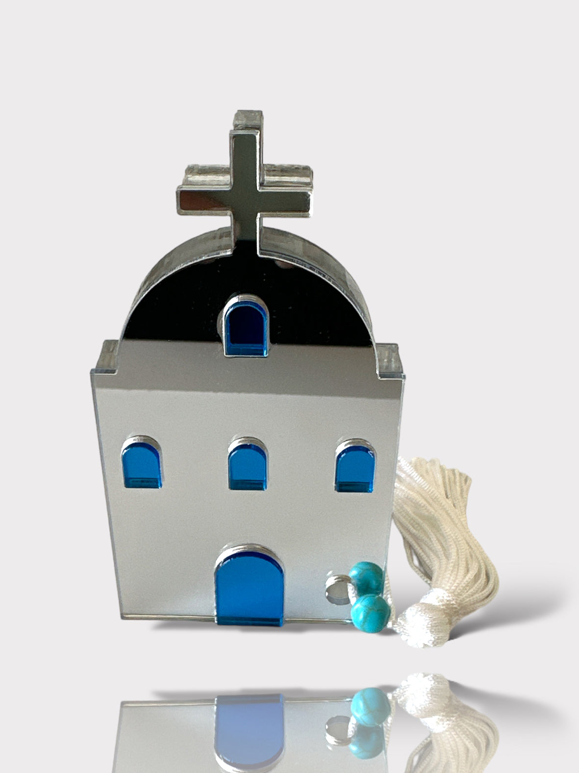 Χειροποίητο επιτραπέζιο διακοσμητικό γούρι Εκκλησάκι από πλεξιγκλάς με φούντα. Η πίσω πλευρά είναι ακριβώς ίδια με την μπροστινή.