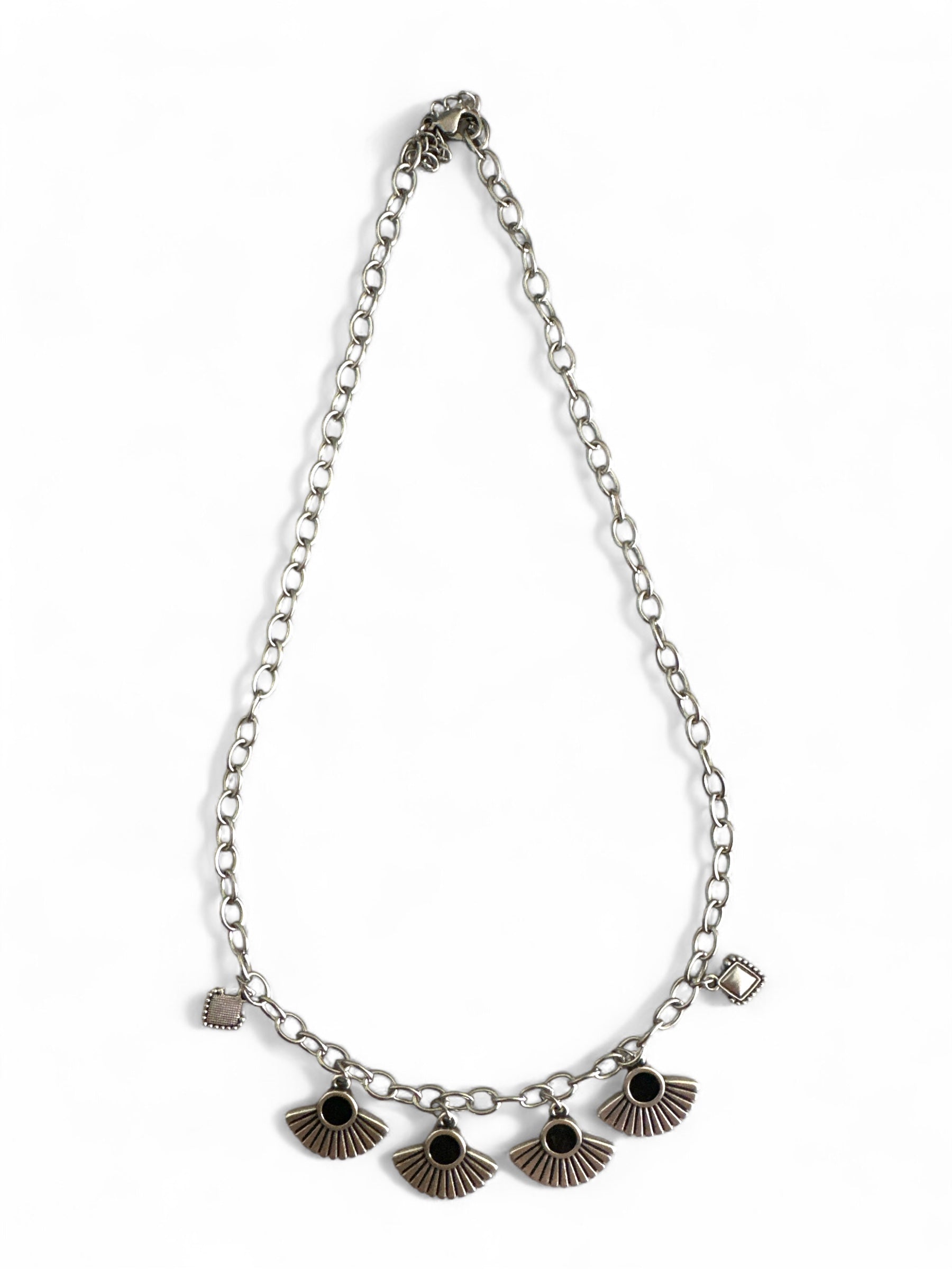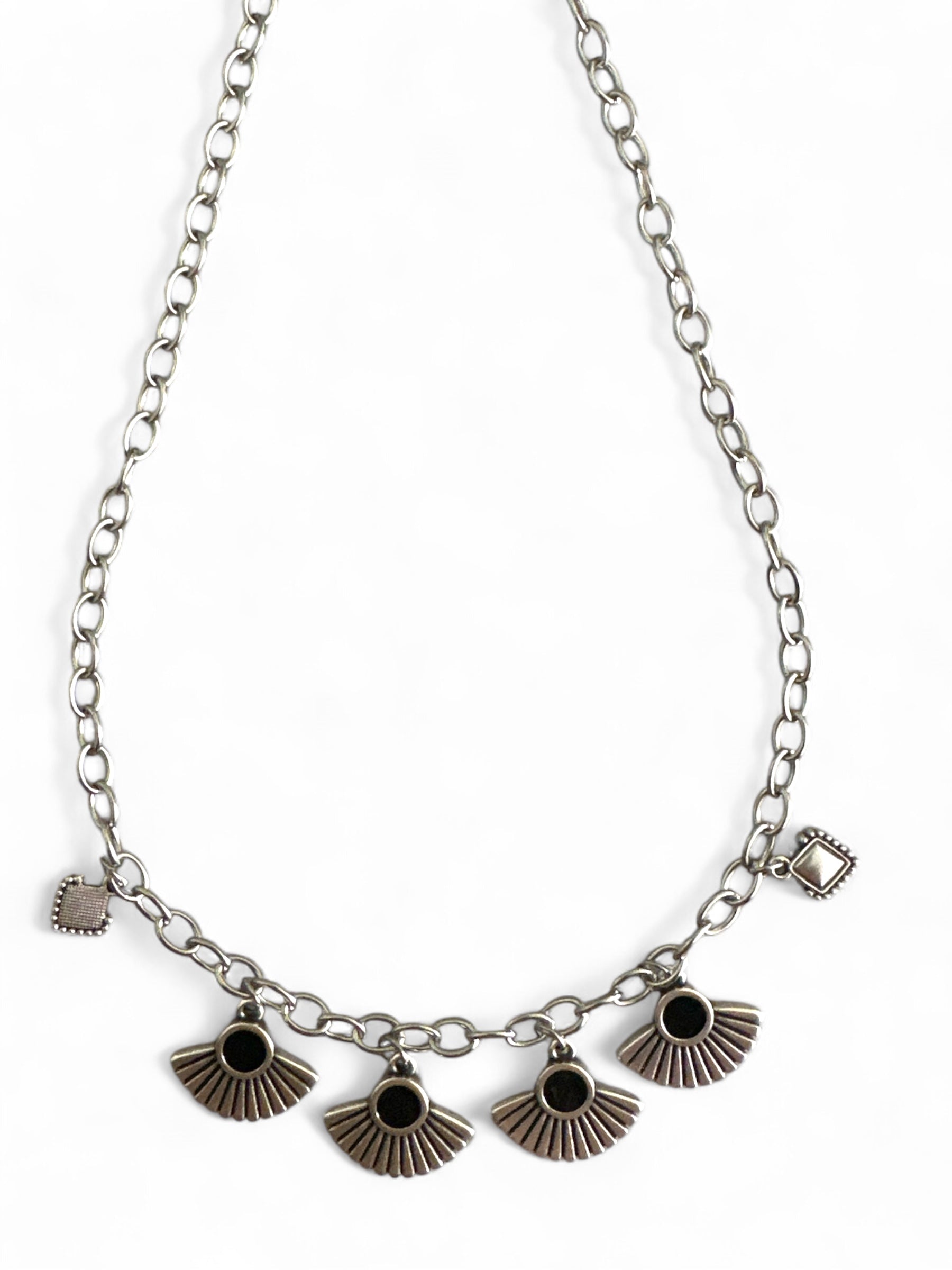 Εντυπωσιακό ατσάλινο κολιέ με μοναδικό σχεδιασμό. Διακοσμημένο με επάργυρα στοιχεία σε σχήμα βεντάλιας και τετράγωνα charms, με μαύρο σμάλτο για ιδιαίτερη αντίθεση και κομψότητα. Ιδανικό για να προσθέσει χαρακτήρα σε κάθε εμφάνιση.