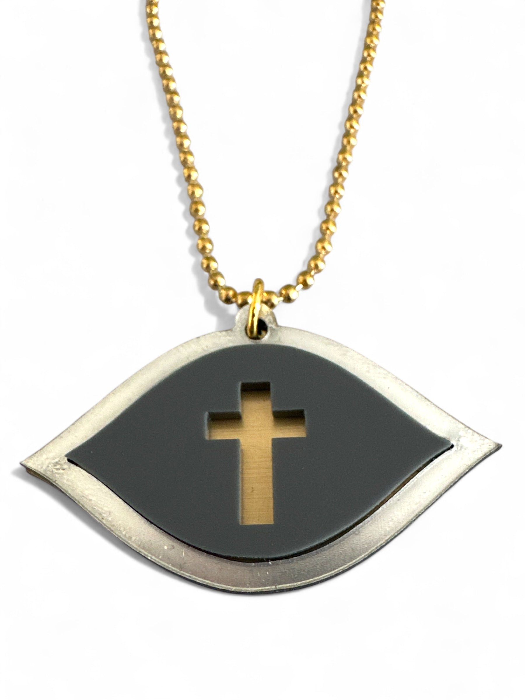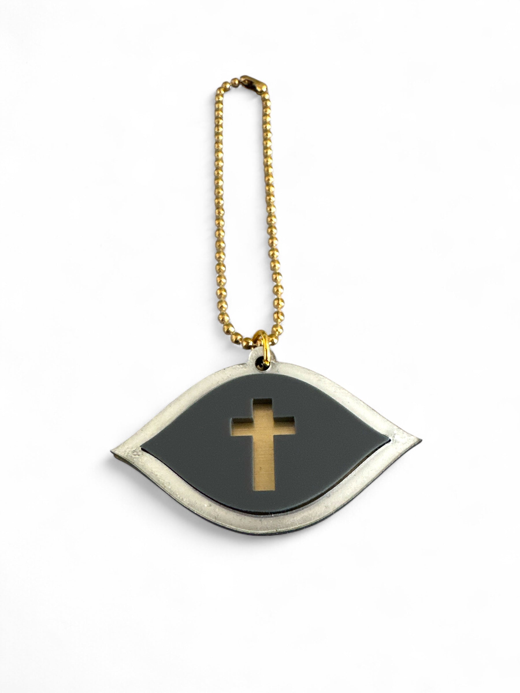 Αυτό το κομμάτι είναι για εκείνους που θέλουν τα πάντα, αλλά σε σωστή δόση. Σχήμα ματιού, χρώματα μίνιμαλ (ασημί, γκρι σκούρο), και στο κέντρο ένας διακριτικός, χρυσαφένιος σταυρός που “δένει” σαν κοσμηματική κόρη οφθαλμού. Ένα σύμβολο πίστης, προστασίας και αισθητικής ισορροπίας.