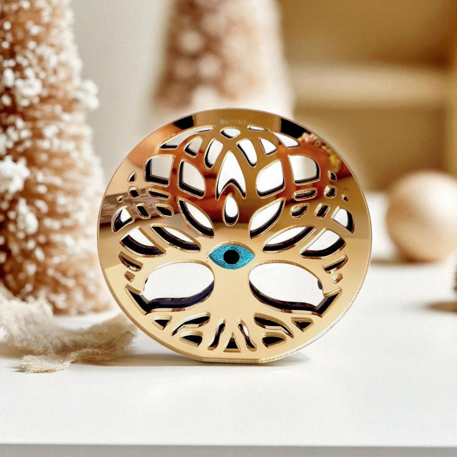Εντυπωσιακό χειροποίητο επιτραπέζιο γούρι χονδρικής σε στρογγυλό σχήμα, με δέντρο ζωής και μάτι στο κέντρο. Κατασκευασμένο από plexiglass καθρέφτη, αποτελεί ιδανική πρόταση για καταστήματα δώρων, εποχιακά καταστήματα και εταιρικά δώρα.