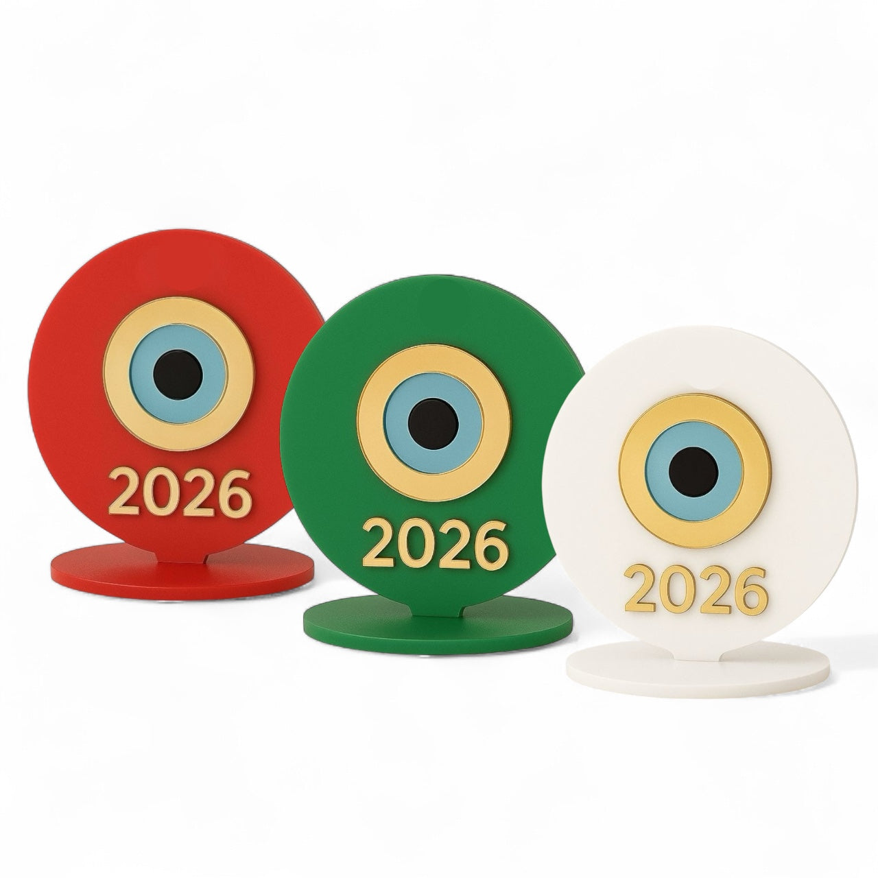 Minimal design με έντονο συμβολισμό προστασίας. Το γούρι είναι φτιαγμένο από plexiglass 3mm, με μάτι σε τρία επίπεδα (μπλε – χρυσός καθρέφτης – μαύρο) και καλαίσθητη χάραξη “2026” με laser. Ιδανικό για χριστουγεννιάτικες συλλογές, corporate gifting ή concept stores.