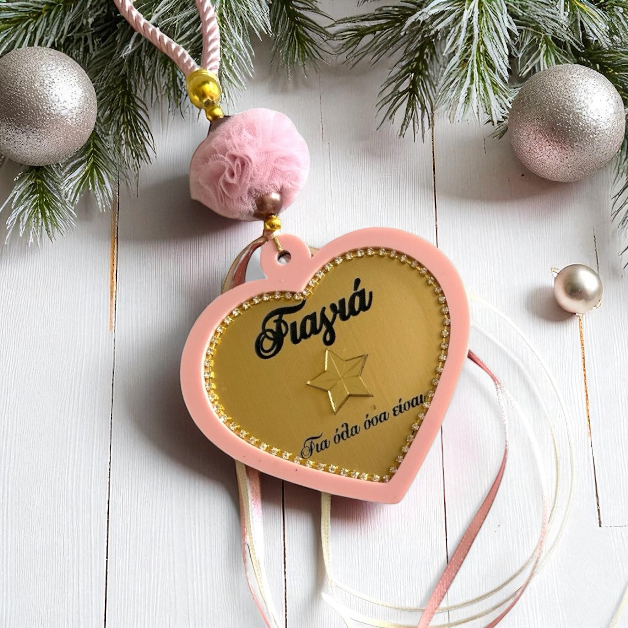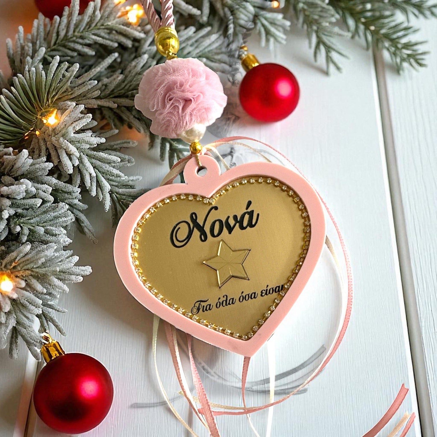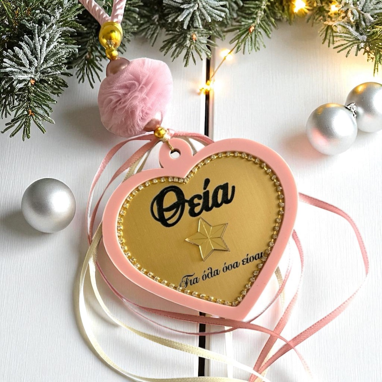 Το design συμπληρώνεται με σατέν κορδόνι, τουλίνο πον πον, πέρλες, κορδέλες και πίσω πλευρά με διακριτικό tag έτους.