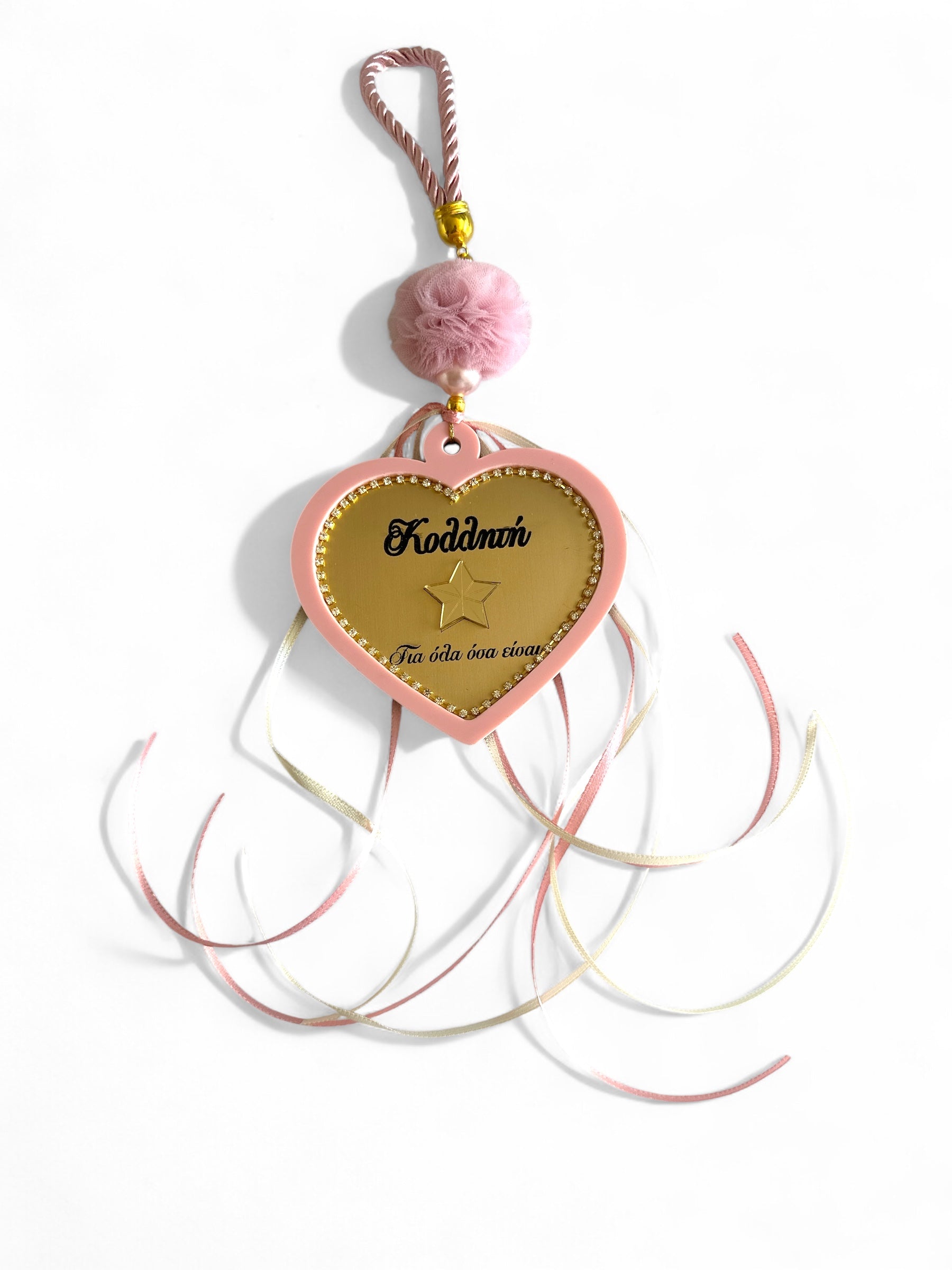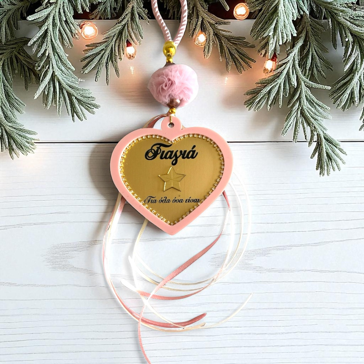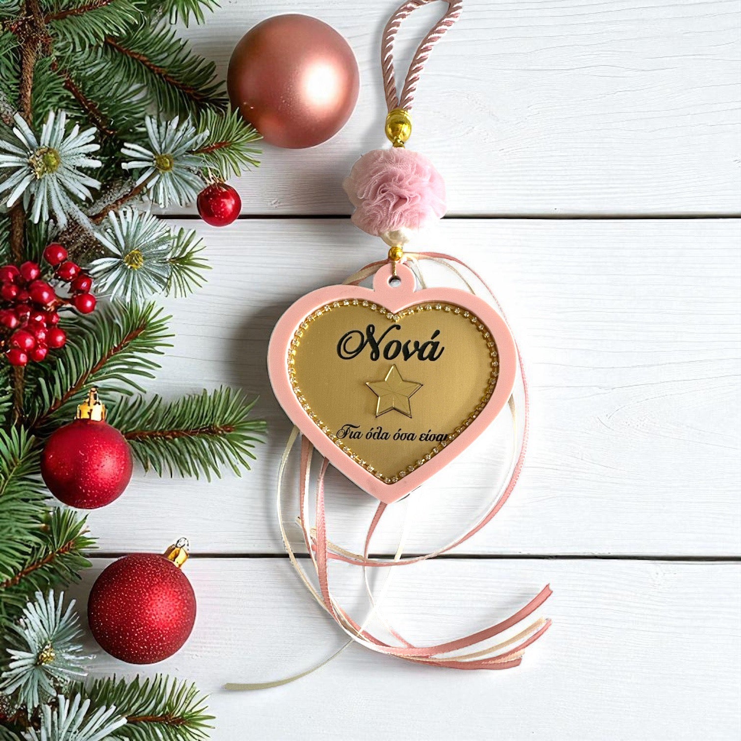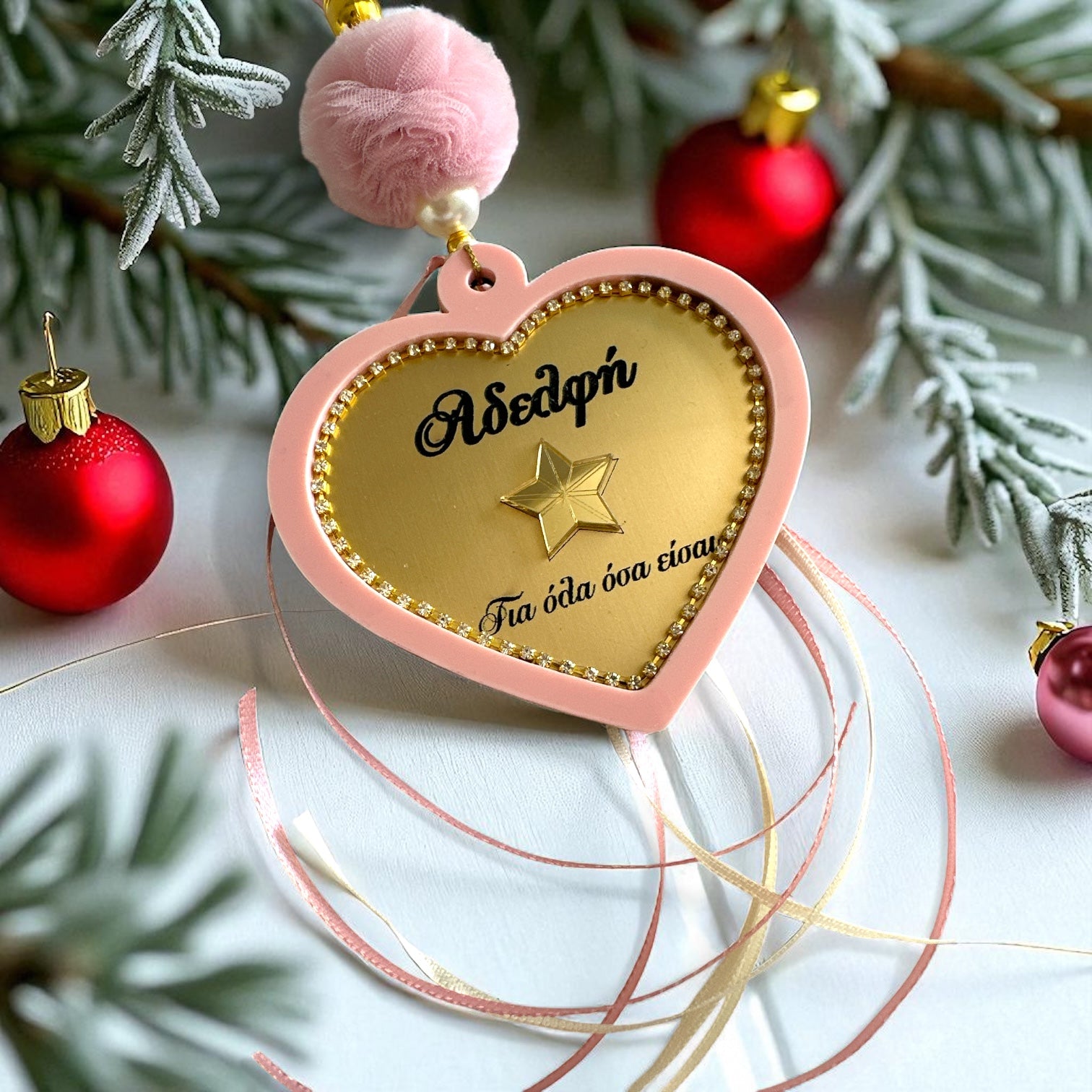 Το design συμπληρώνεται με σατέν κορδόνι, τουλίνο πον πον, πέρλες, κορδέλες και πίσω πλευρά με διακριτικό tag έτους.
