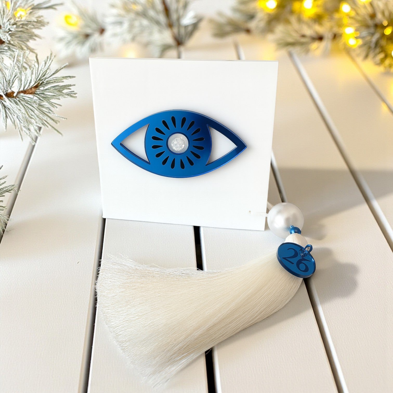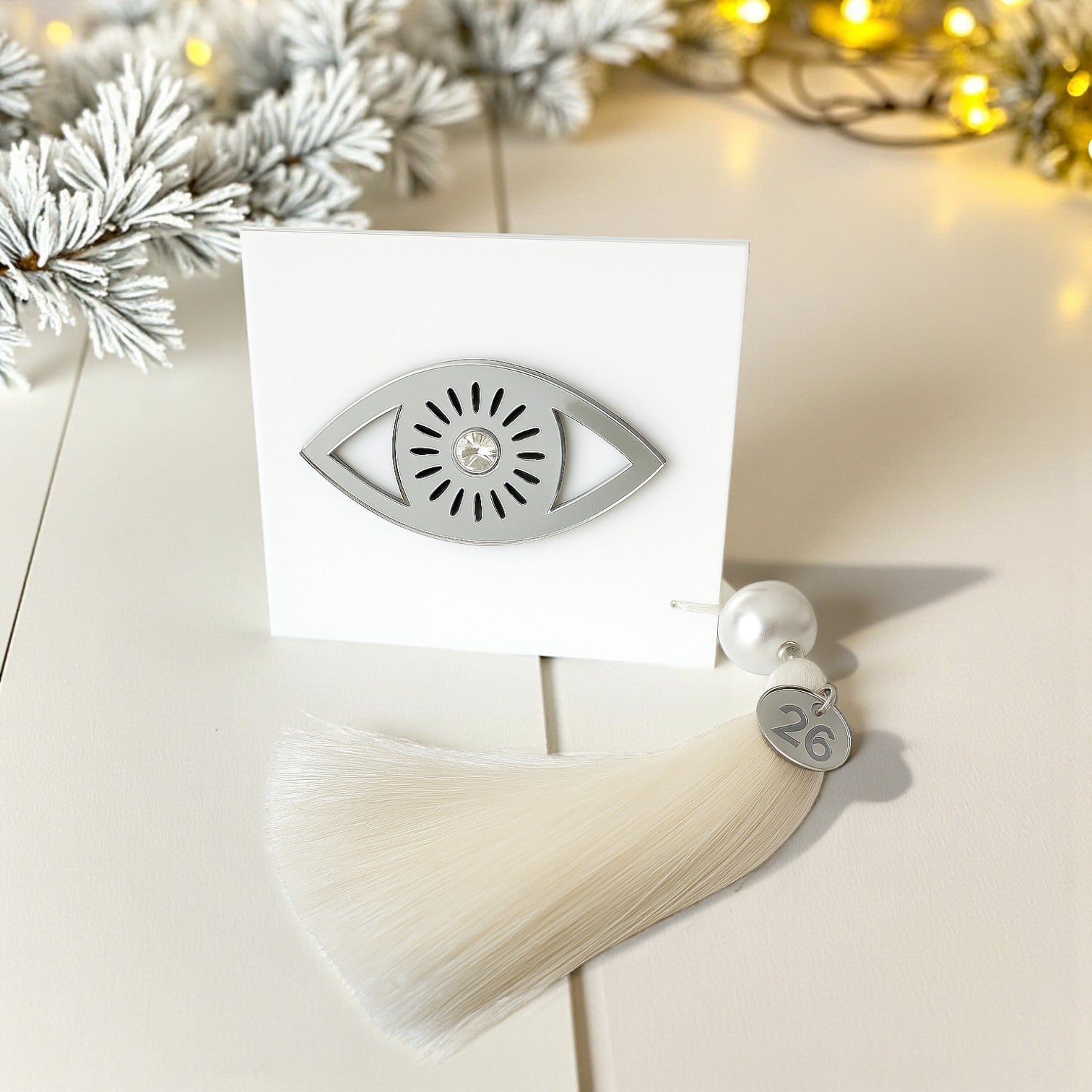 Χειροποίητο επιτραπέζιο γούρι σε τετράγωνη βάση από λευκό πλεξιγκλάς, με μάτι από χρυσό καθρέφτη και λαμπερή πέτρα στο κέντρο.
