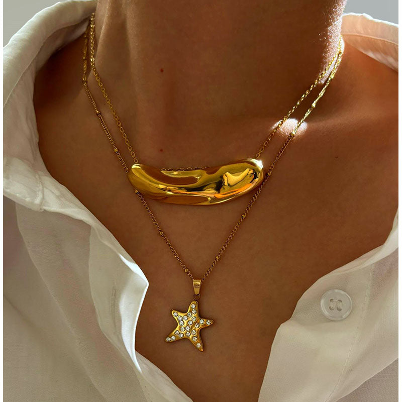 Ένα κολιέ που μοιάζει με μικρό γλυπτό. Το οργανικό του σχήμα και η έντονη λάμψη της επιχρύσωσης δημιουργούν ένα σύγχρονο κόσμημα με artistic χαρακτήρα. Ιδανικό για γυναίκες που θέλουν να δώσουν fashion-forward ύφος στα καθημερινά ή βραδινά τους outfits.