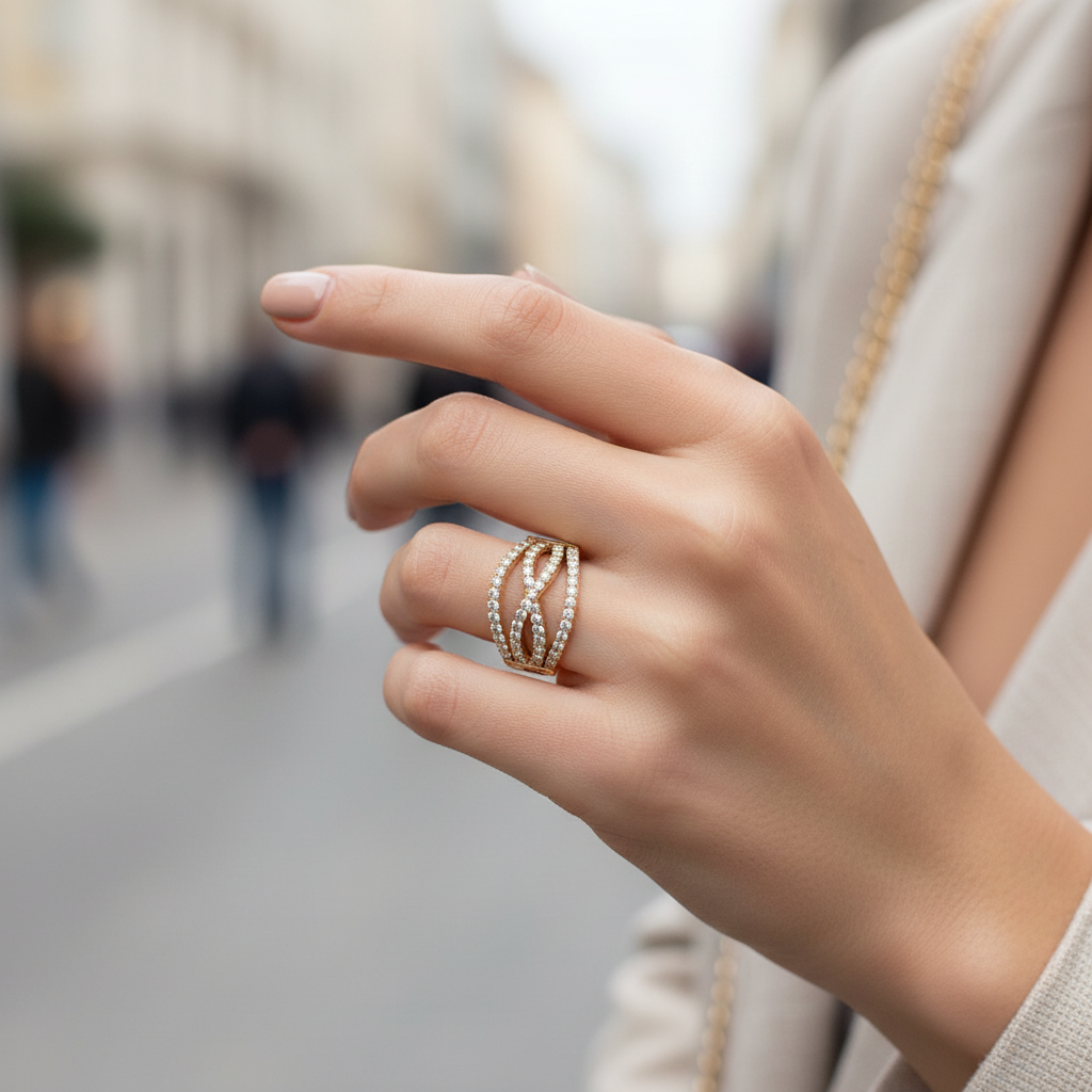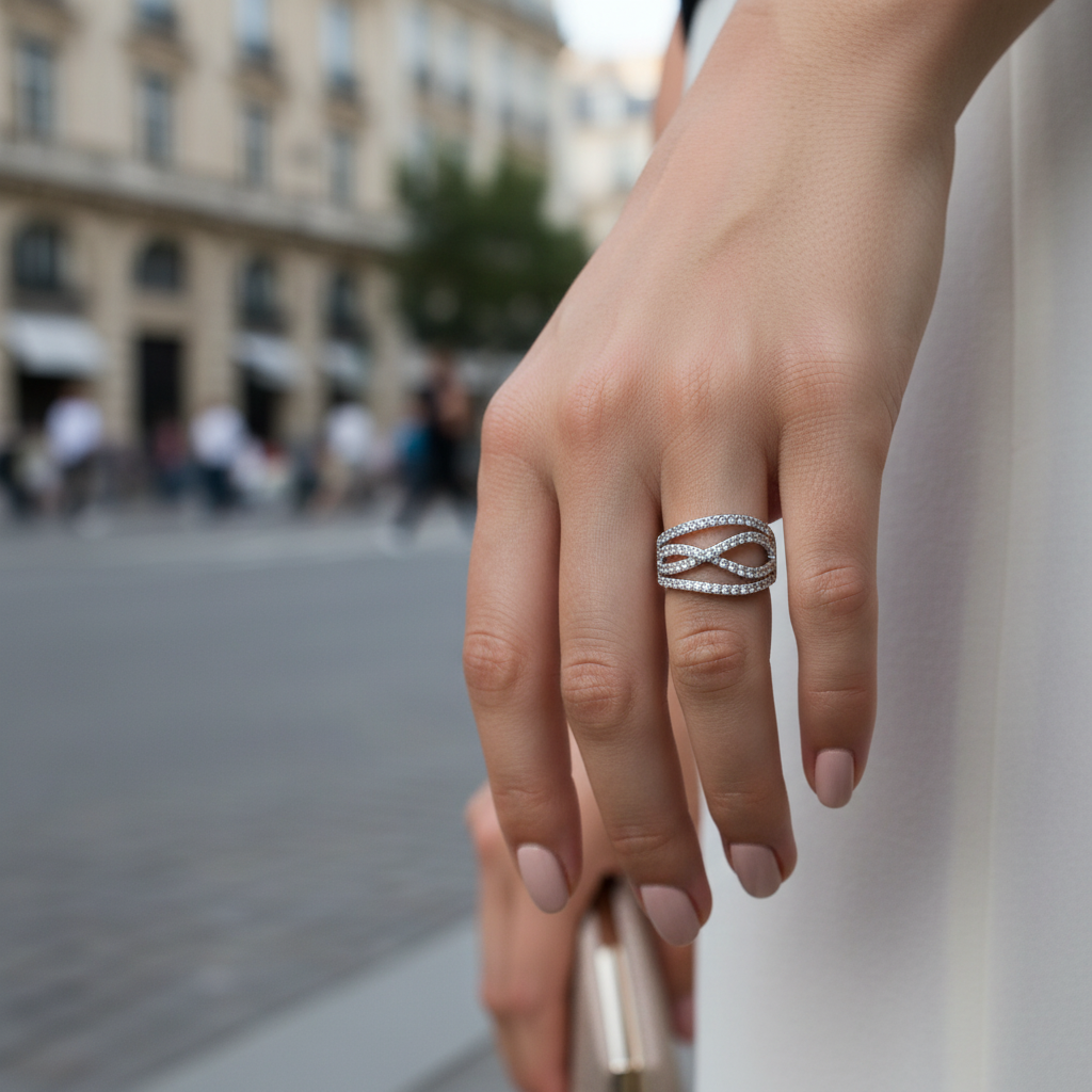 Ένα statement δαχτυλίδι που ακτινοβολεί λάμψη! Το “Infinity Glam” σχεδιάστηκε για γυναίκες που αγαπούν τη δυναμική εμφάνιση με κομψές γραμμές. Το κυματιστό σχέδιο θυμίζει το άπειρο, με τρεις παράλληλες σειρές από λαμπερά λευκά ζιργκόν που προσθέτουν αίσθηση πολυτέλειας και όγκου.