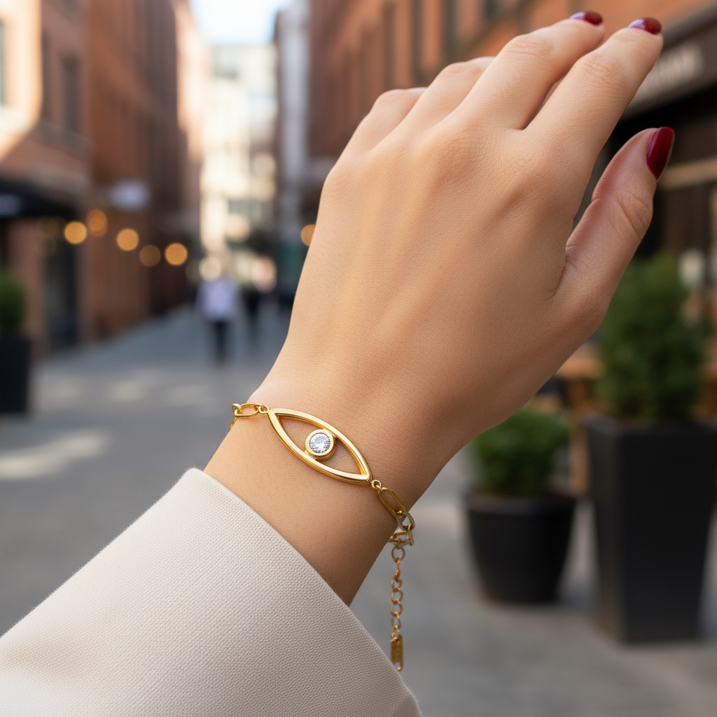 Ένα διαχρονικό φυλαχτό με σύγχρονη πολυτέλεια. Το βραχιόλι Iris επανασχεδιάζει το κλασικό “μάτι” με minimal γεωμετρικές γραμμές και λευκό ζιργκόν στο κέντρο. Κομψό και ευκολοφόρετο, είναι ιδανικό για καθημερινές εμφανίσεις αλλά και για gifting collections FW25/26.