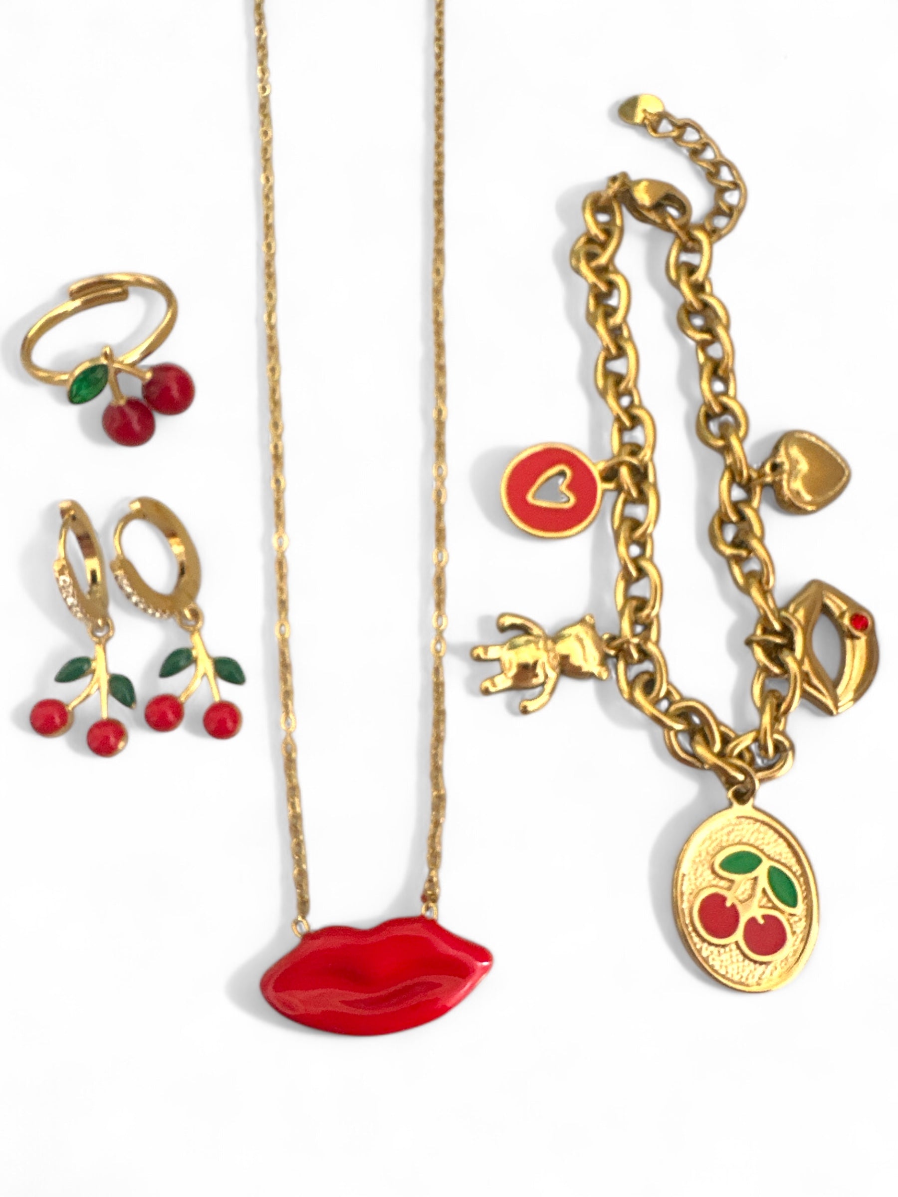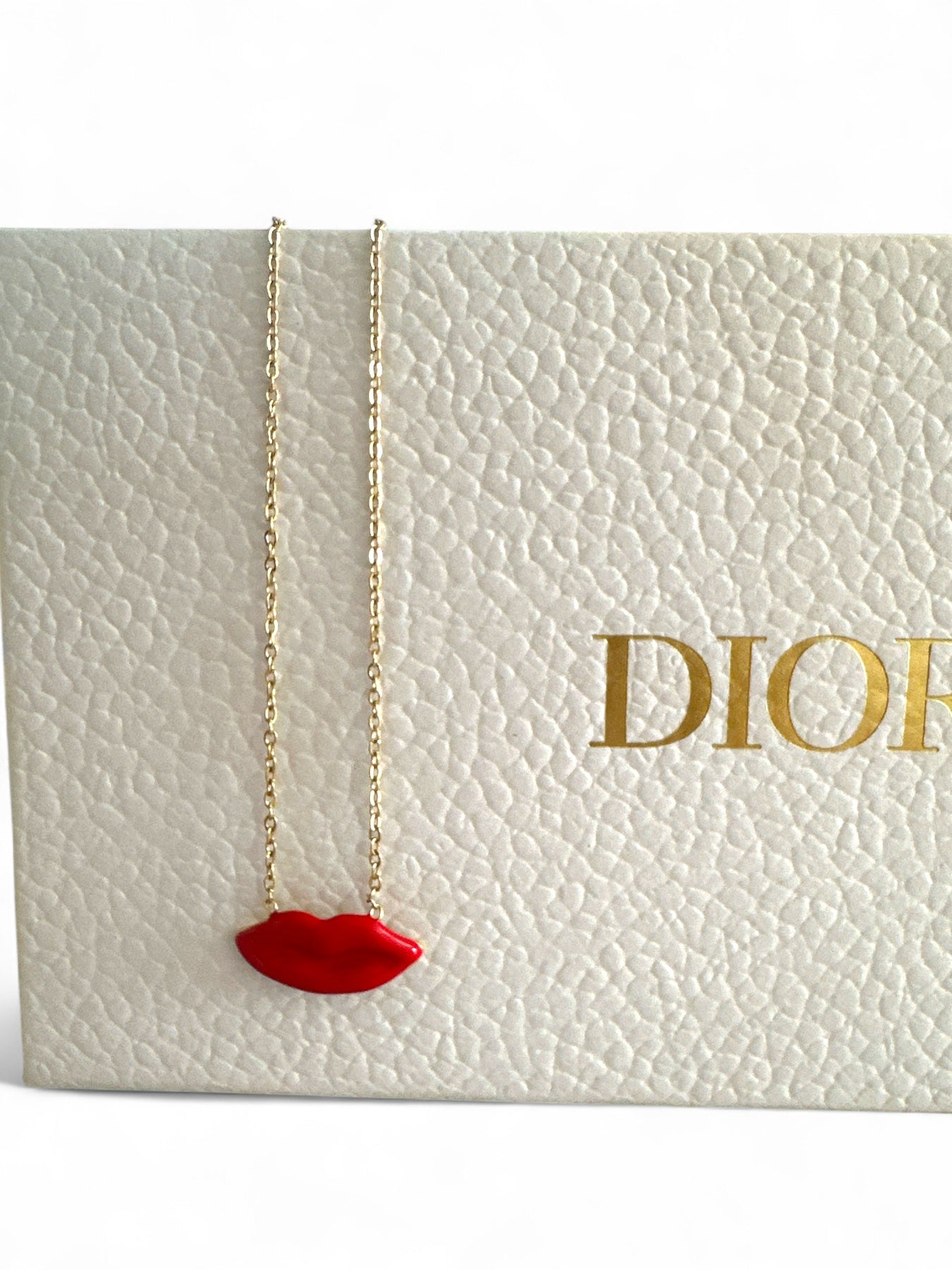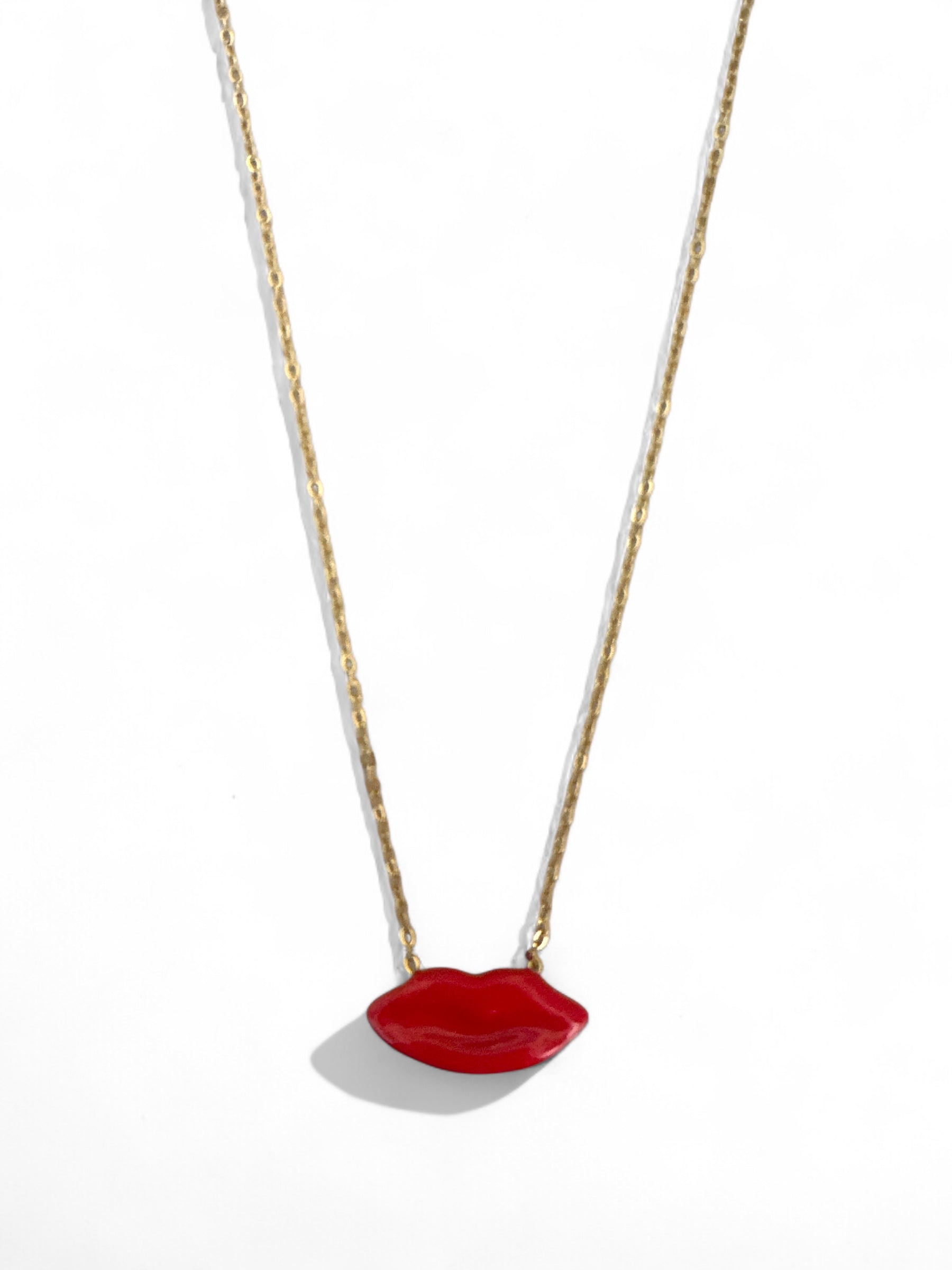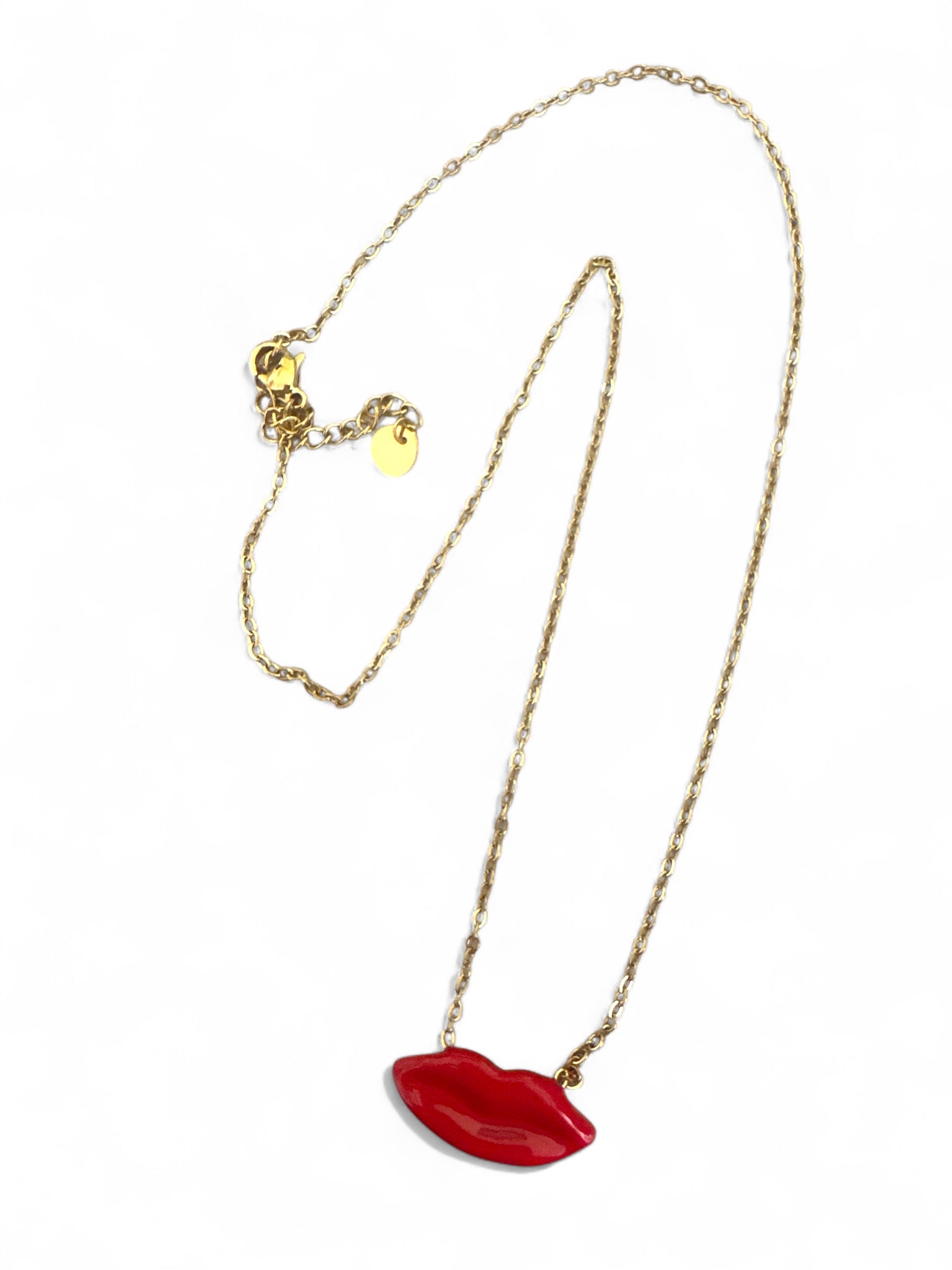 Κόκκινα χειλάκια σε enamel φινίρισμα κρέμονται παιχνιδιάρικα από χρυσή αλυσίδα από ανοξείδωτο ατσάλι — και σε προκαλούν να τους αντισταθείς.